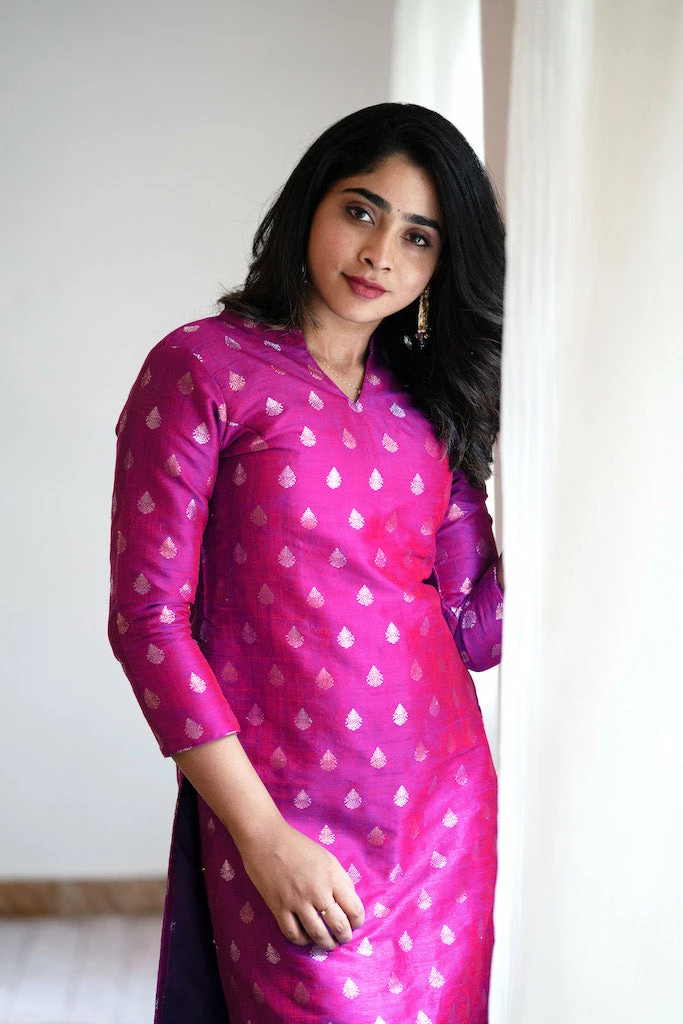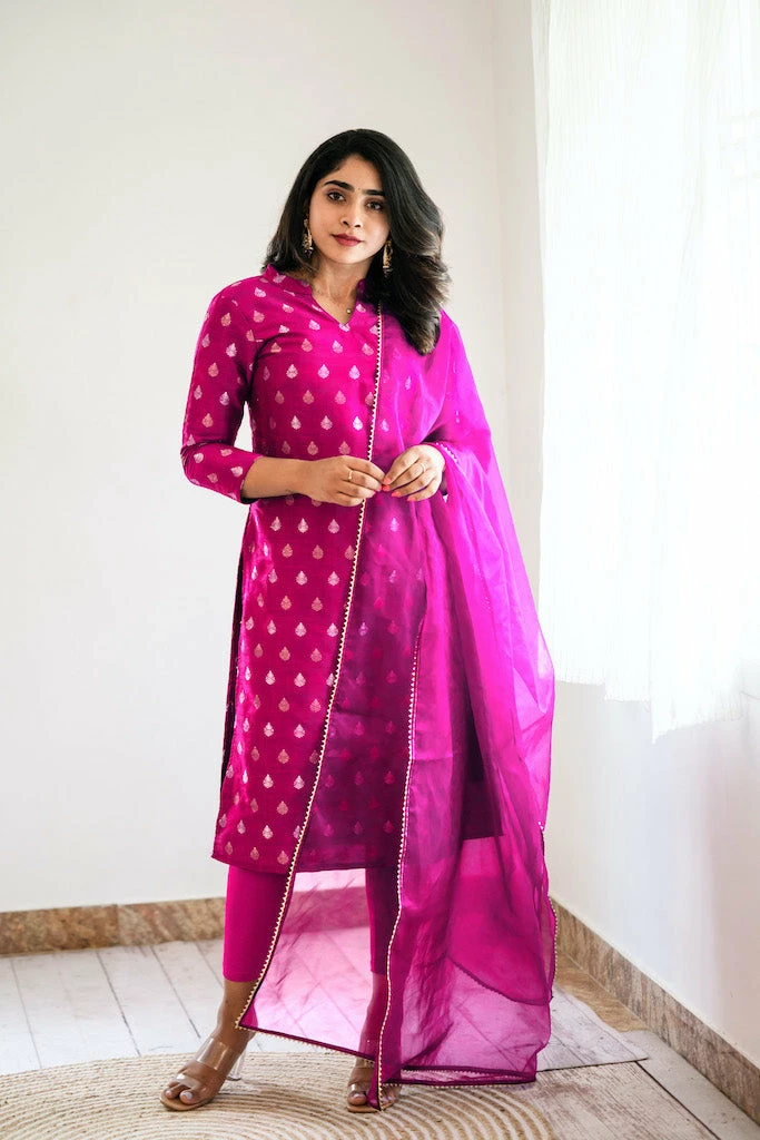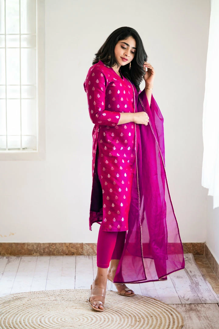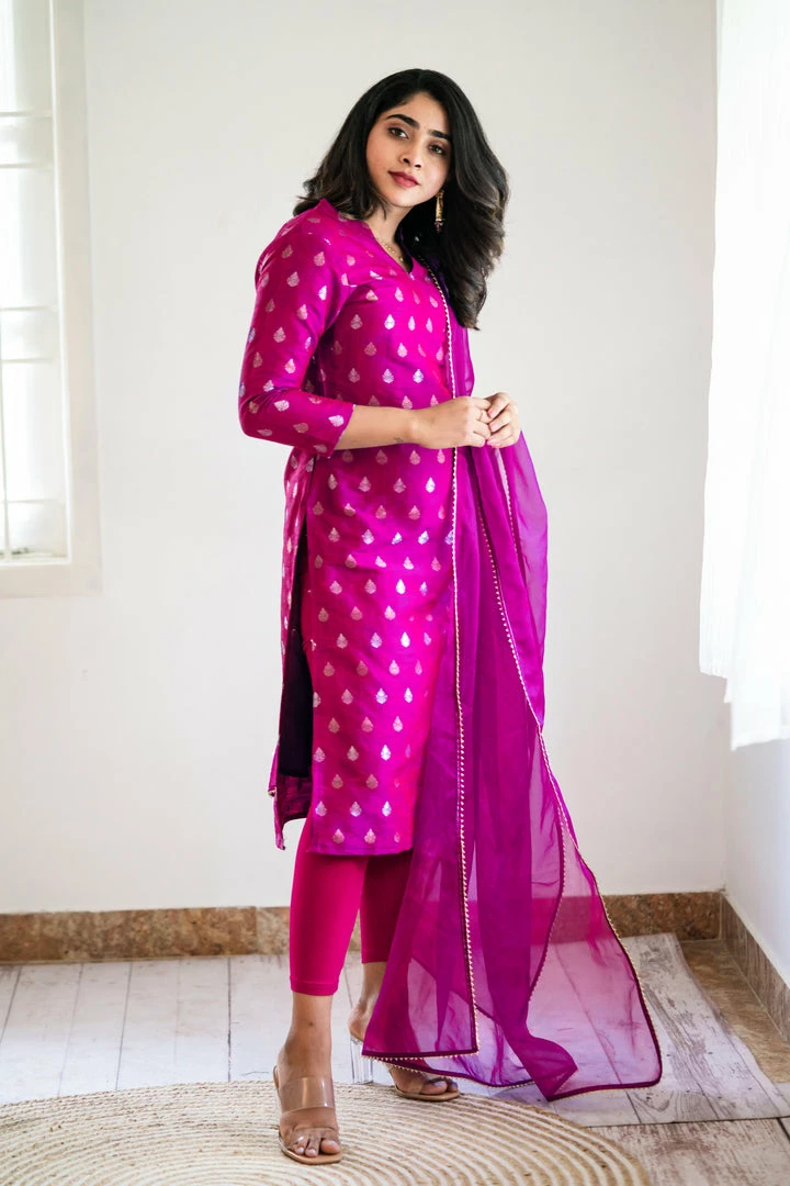 Our traditional semi raw silk brocade with double shade is a safe bet for a semi-formal outing.This raw silk kurti with soft organza dupatta rings the festive mood! (set of two top and dupatta)