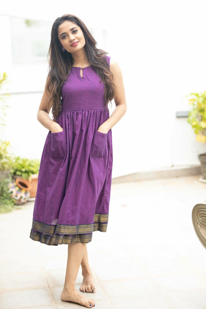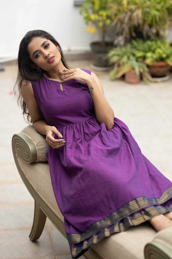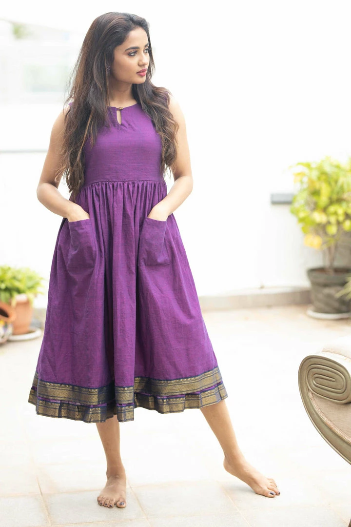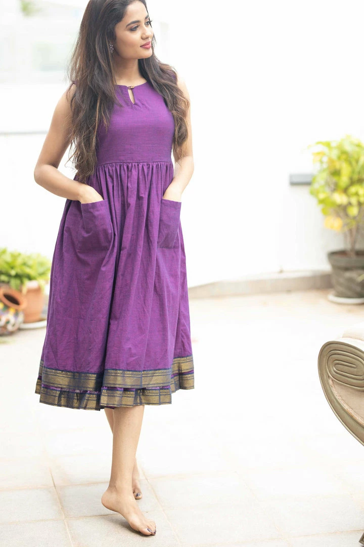 A Double Layered Mangalgiri Cotton Dress With Two Front Pockets ,a safe bet for a semi-formal outing.Sleeves can be included upon request.