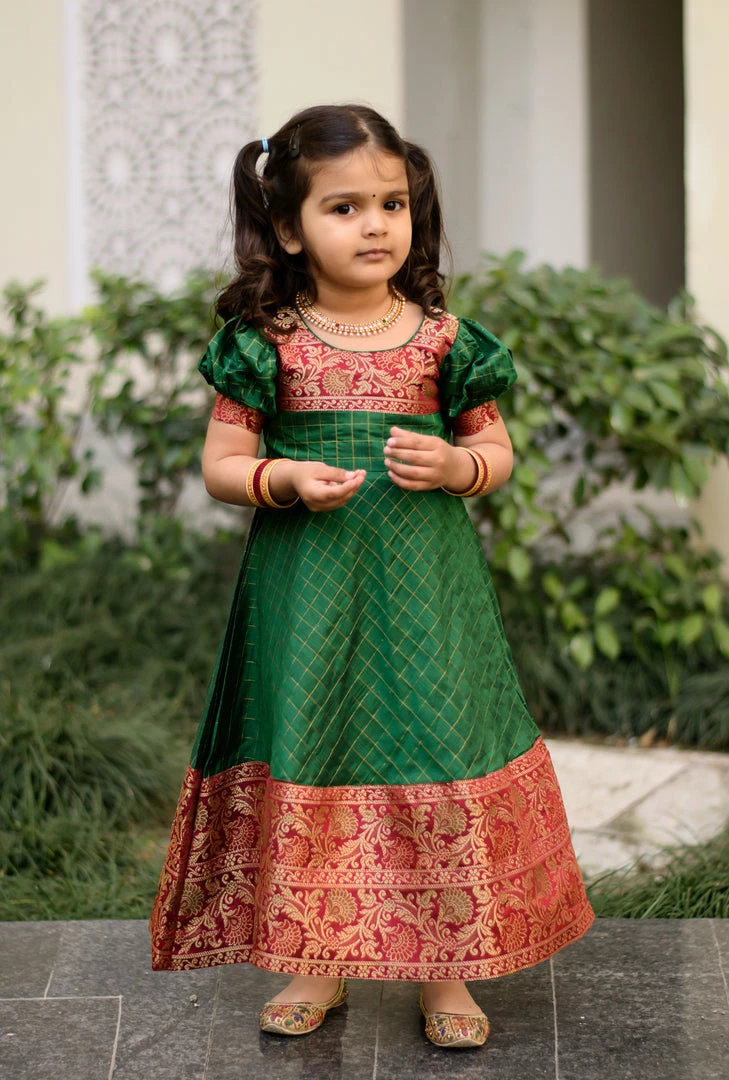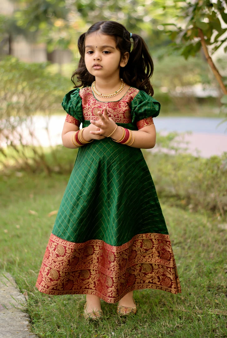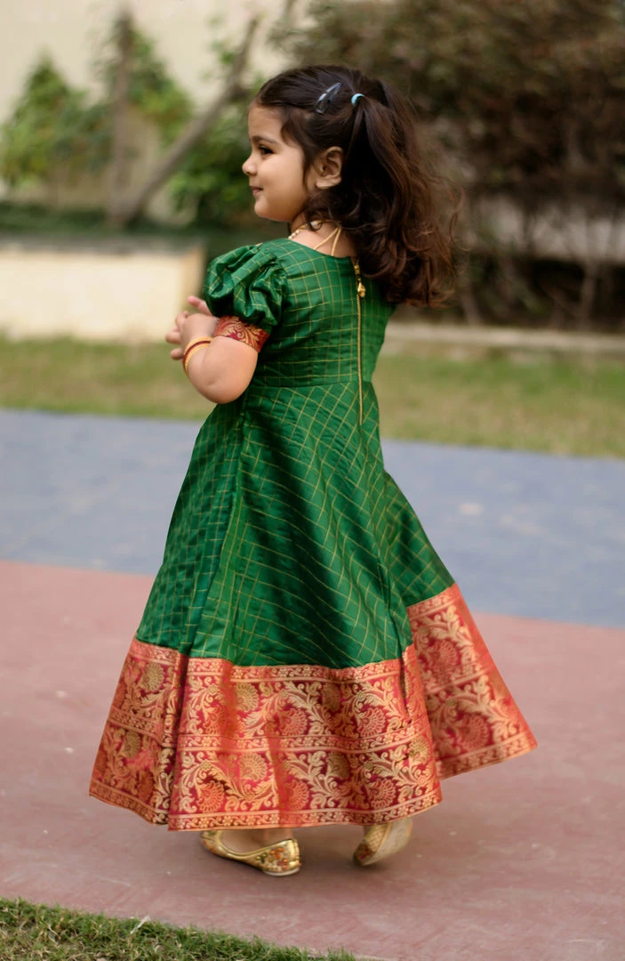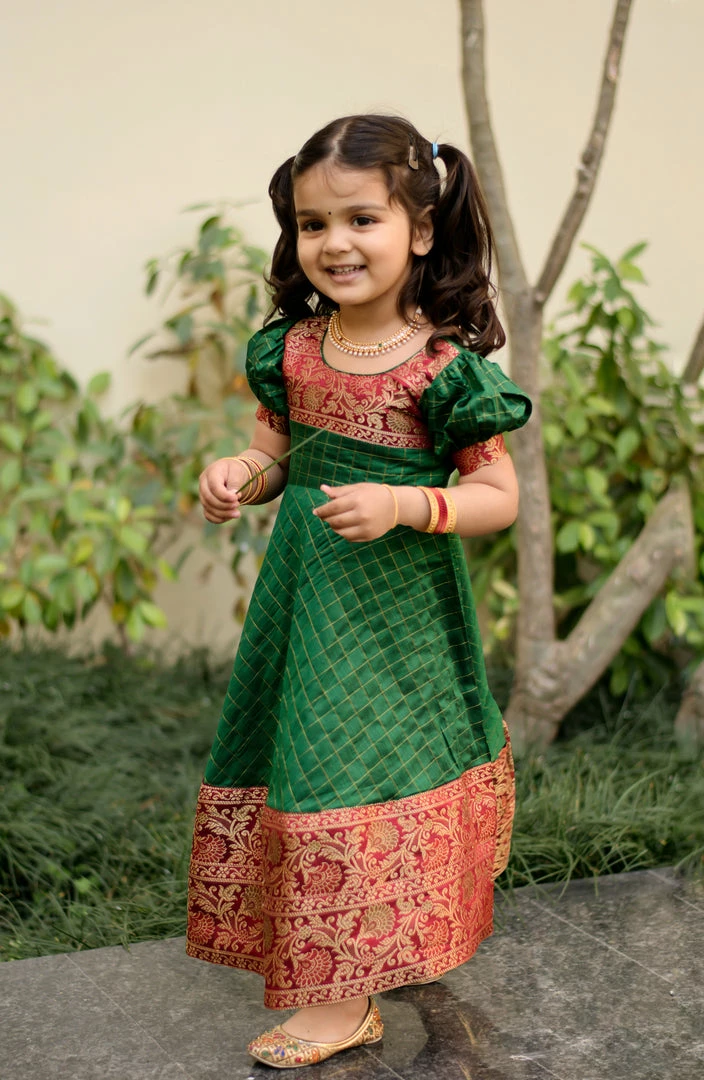 Chanderi cotton silk dress with zari checks is embellished with zari borders in the hemline. And the puff sleeve detailing brings the traditional vibes. A super comfortable dress for the little angel. The dress is fully lined with cotton lining.
