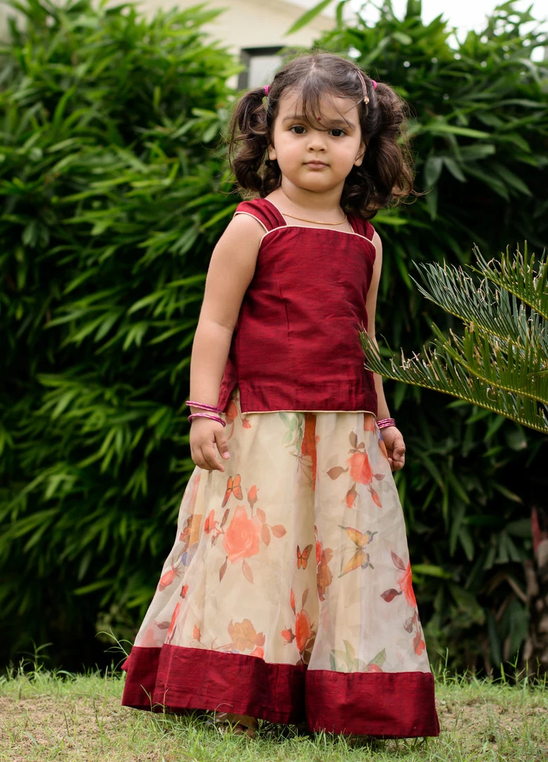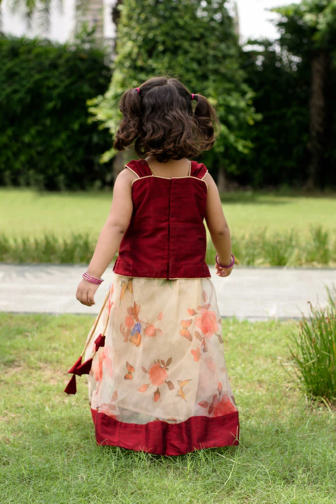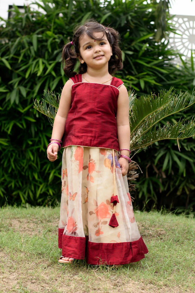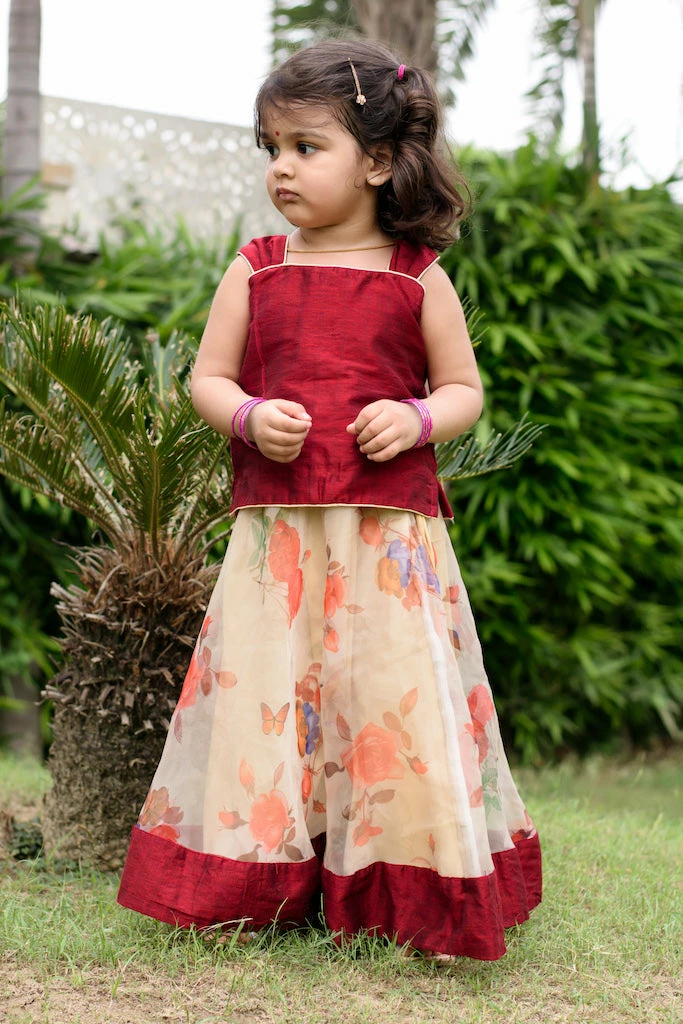 Chanderi cotton silk top paired with soft organza with floral print. Top is lined with soft cotton and skirt is lined with suncrepe.Â