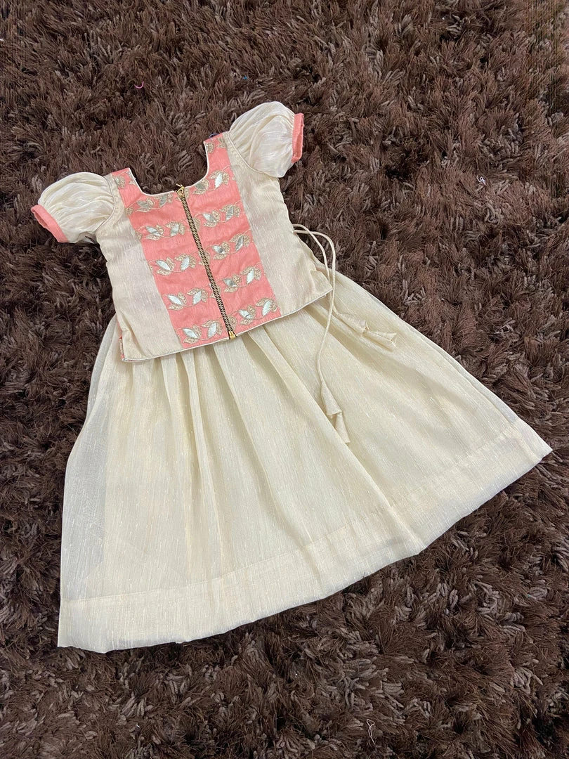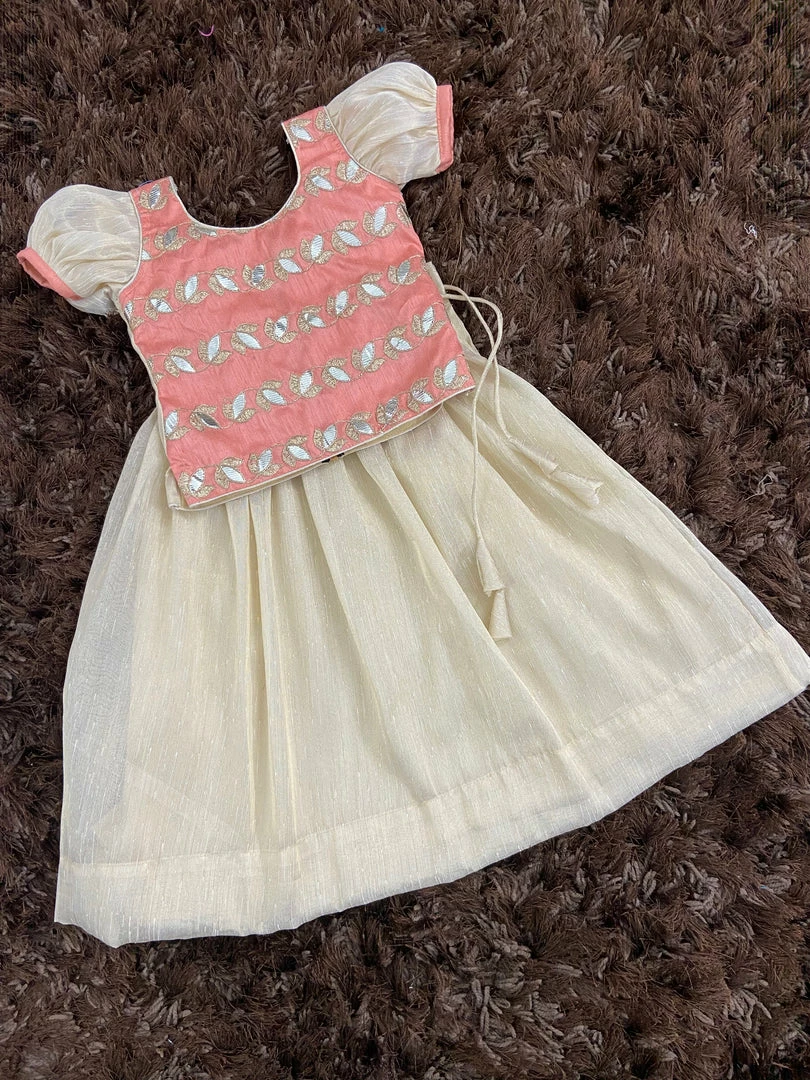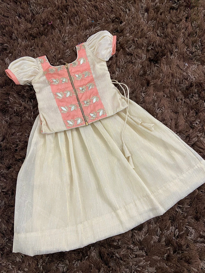 This collection of embroidered foil print top with tissue silk skirt adds glitter to this festive season. The biggest joy are found in simple things like dressing up the little princess. This is a must have for this festive season. Back Metallic zipper closure.