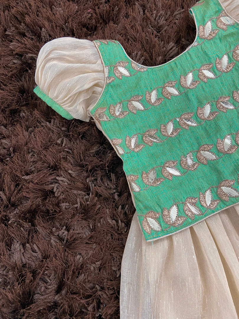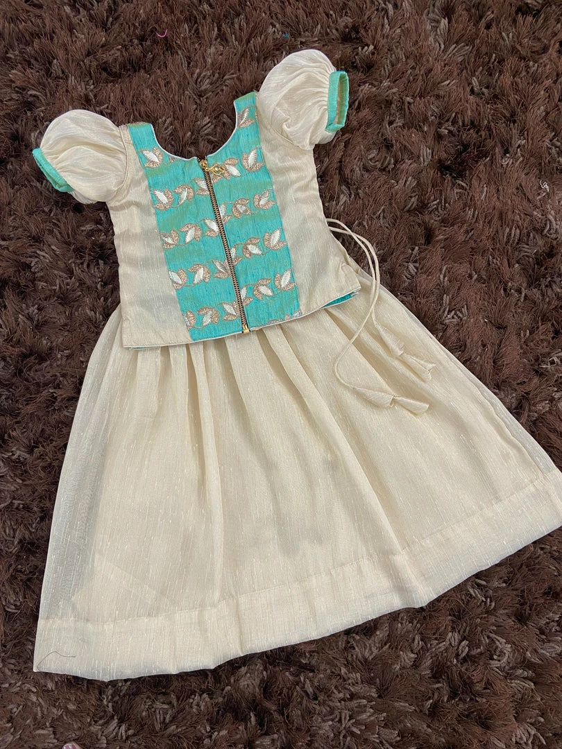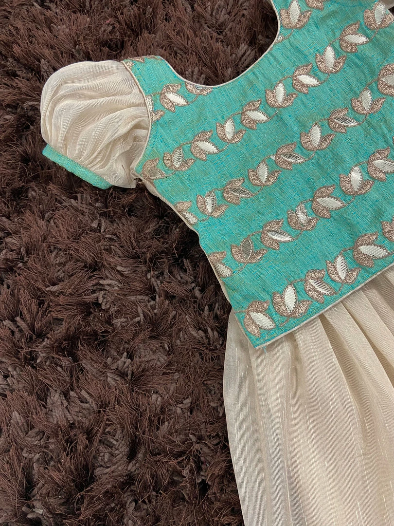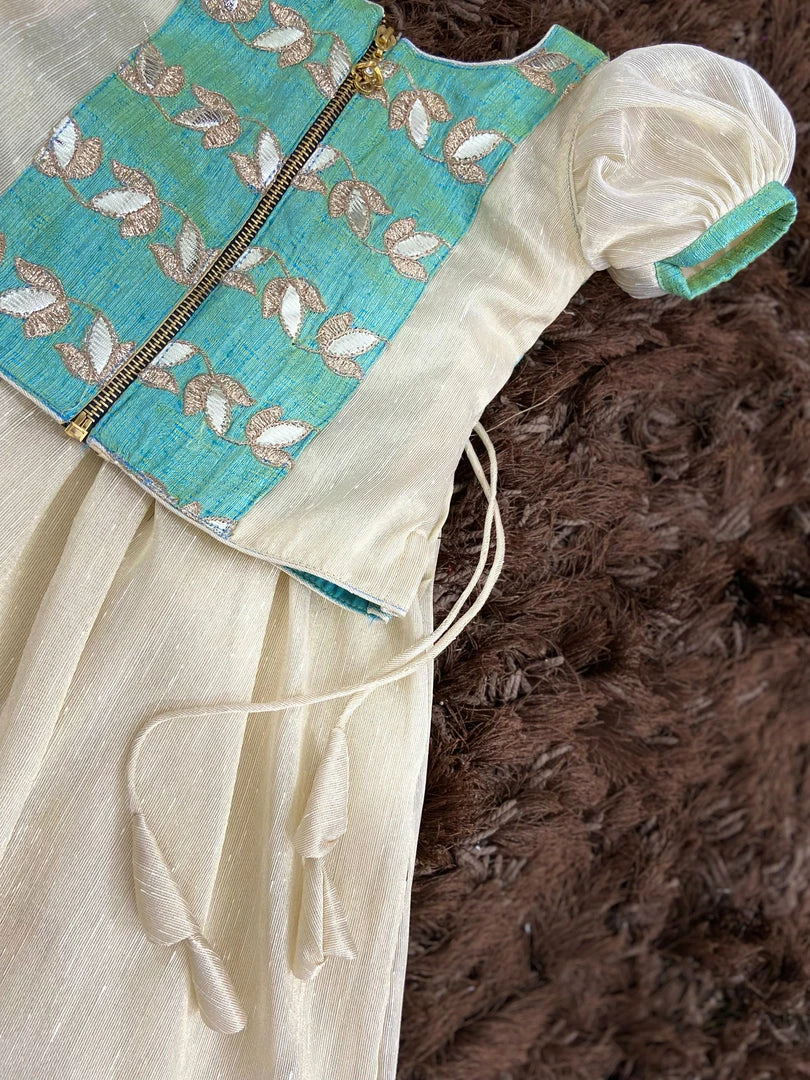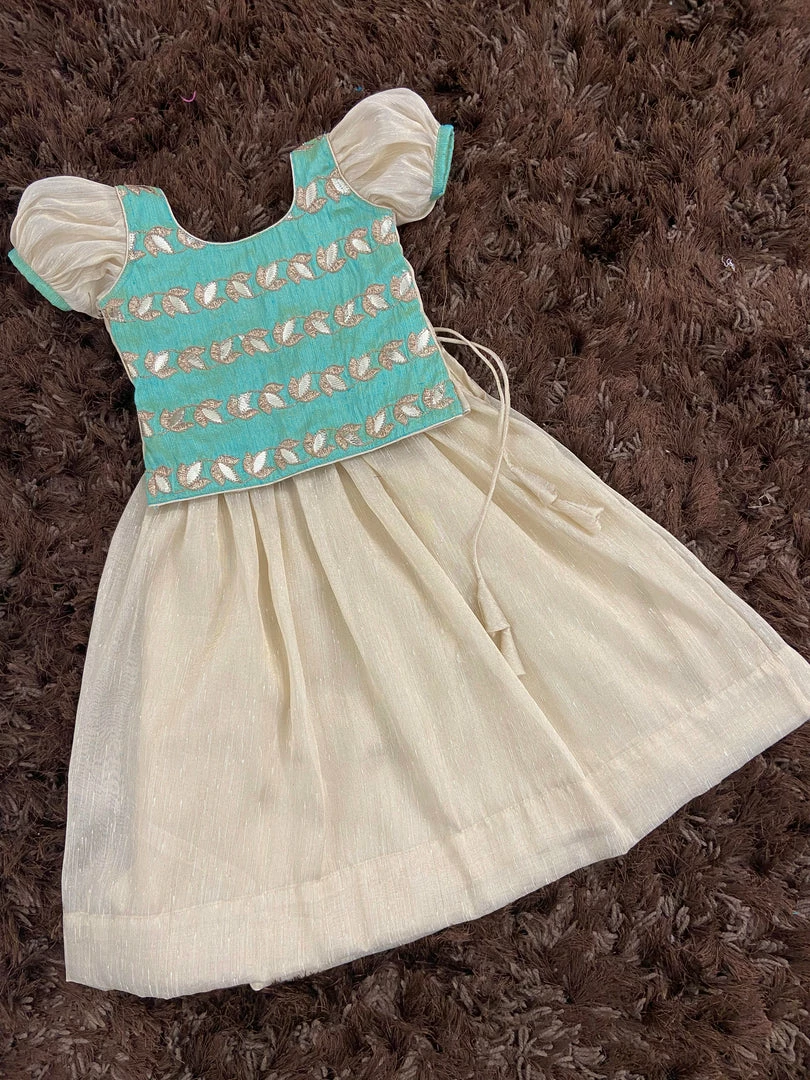 This collection of embroidered foil print top with tissue silk skirt adds glitter to this festive season. The biggest joy are found in simple things like dressing up the little princess. This is a must have for this festive season. Back Metallic zipper closure.