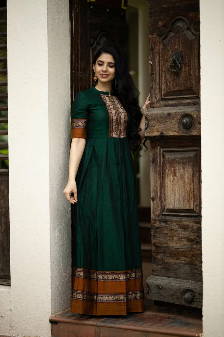 This Cotton dress gets a modern summer upgrade with mandrin collar. The border with zipper gives it a contemporary look. Sport this look with your favourite pair of jhumkas.