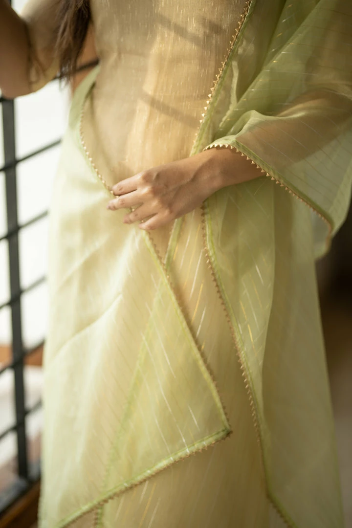 Gold tissue top paired with peach soft organza dupatta with foil print detailing.