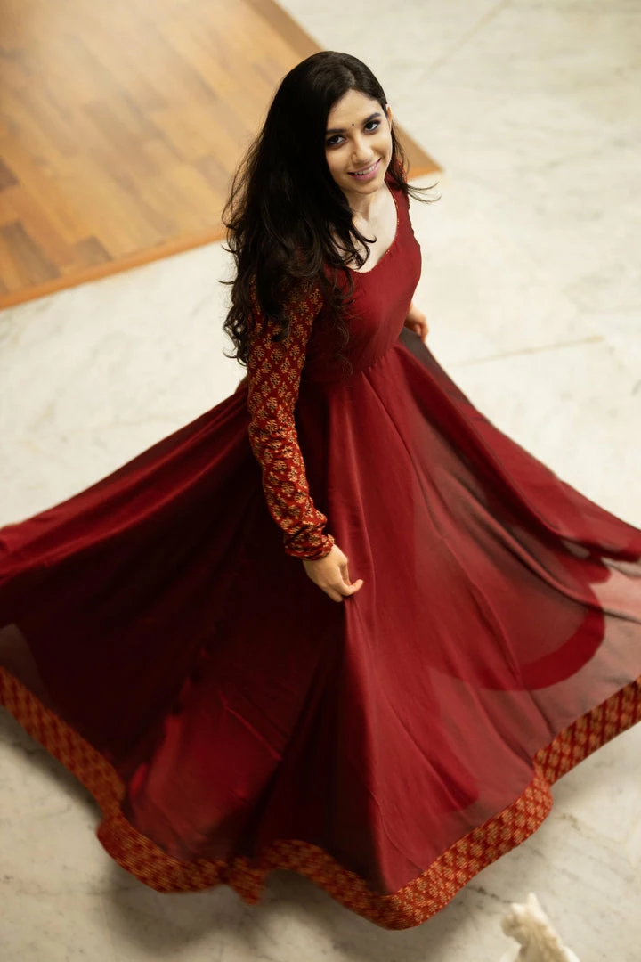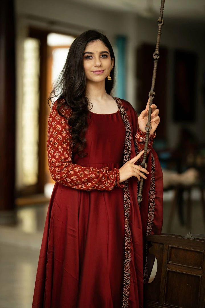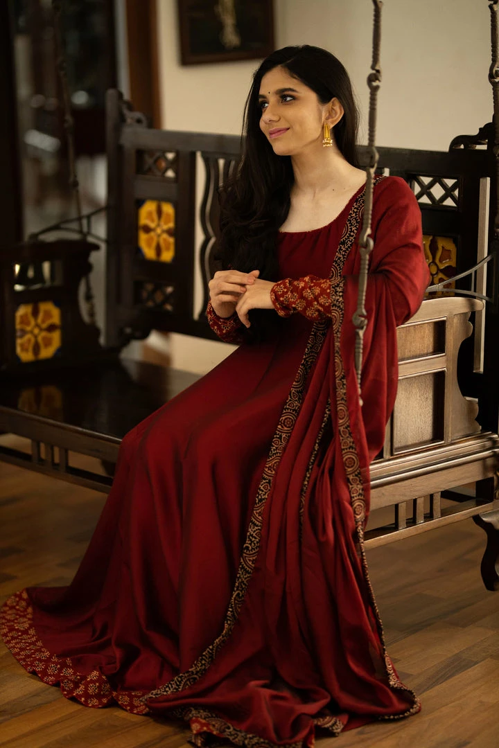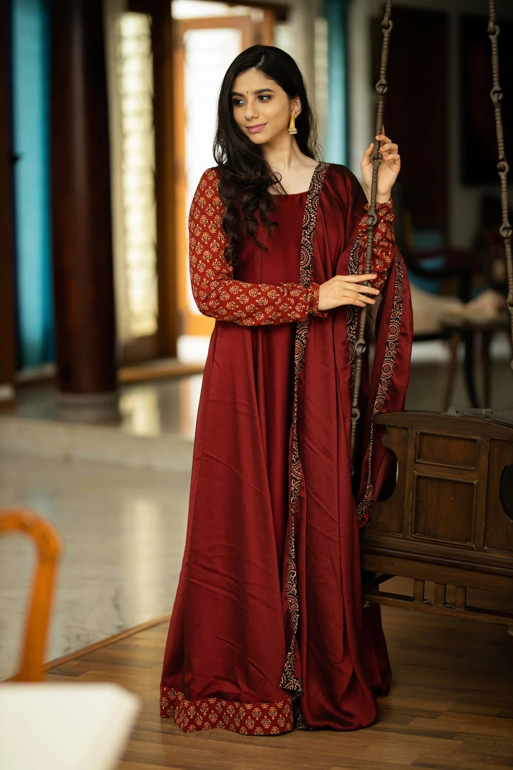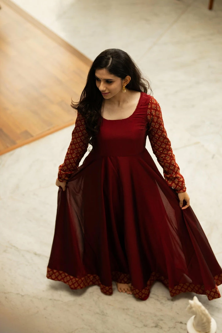 A Beautiful flared geogette dress with full gathered sleeve and border patch work in hand block printed cotton .Dupatta included.