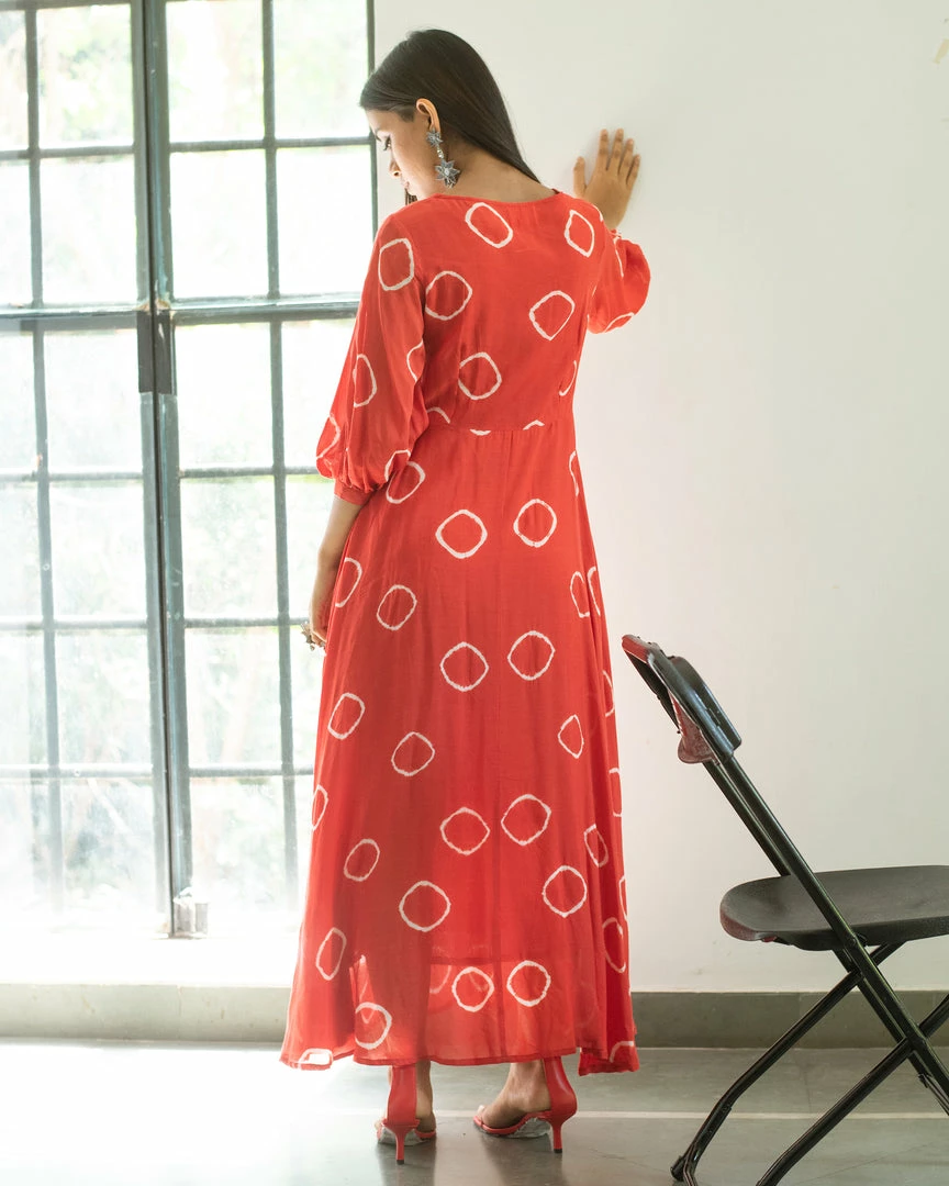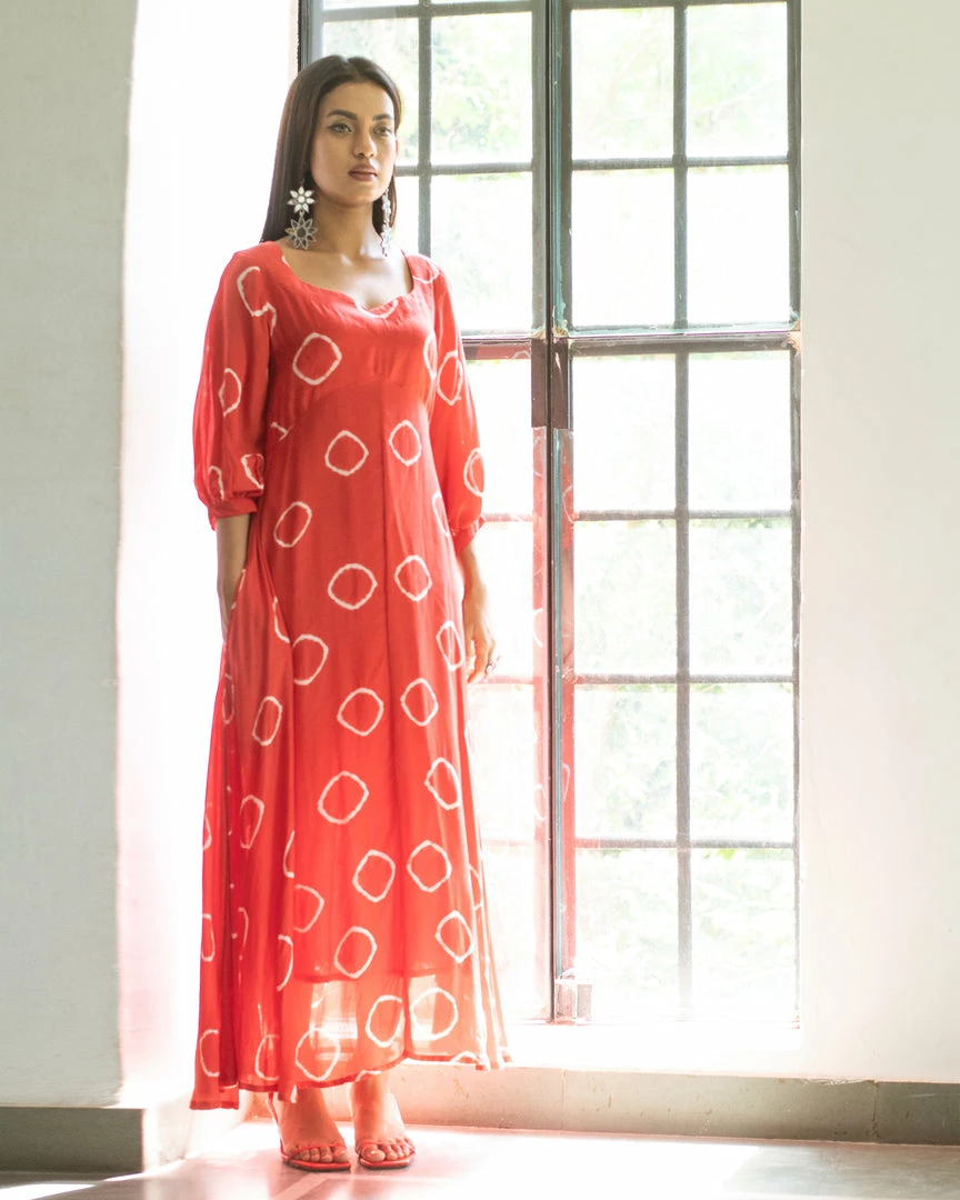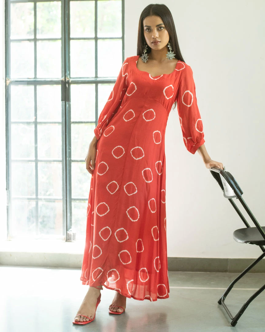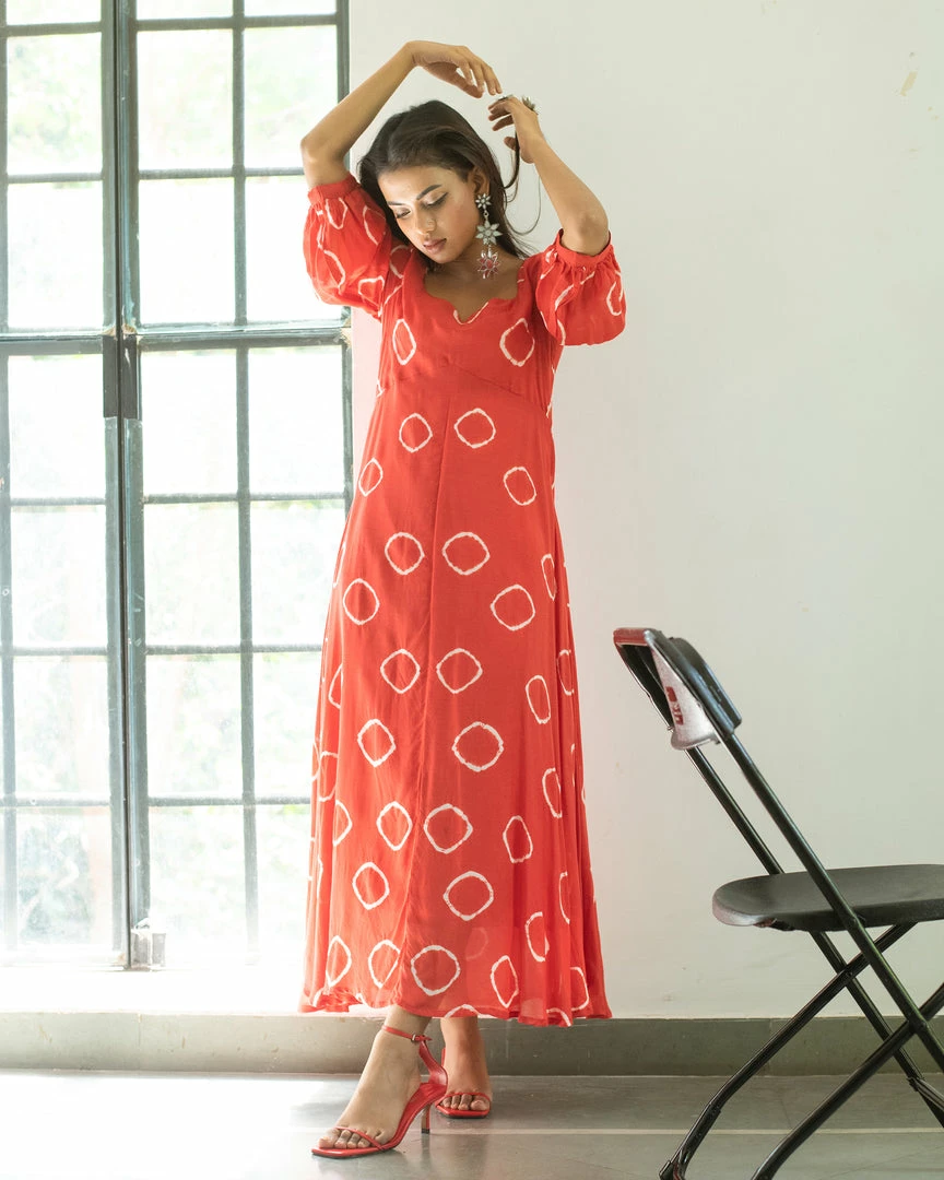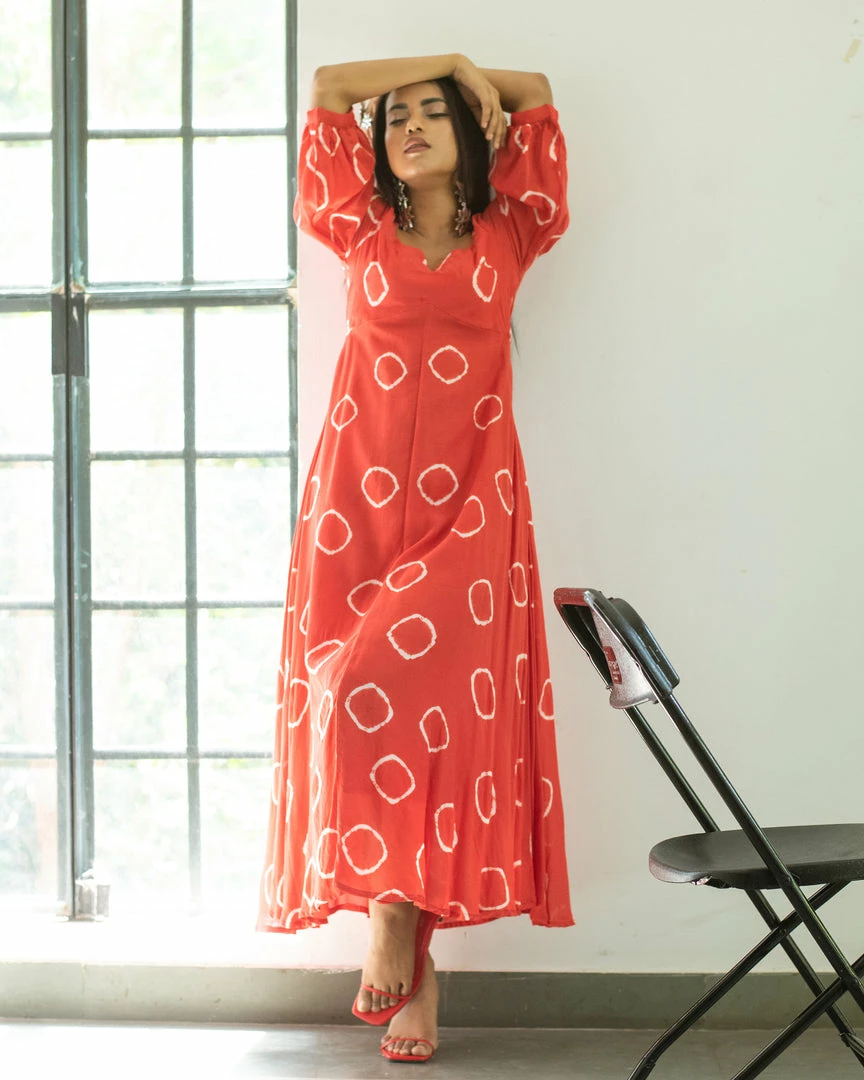 Model’s height is 5’6″. She is wearing a size small. The dress is fitted at bust.