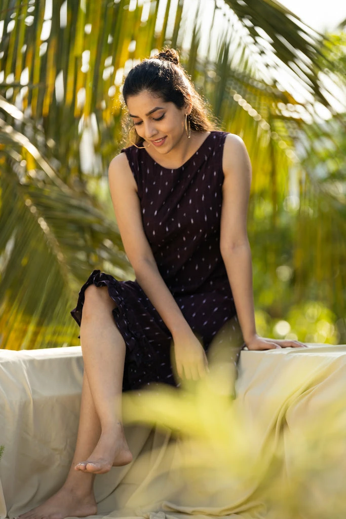 Brunette is a classic sleeveless Ikkat cotton wear with minimal designs placed all over the dress for a happy date with your friends and family. This casual daily-go-to outfit perfectly accentuates its rarity with a simple neckline and smartly shifted frills by the hemline that dances merrily to your tune of the day!