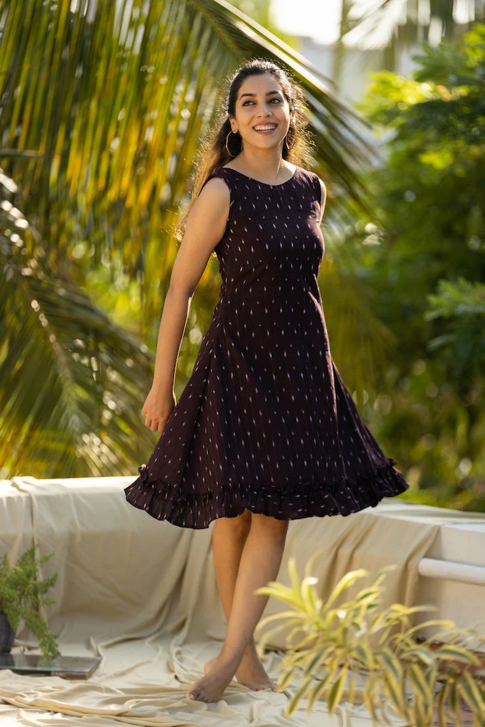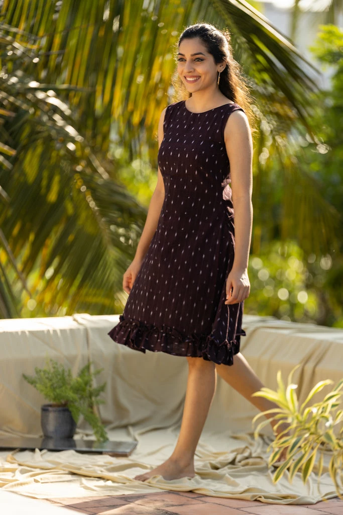 This summer, twirl, and swirl your way to your heart’s content with our new super stylish Brunette ikkat tunics. Brunette is a smart breathable cotton coffee brown solid natural color – Ikkat dress with mid-length, best fit, designed to make you feel more special on all your casual outings. This cool stupendous fit and flare Ikkat cotton midi dress is woven from ncotton fibers by the artistic weavers of Andhra Pradesh, India.