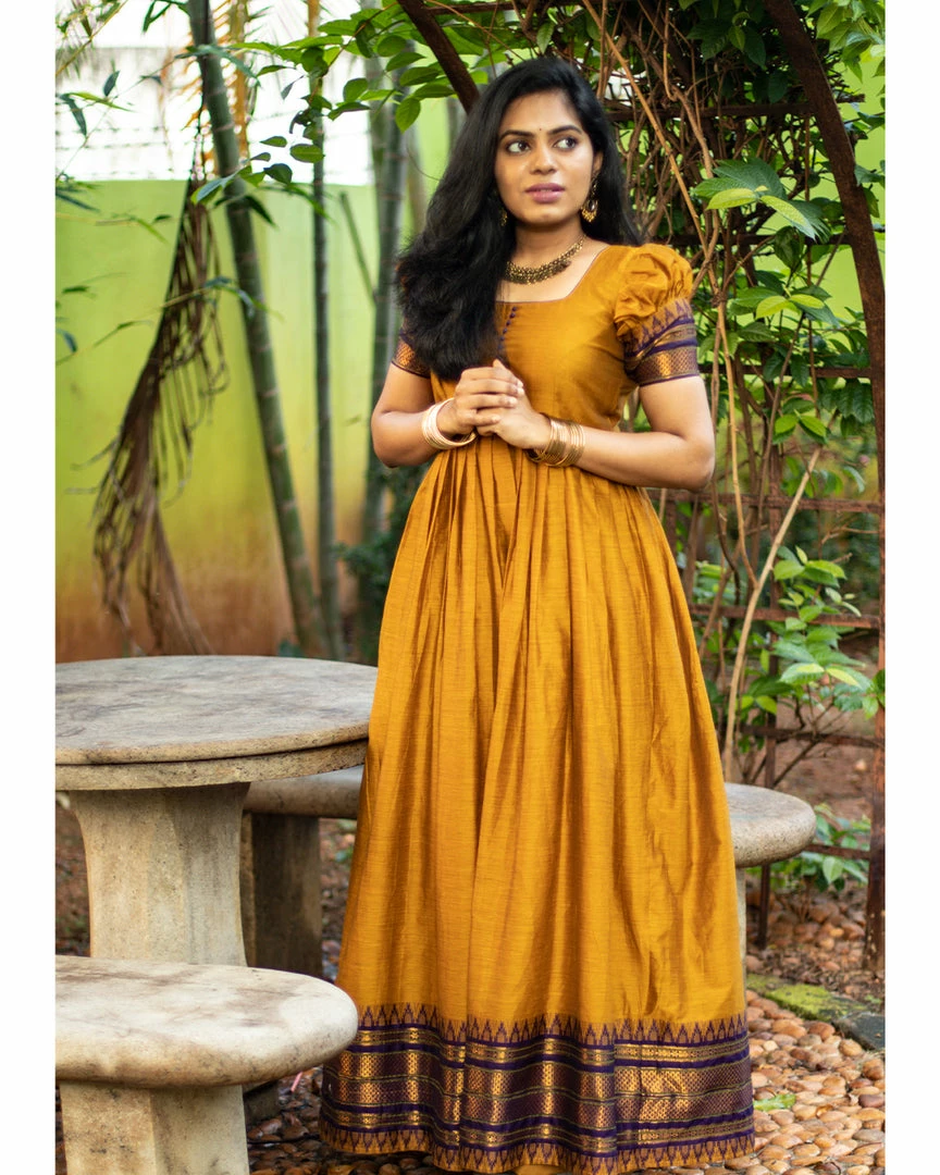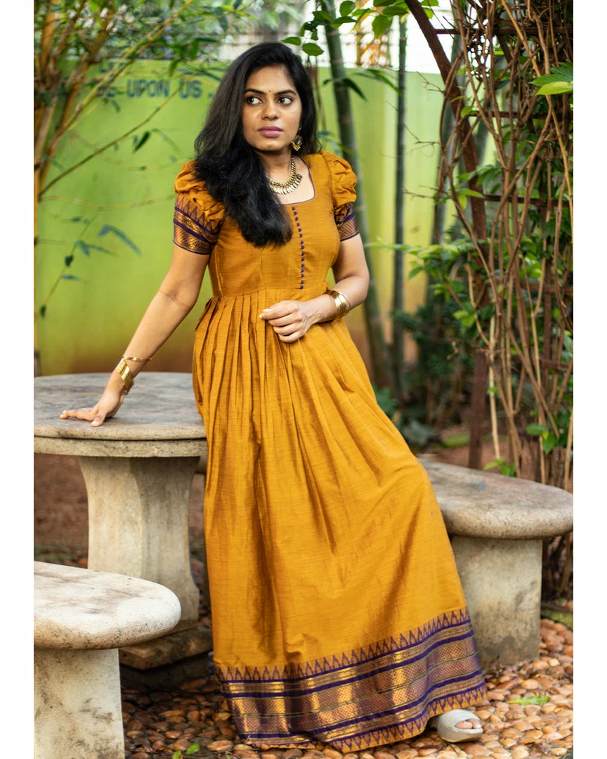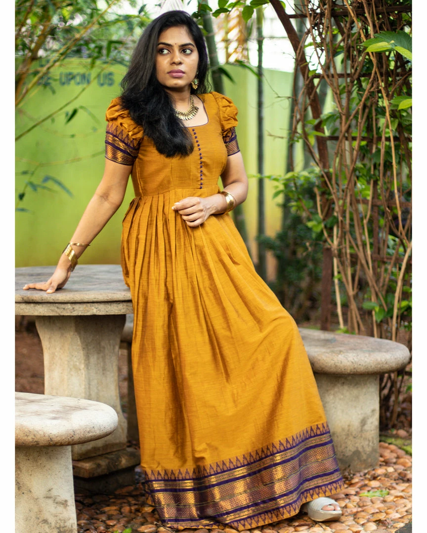 Buy this beautiful outfit and Experience the blend of tradition !! This elegant narayanpet cotton saree maxi dress in stunning colour gets a contemporary traditional look with classic zari borders in puff sleeves & trims of the dress. The neck with potli buttons & tassles in the back adds beauty to this outfit.If you are looking for a classy yet traditional outfit for the upcoming festive season then DO NOT miss this NARAYANI !!Â