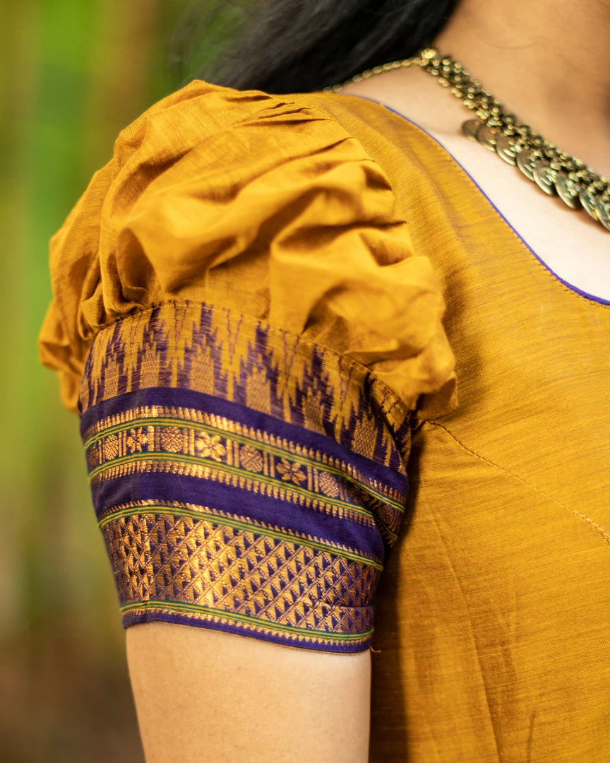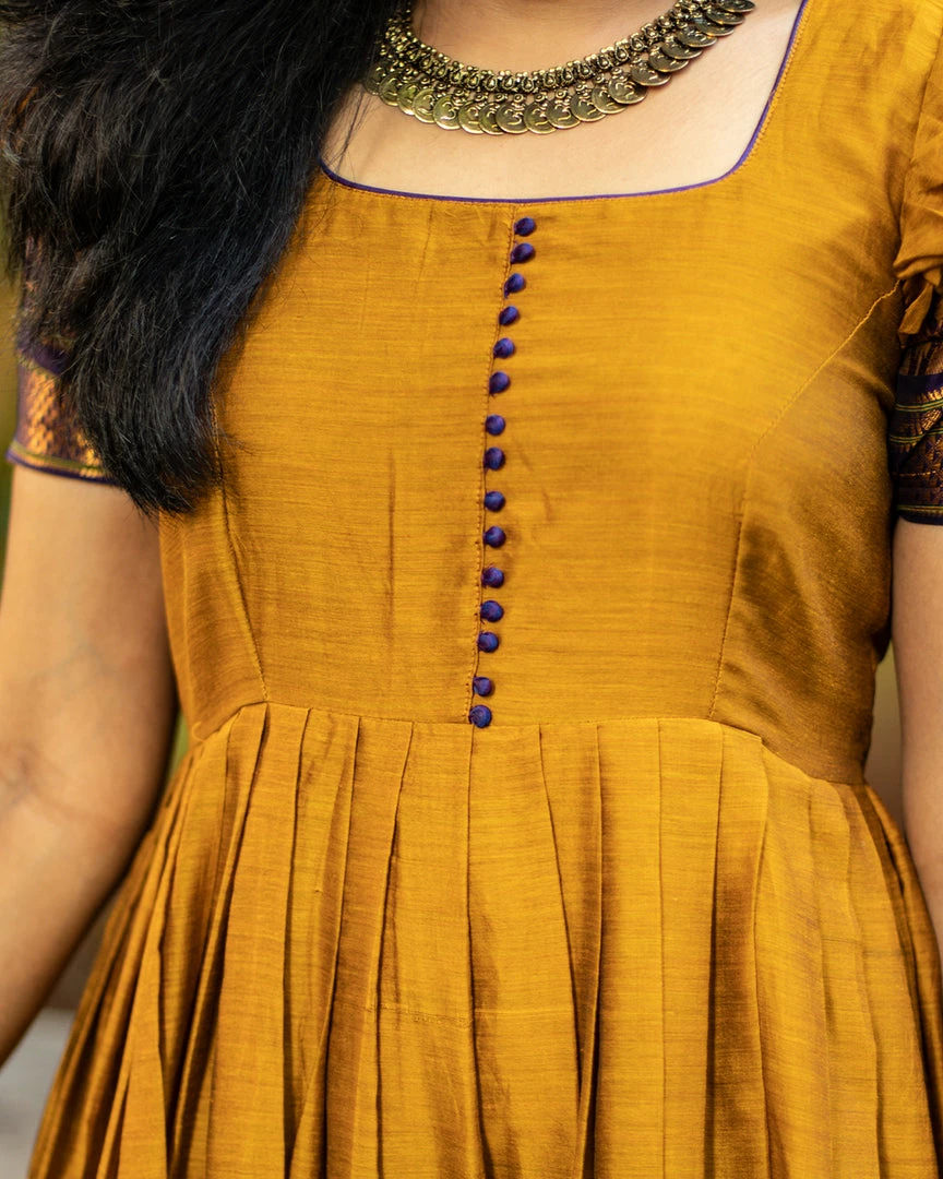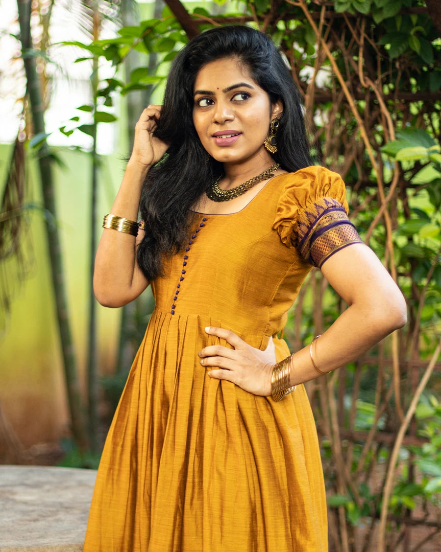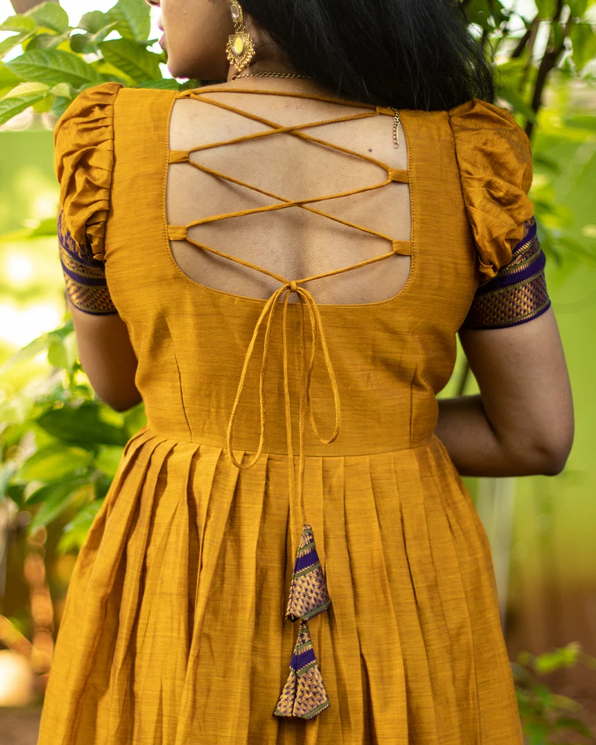 Buy this beautiful outfit and Experience the blend of tradition !! This elegant narayanpet cotton saree maxi dress in stunning colour gets a contemporary traditional look with classic zari borders in puff sleeves & trims of the dress. The neck with potli buttons & tassles in the back adds beauty to this outfit.If you are looking for a classy yet traditional outfit for the upcoming festive season then DO NOT miss this NARAYANI !!Â