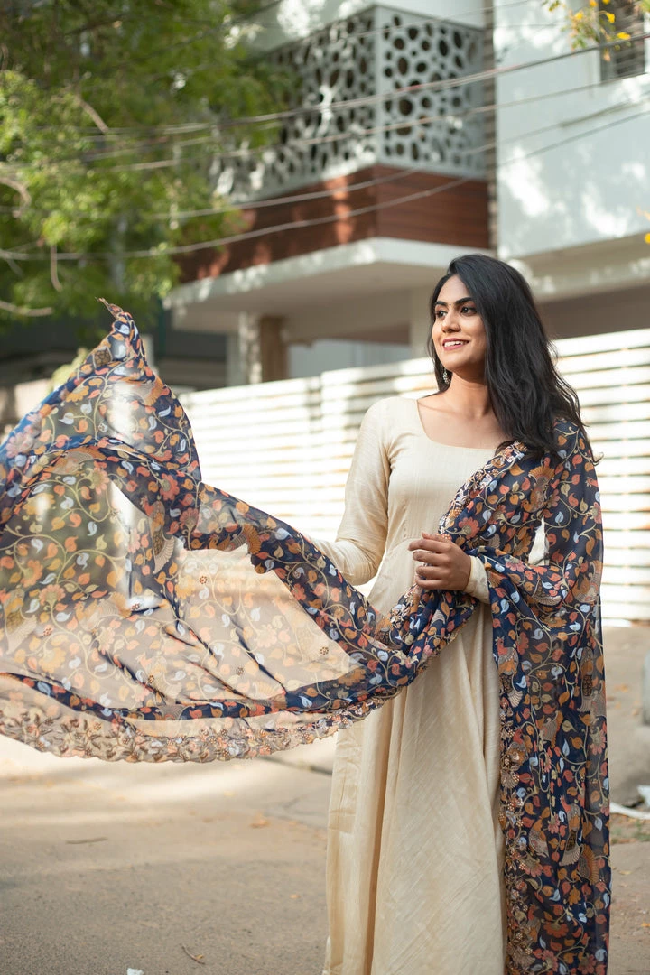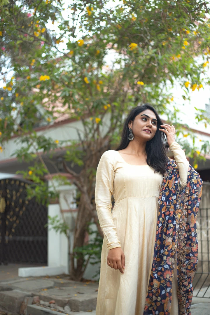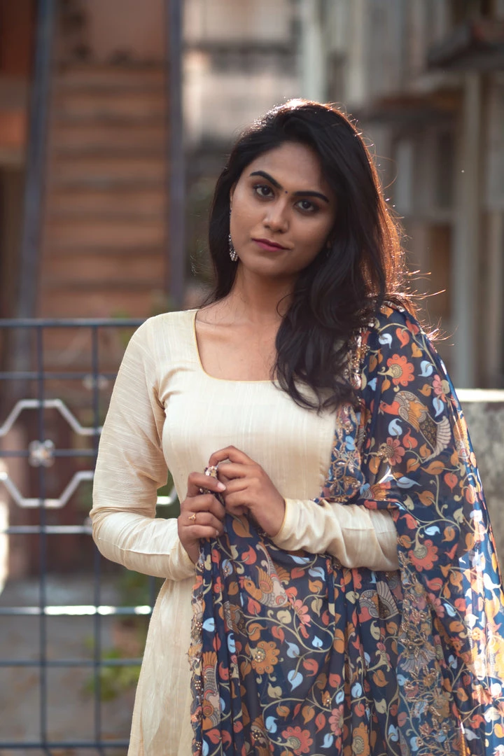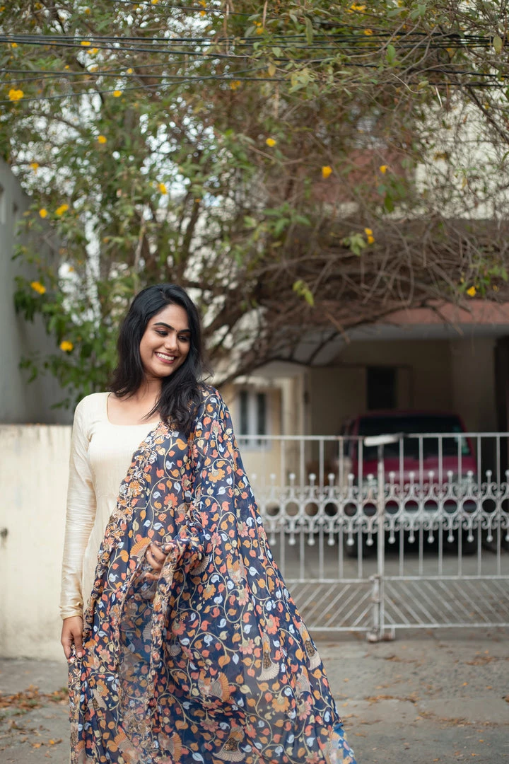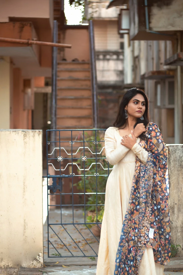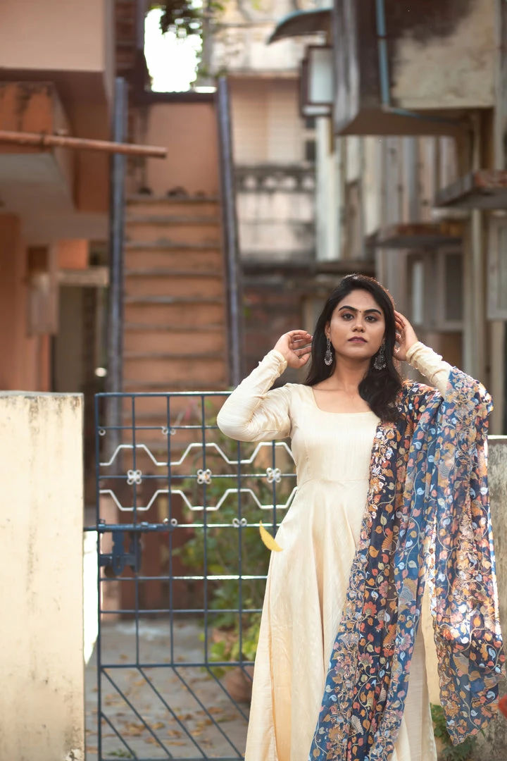A truly magical Off White Maxi dress paired to navy blue georgette kalamkari print dupatta with pearl work & scalloped borders. Nithila is a fit & flare silhouette with a round square neck & tassles at the back and fitted full sleeves with gathers which gives a subtle yet sophisticated look.