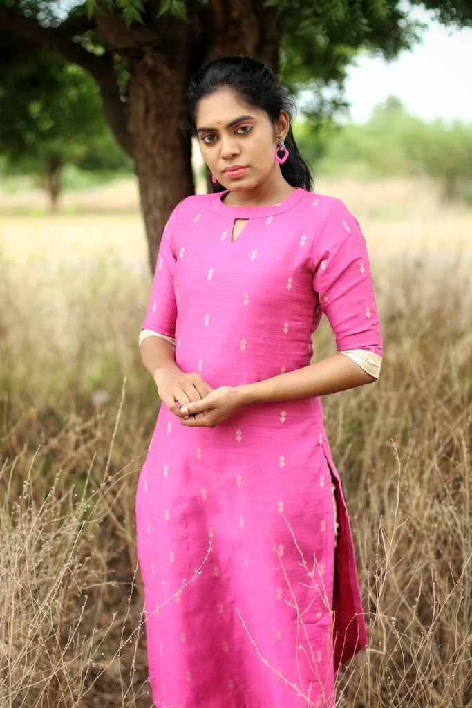 Pastel pink top has round collar neck with a V slit & fabric button in the back paired with half white straight fit pants is designed to give you nothing but comfort & style.