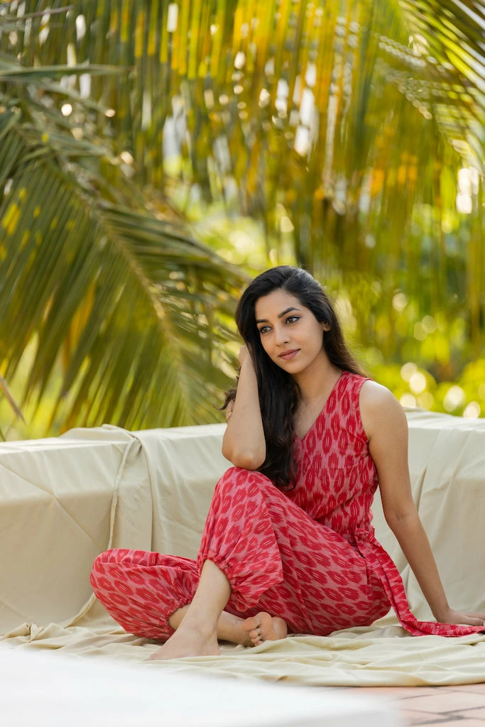 Flaunt in style this summer vacation with Savannah, an easy-to-wear stylish red Ikkat cord set hallmarked for a cool breezy summer outing with your gang. This comfortable red Ikkat cotton cord set has a customized Angarkha style sleeveless crop top designed with self Afghan patterned crop pants, handcrafted with love from our very own traditional community of Ikat weavers from the lands of Andhra Pradesh.