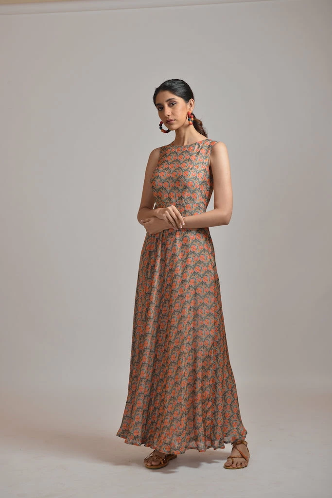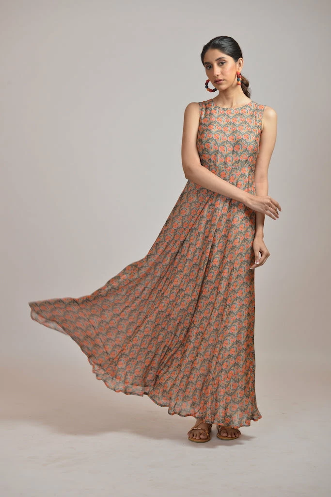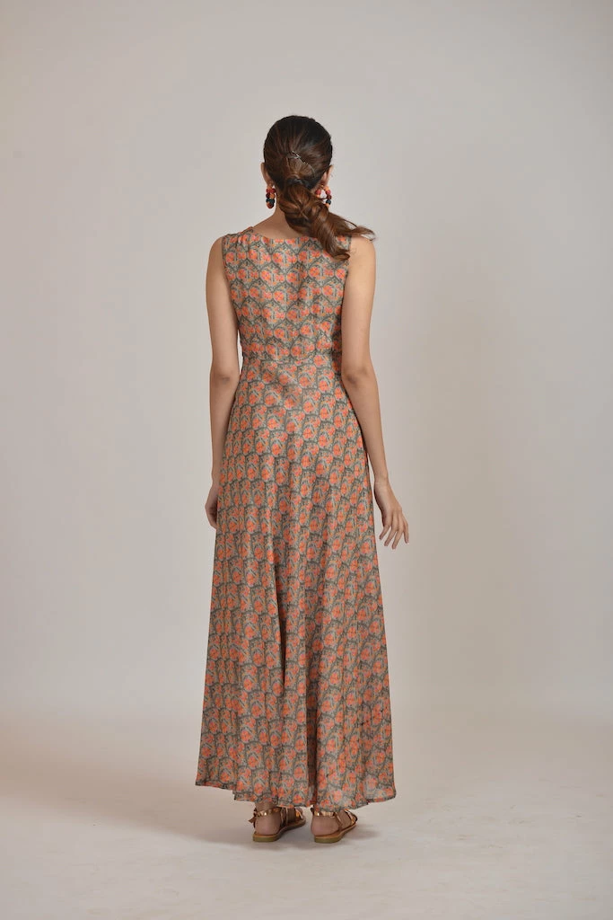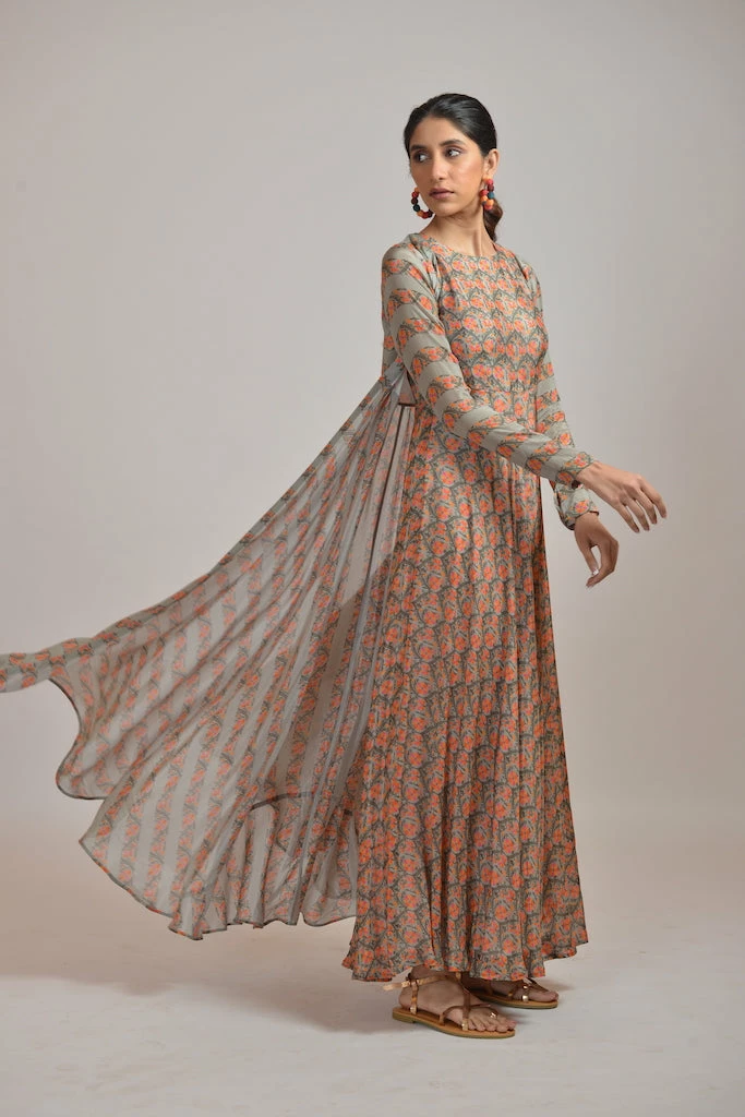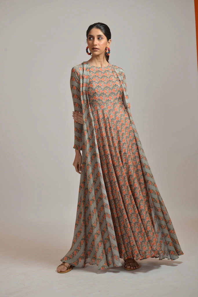 Gold rush printed maxi dress in georgette base paired with an overlay jacket.