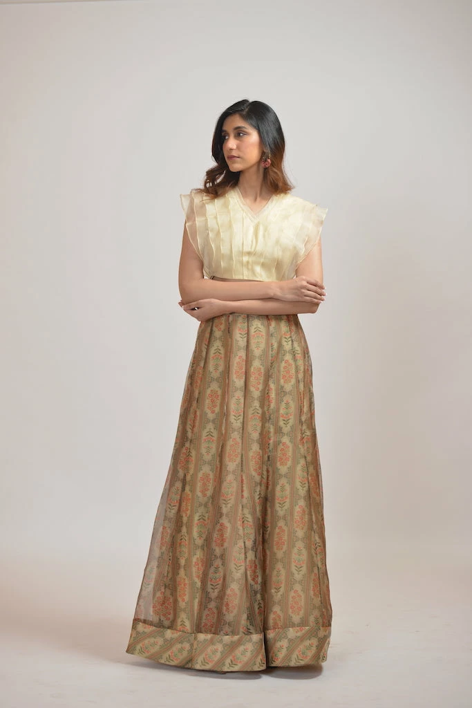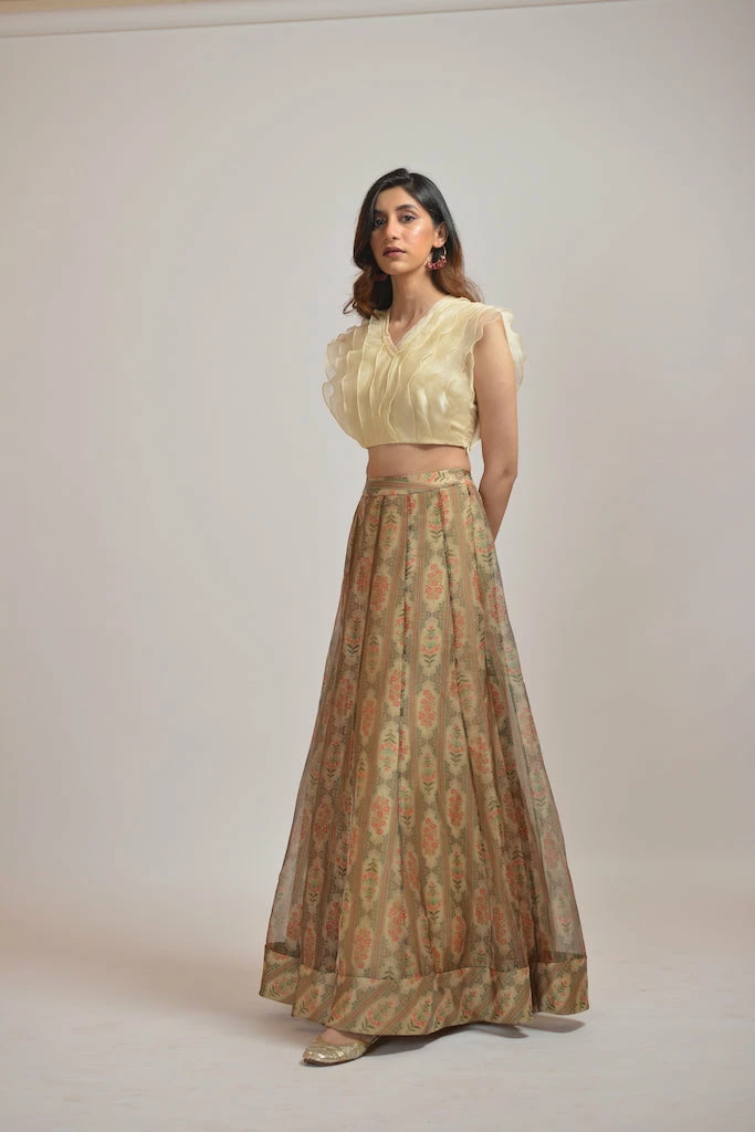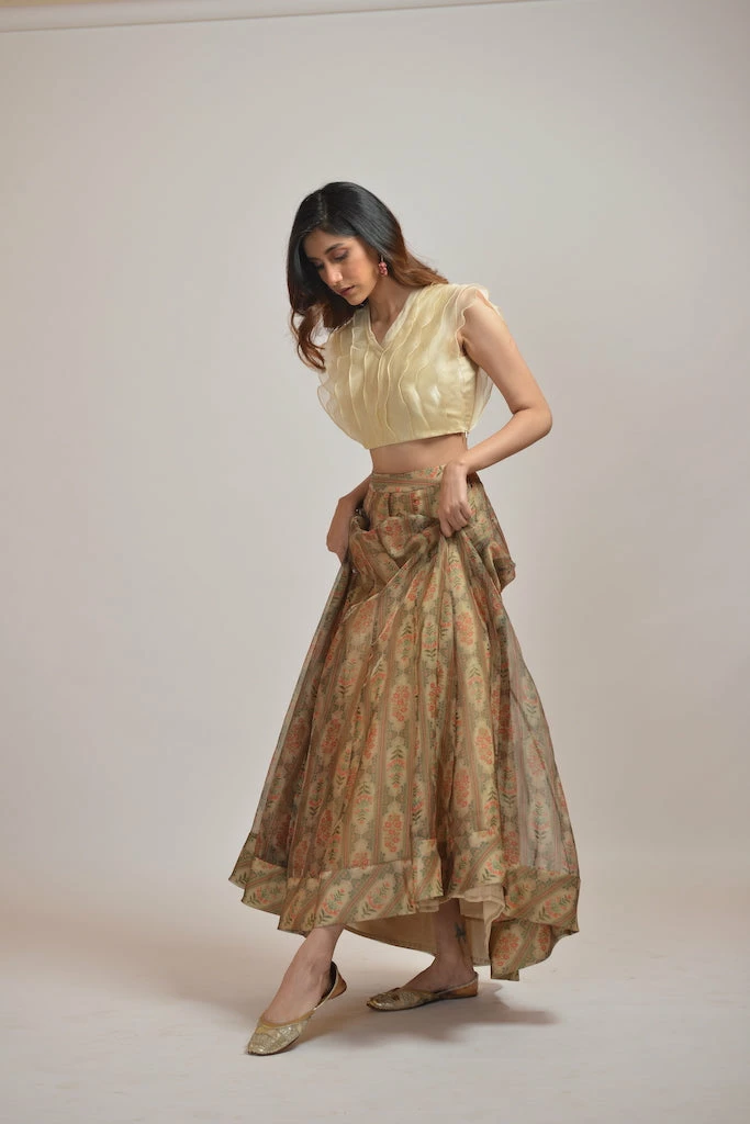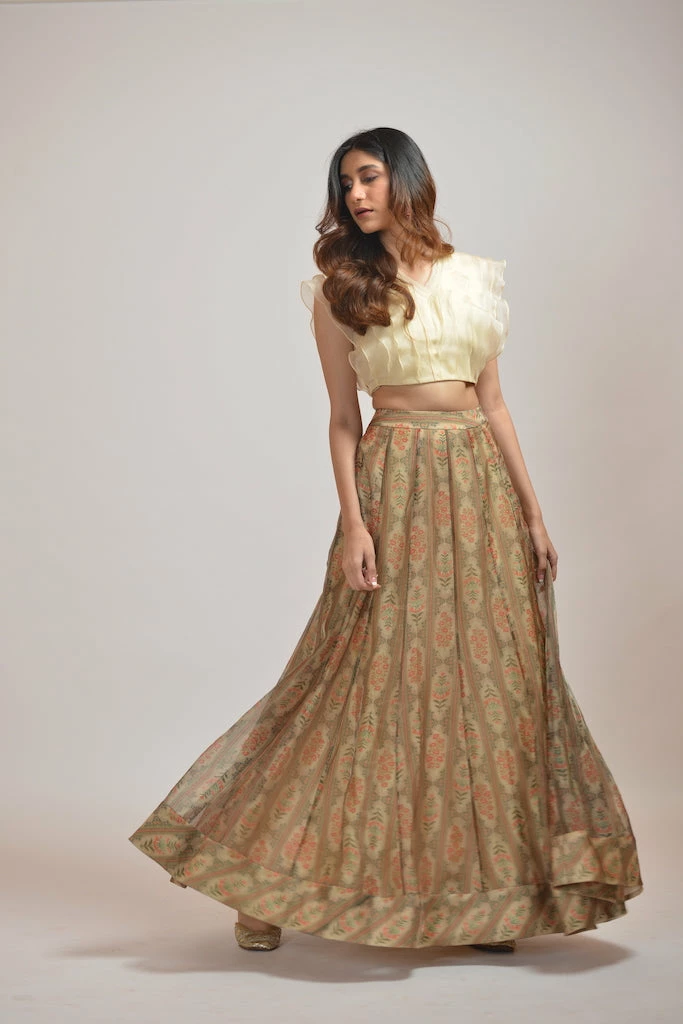 Printed organza skirt paired with a contrasting cream ruffled top.