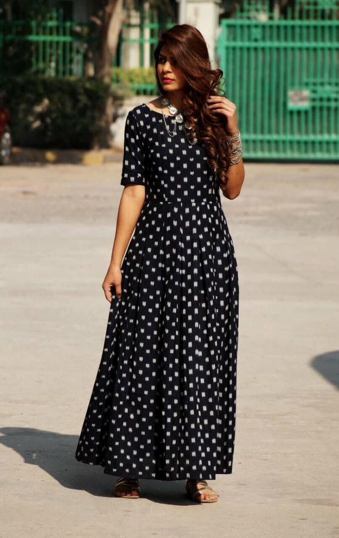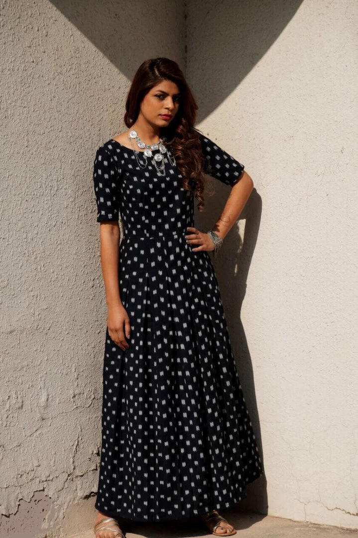 A well for black ikat weave dress, to look stylish and comfortable. Flat box pleats in handwoven ikat with elbow sleeve.Â
