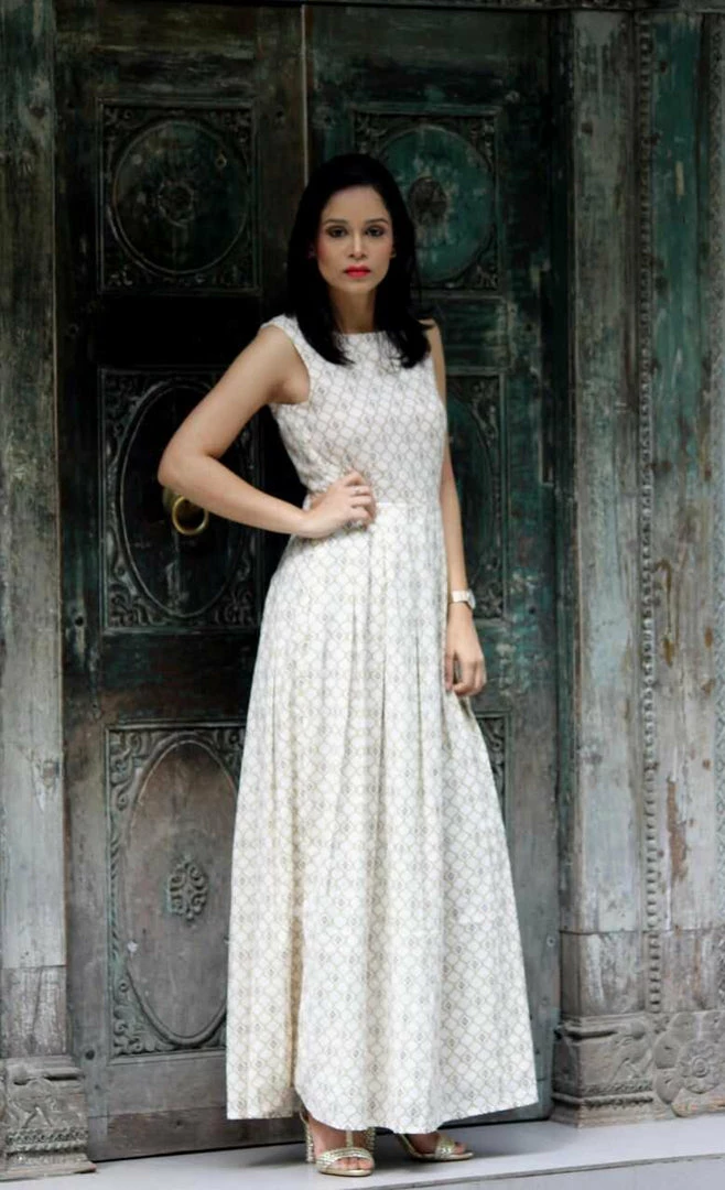 Ivory Pleated cotton slub Maxi dress with matte-gold Mughal ‘JAAL’ block – print details.
