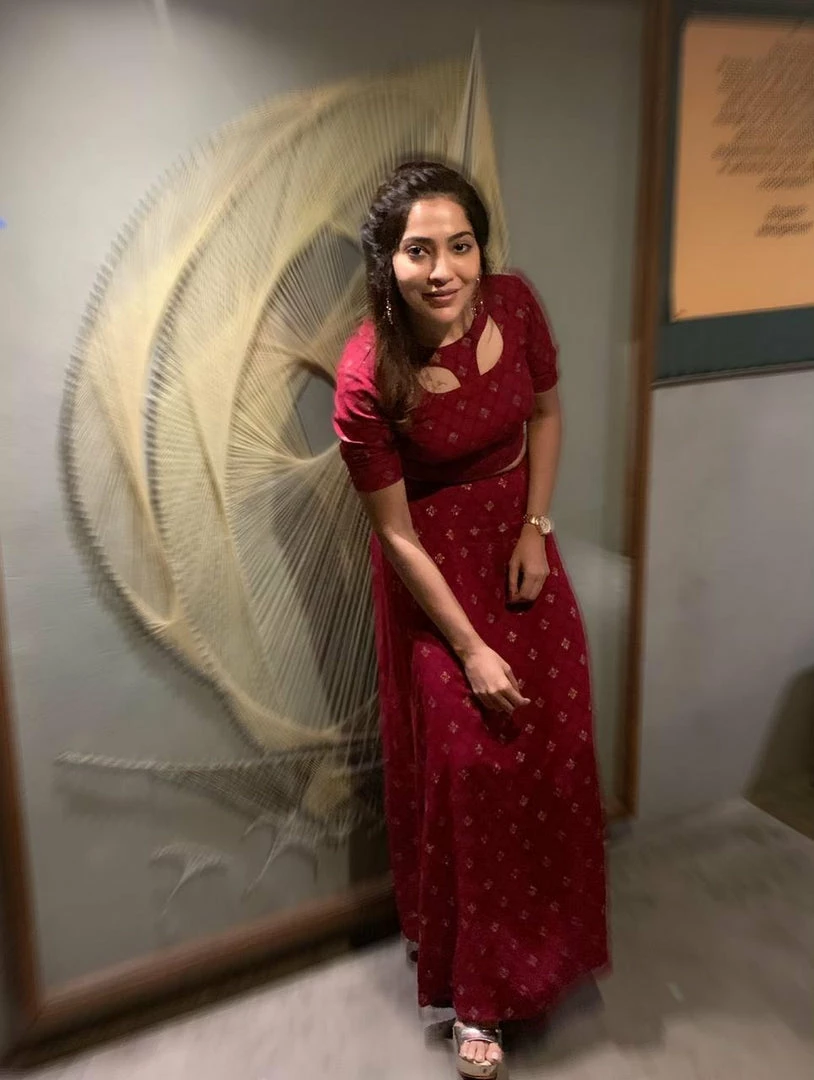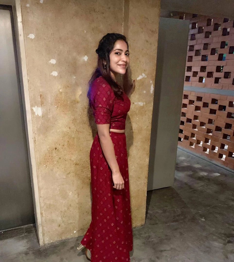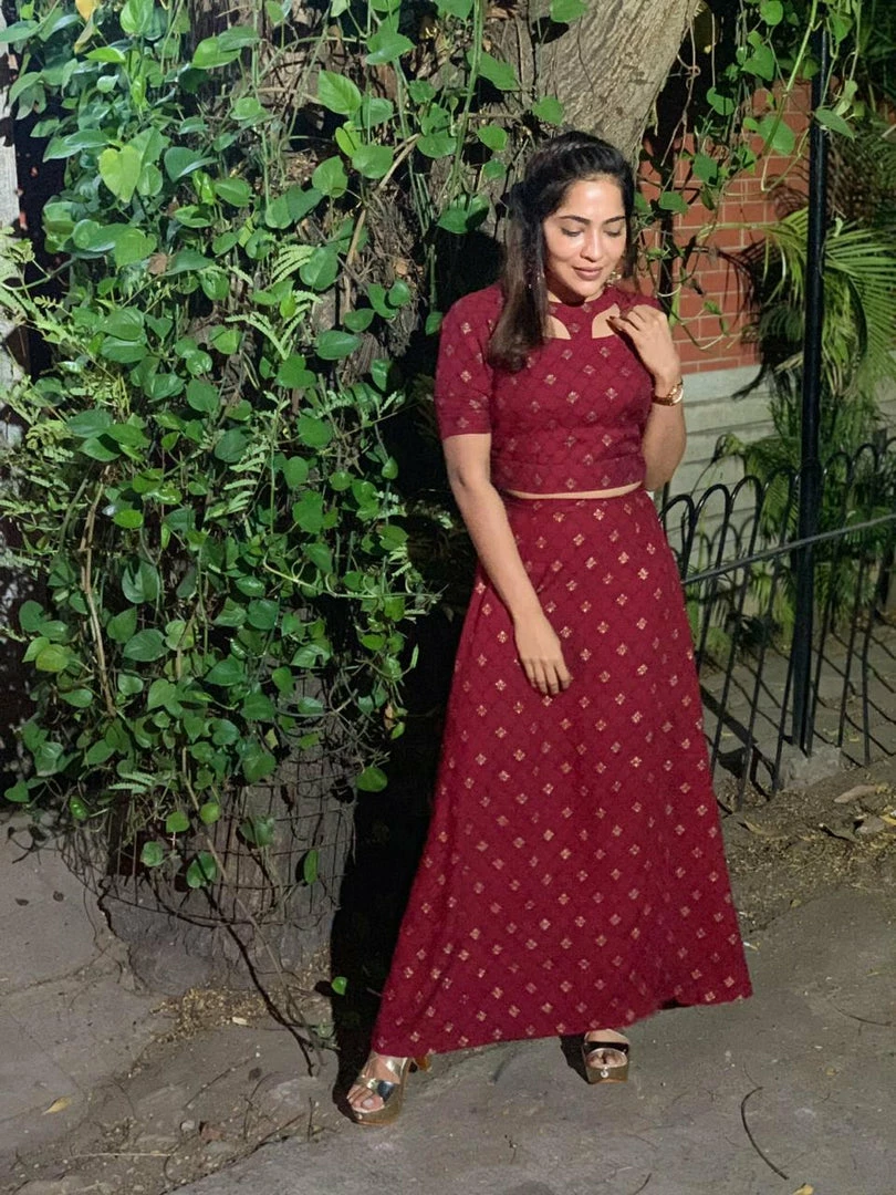 Pleated cotton slub crop top and skirt set with matte-gold Mughal ‘JAAL’ block – print details.