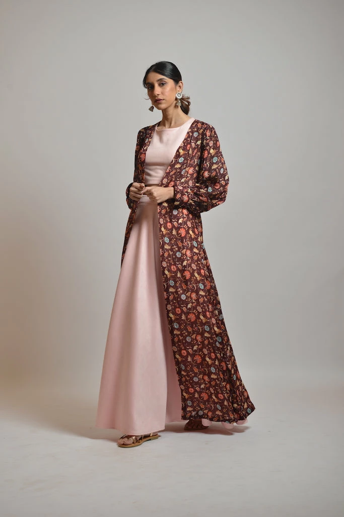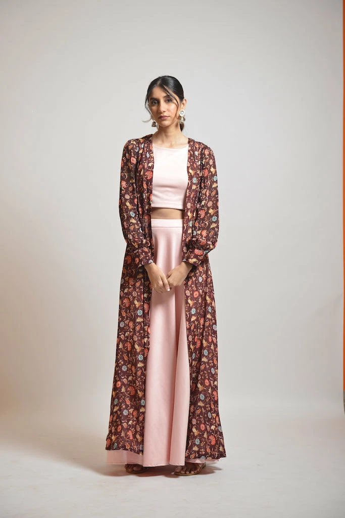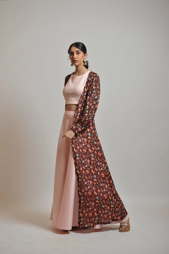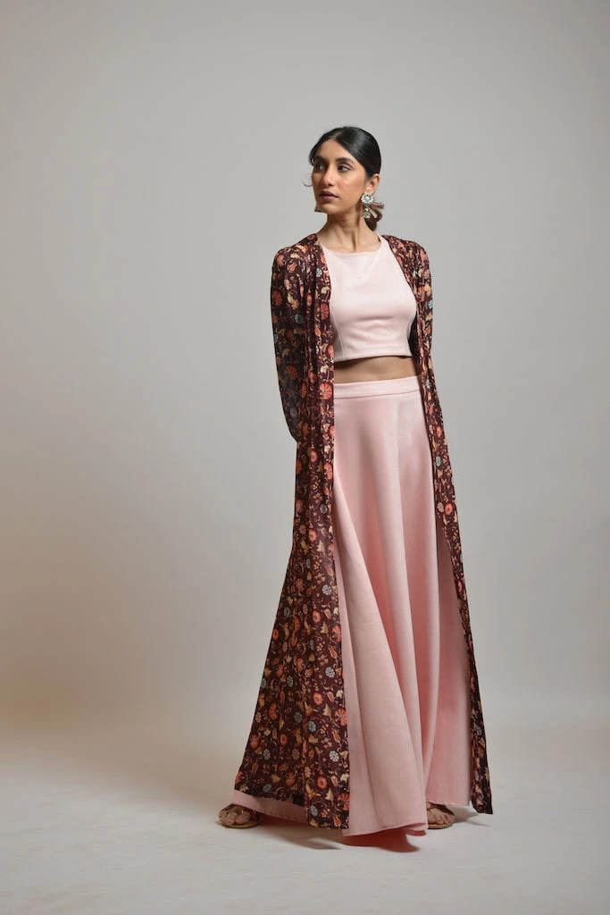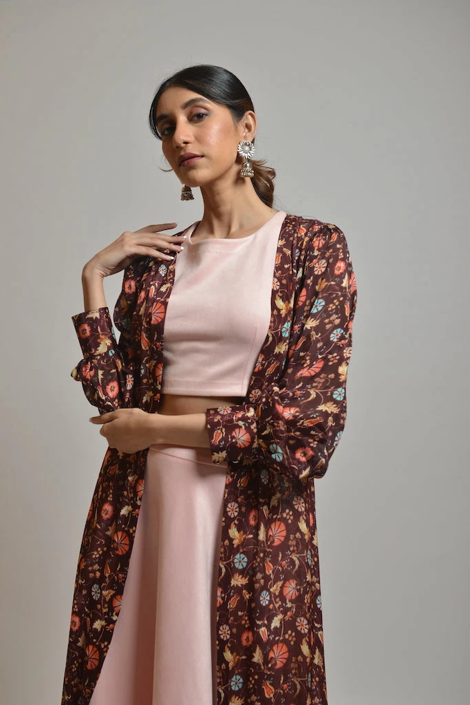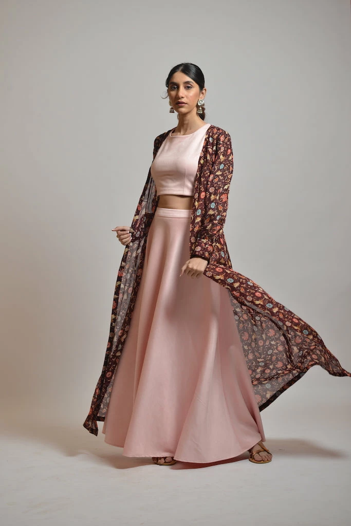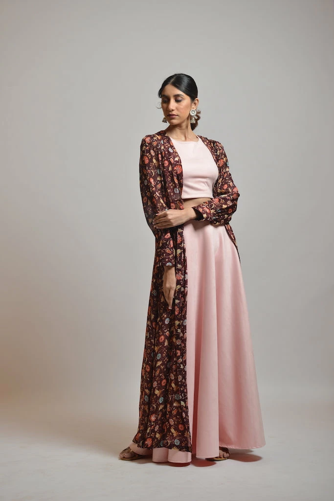 This set features a pink crop top paired with matching skirt and rust front open jacket in geaorgette with floral pattern all over.