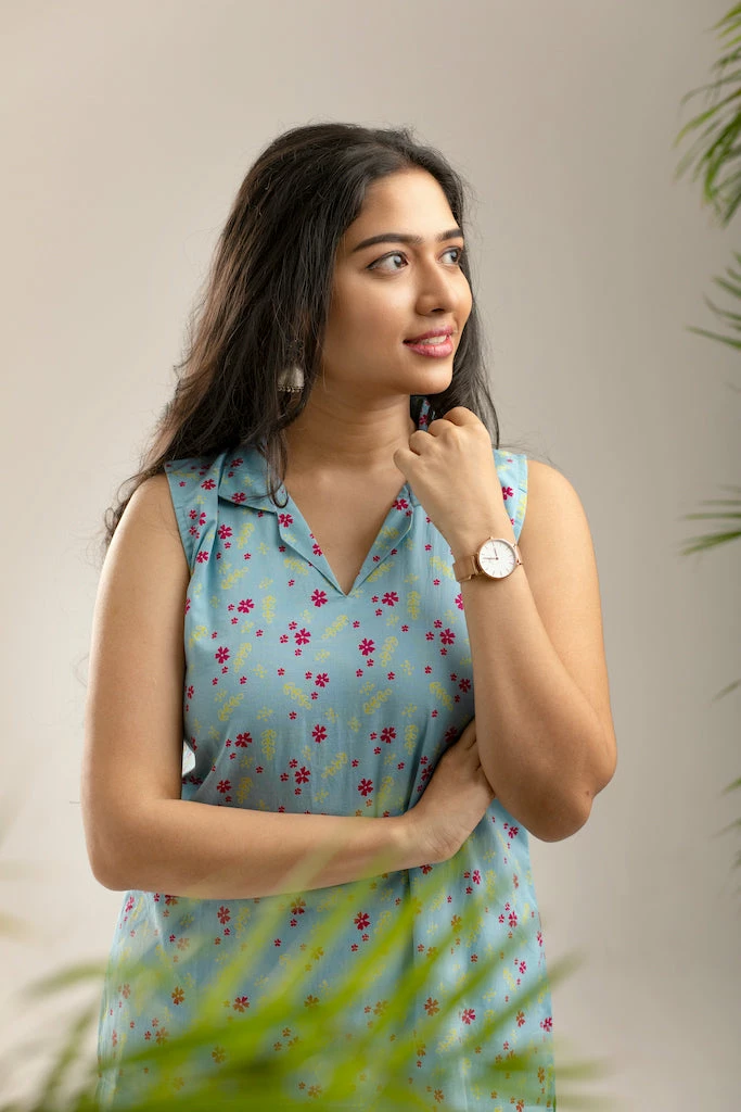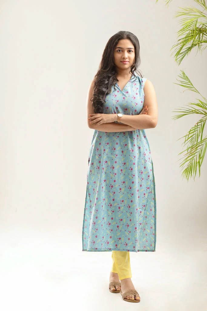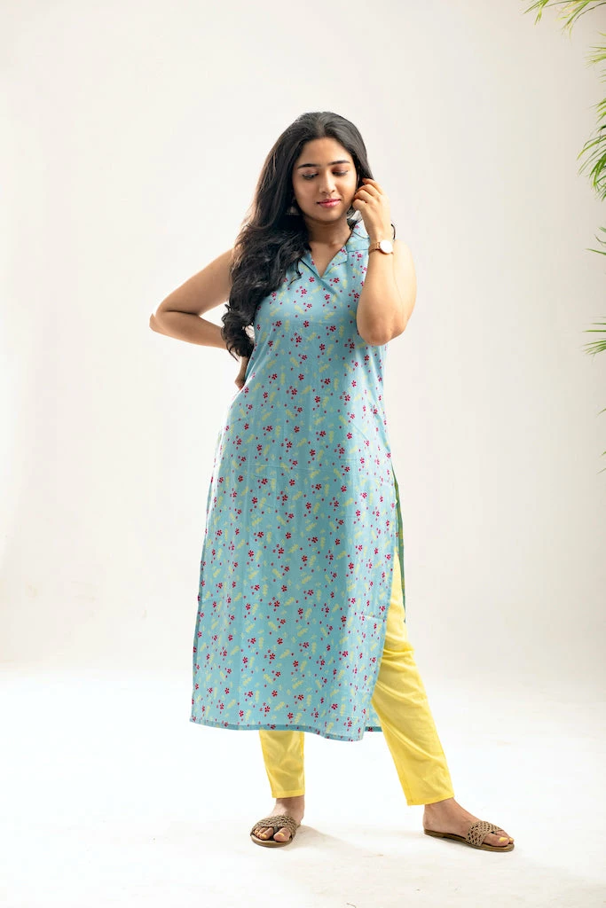 Blue Orange Cotton block printed Kurti paired with contrast yellow cotton pant