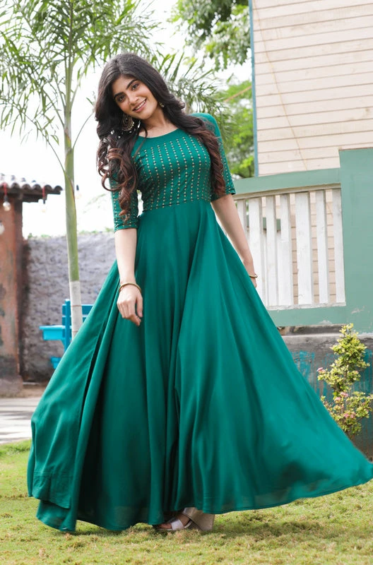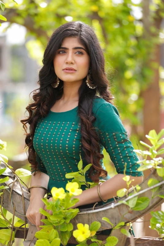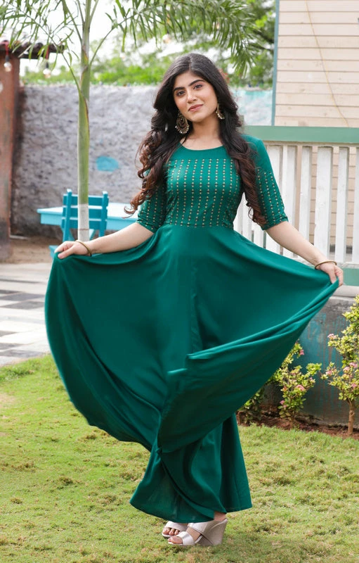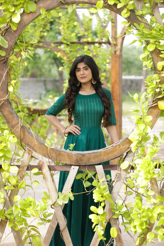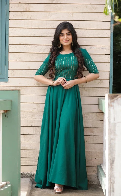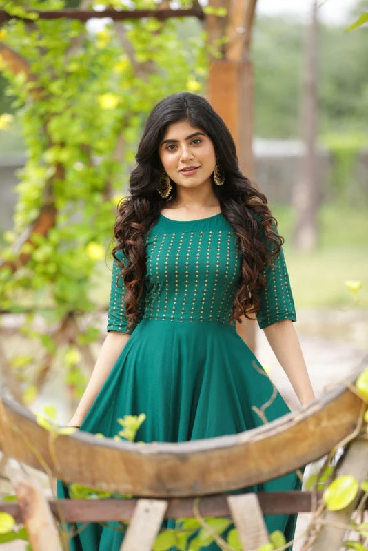 Green Rayon with Printed Yoke and Plain flare in fit and flare silhouette.