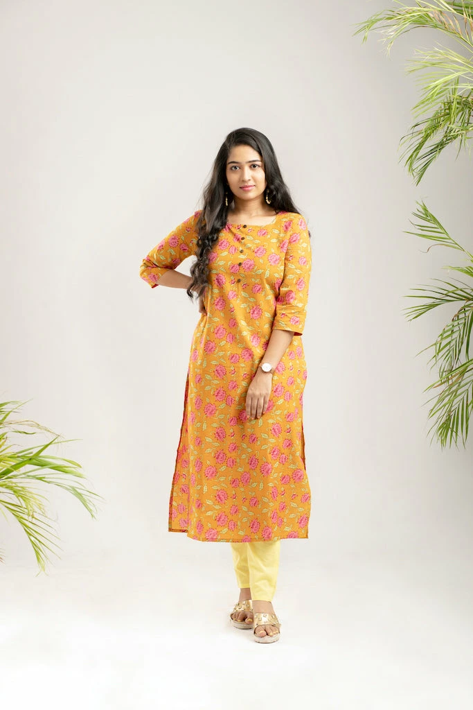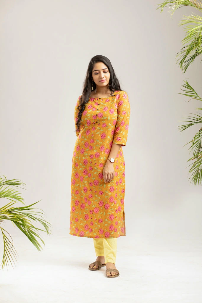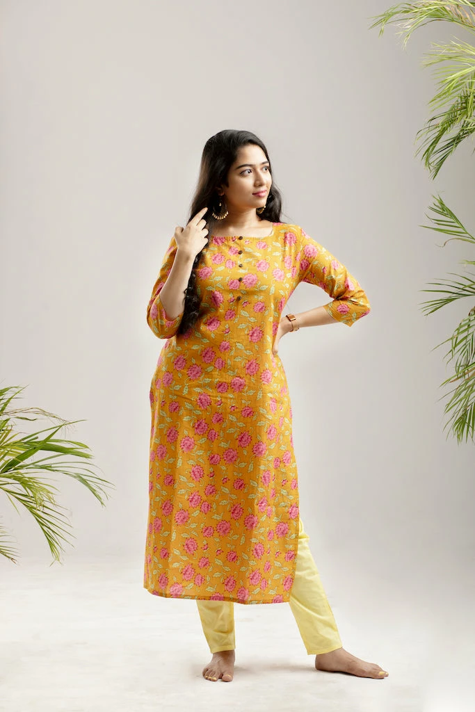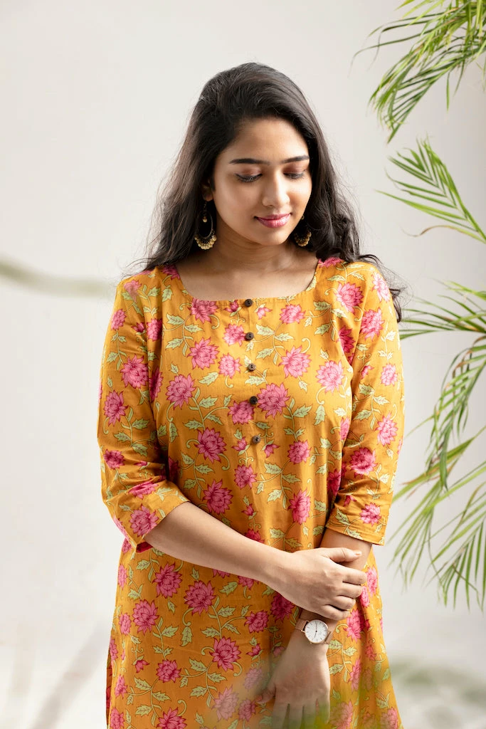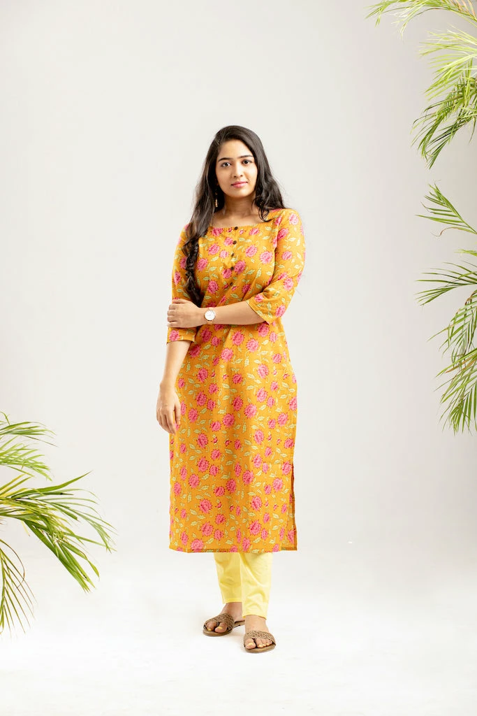 Brownish Orange Cotton block printed Kurti paired with contrast yellow cotton pant