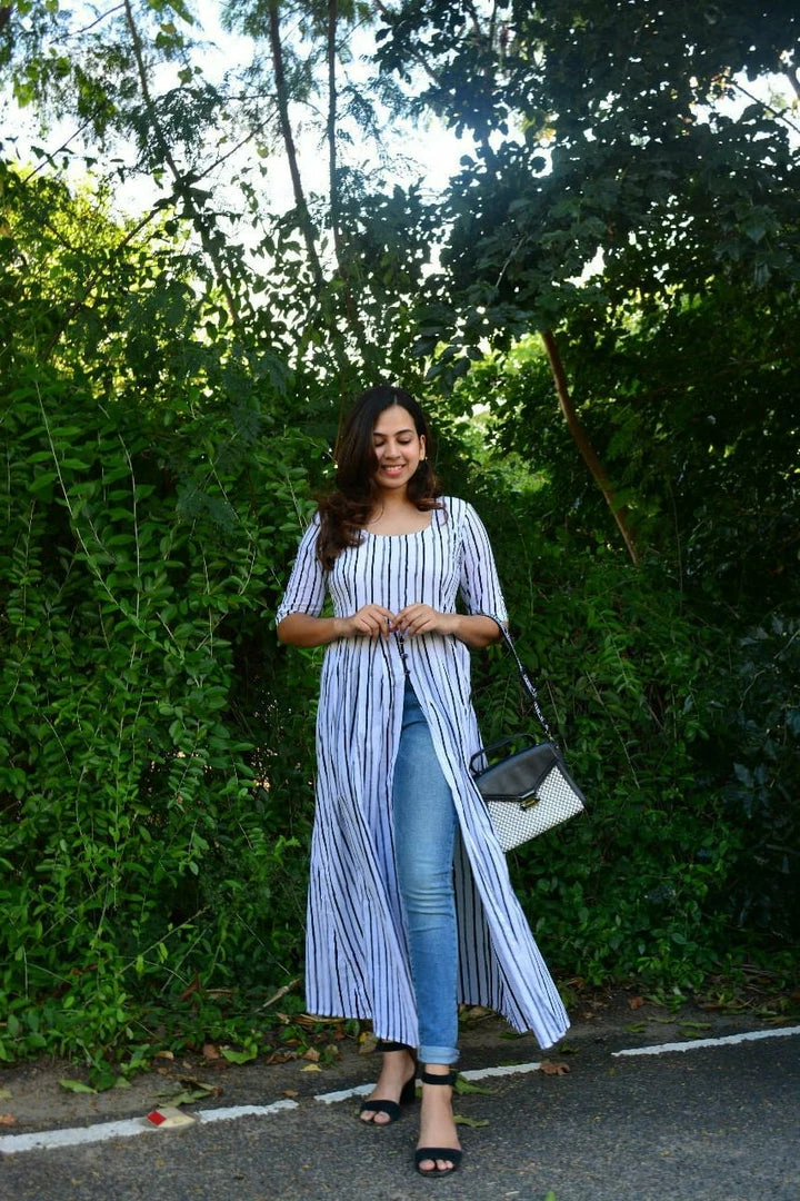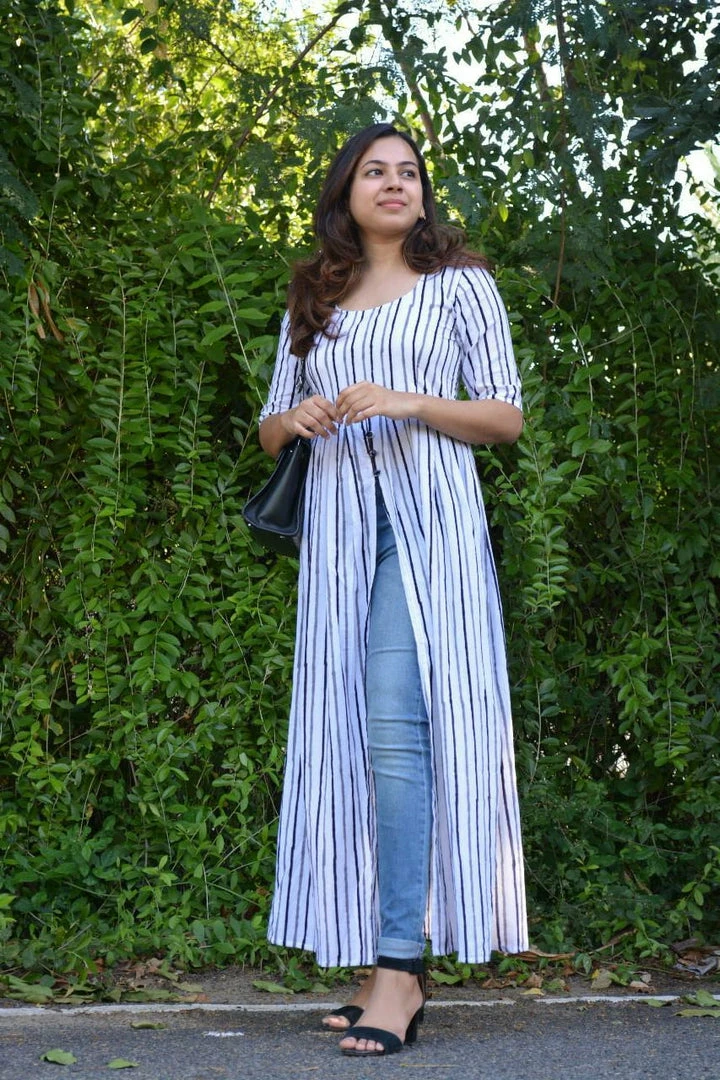 | Front Slit top with stripes can be paired with Jeans, Leggings or any Pants. Top has front buttons in the waist can be opened also |