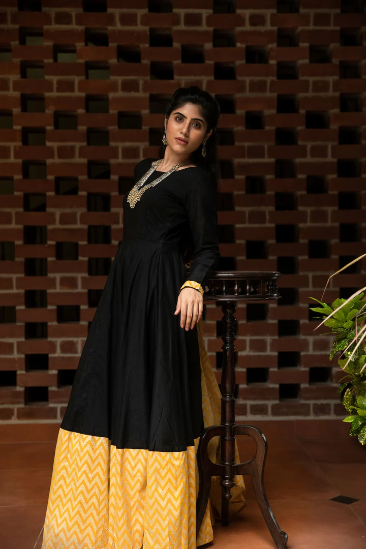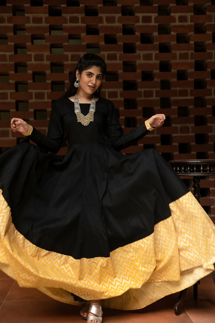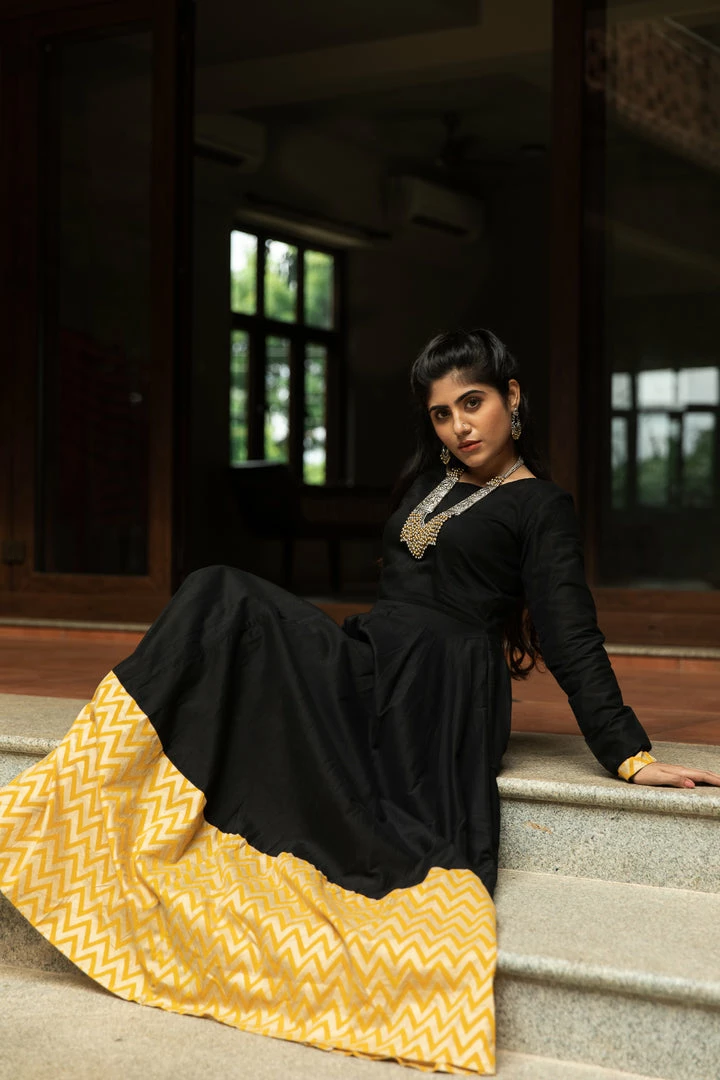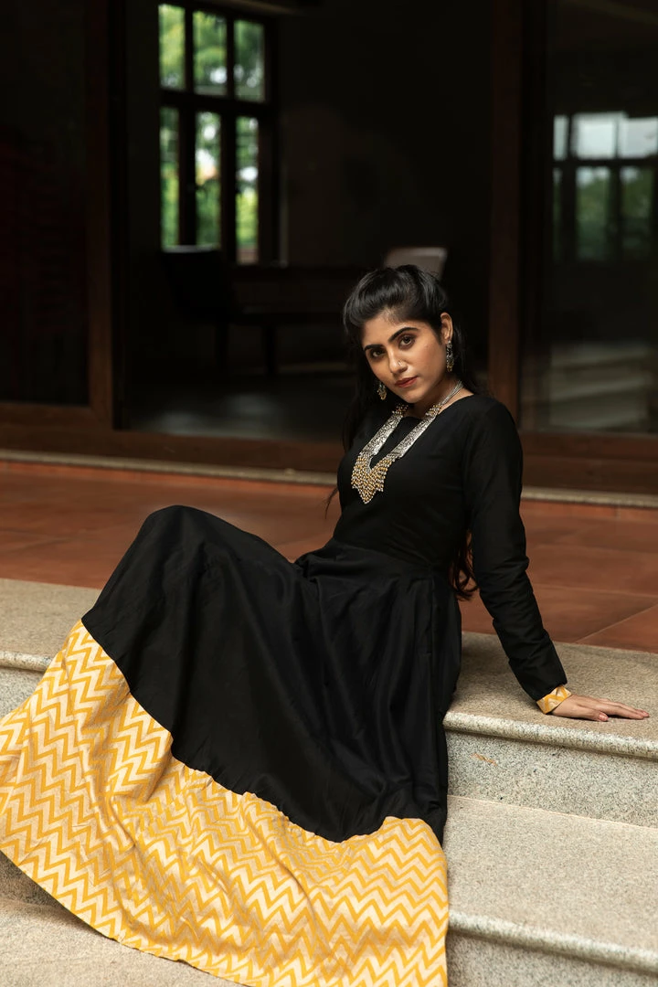 Black Dupion maxi with Zig Zag border and full sleeve.