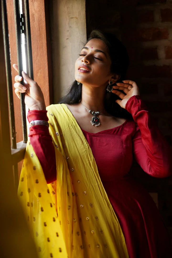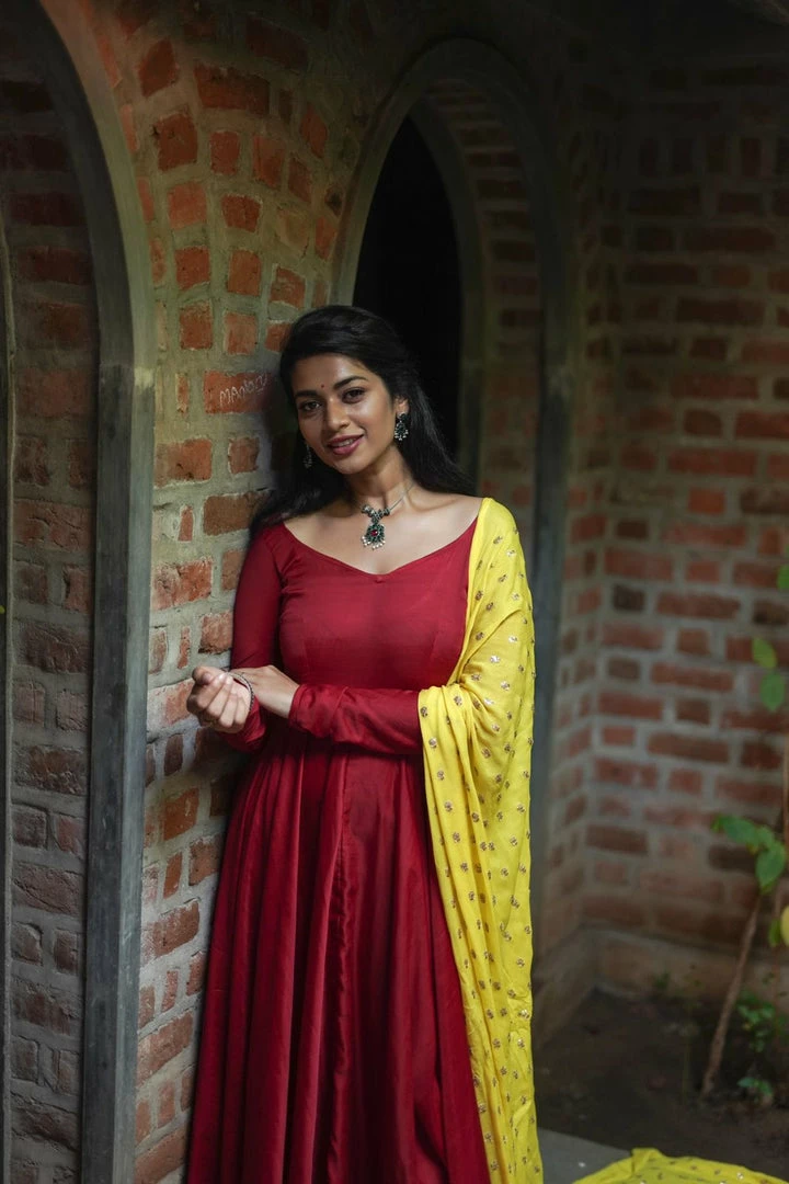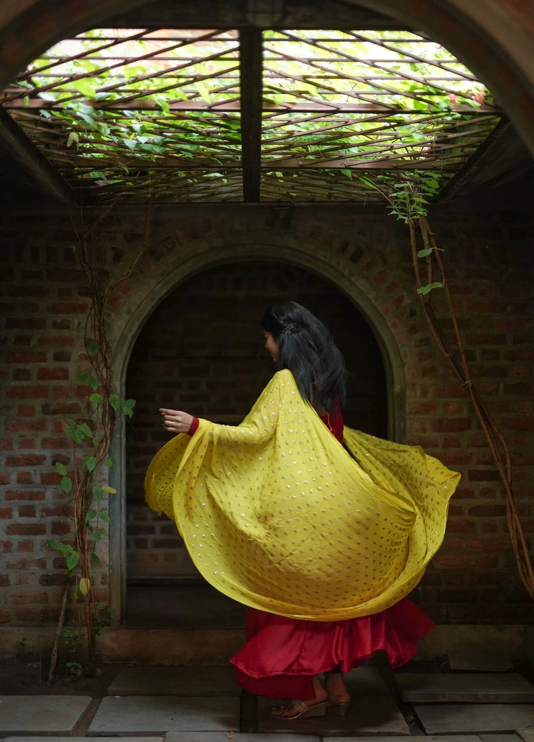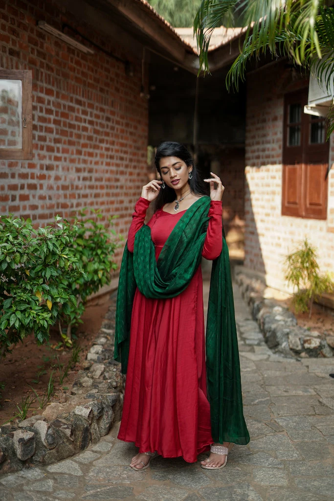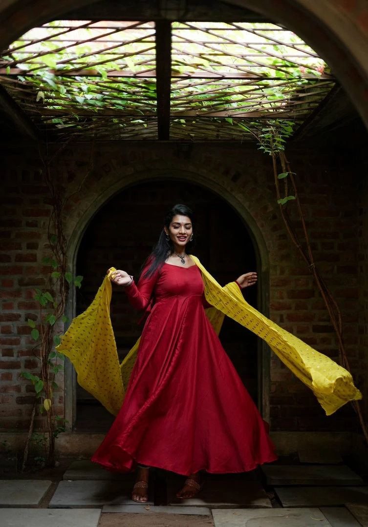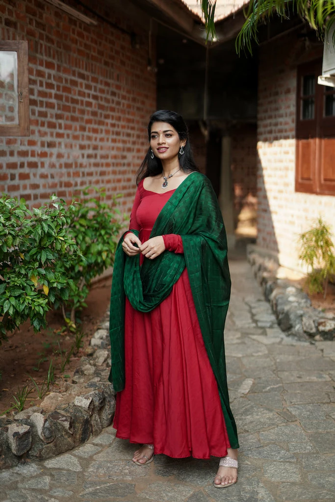simple red dress with double flare is crafted in plain silk fabric. It has a wide neck and full length sleeves. It is paired with a green and yellow dupatta, can choose your preference.