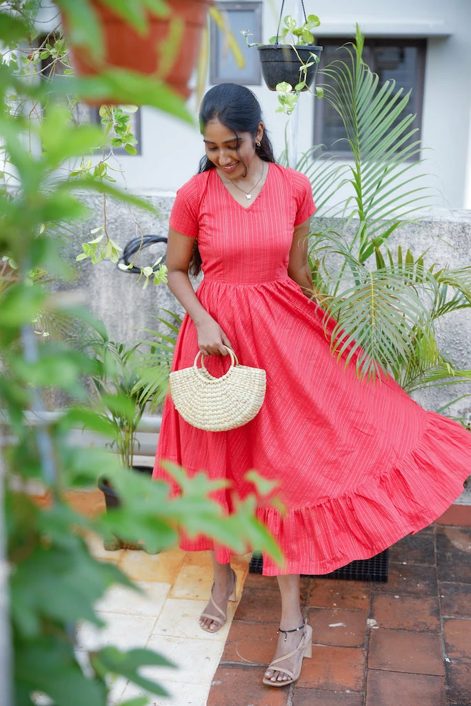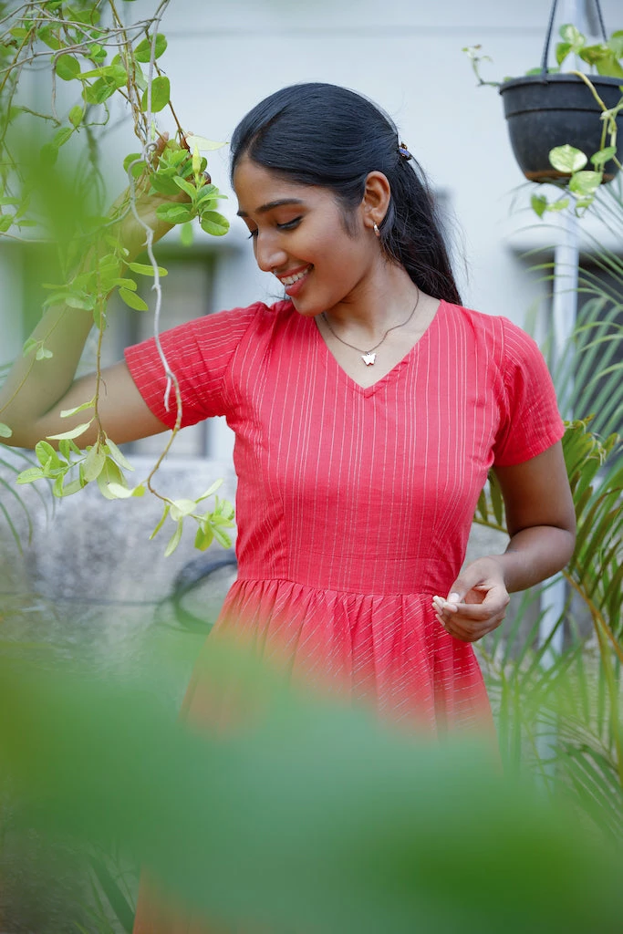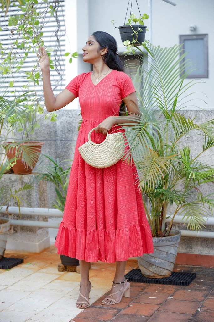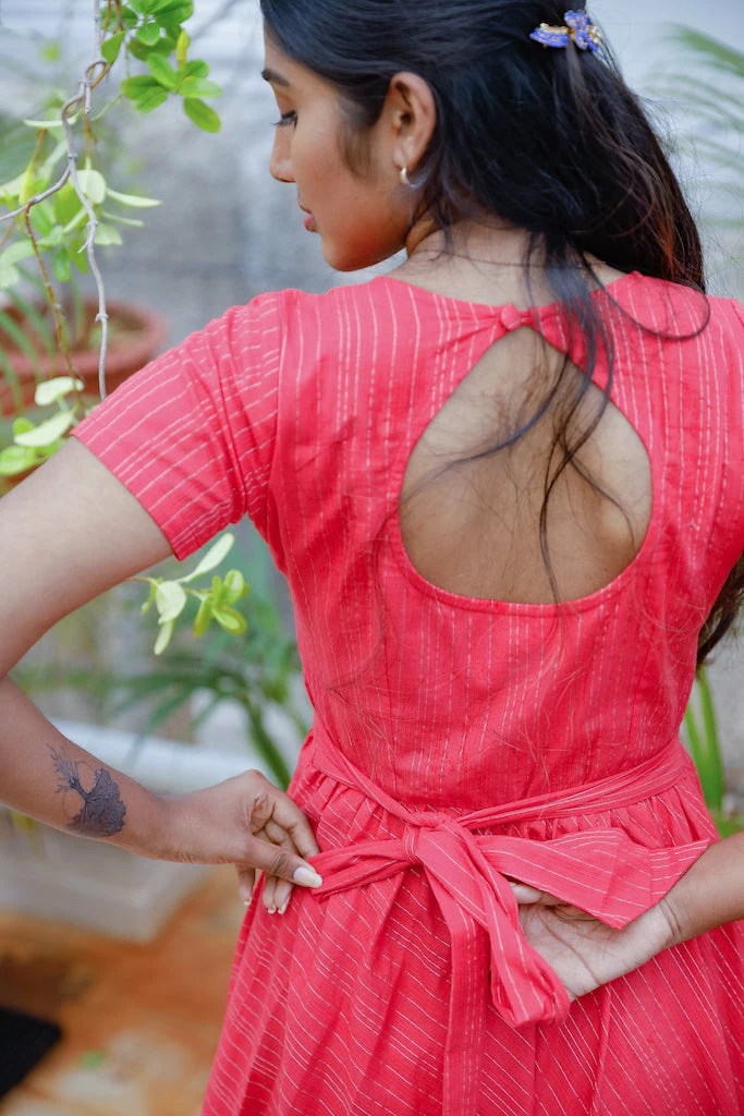 Pink cotton dress with silver zari lines is a simple outfit yet festive for your day