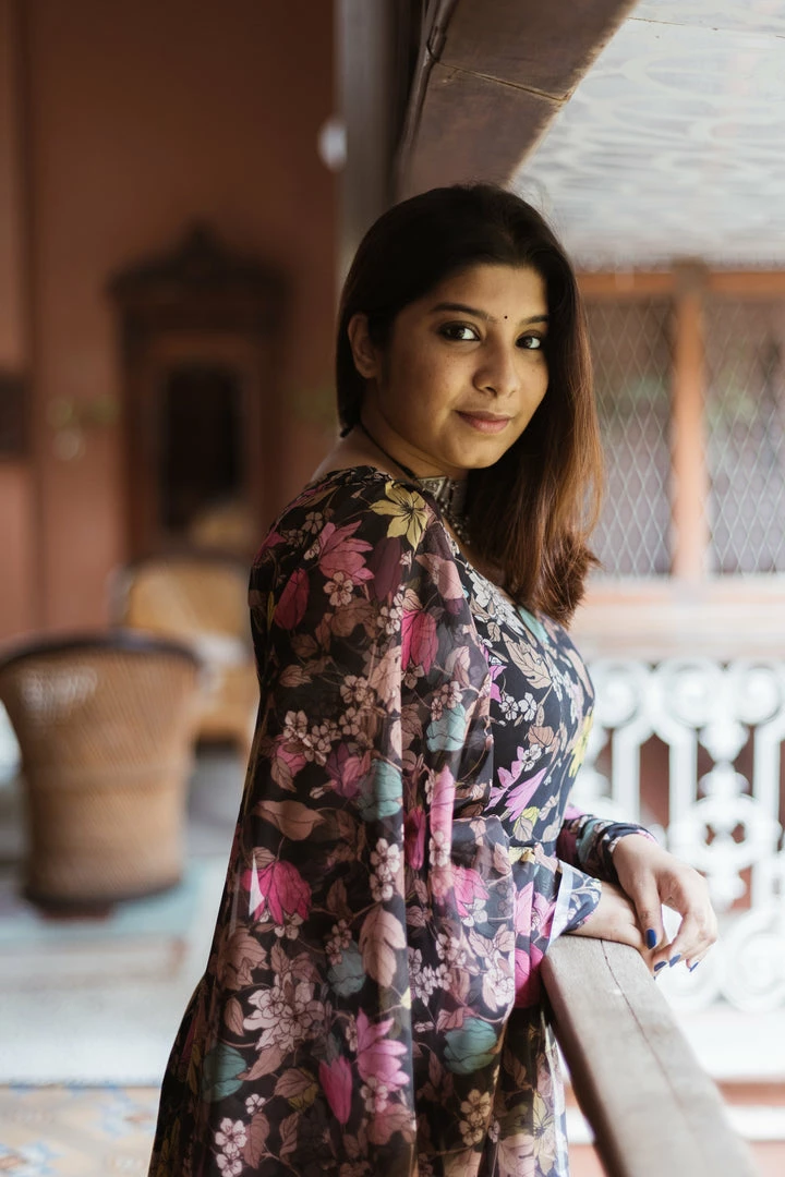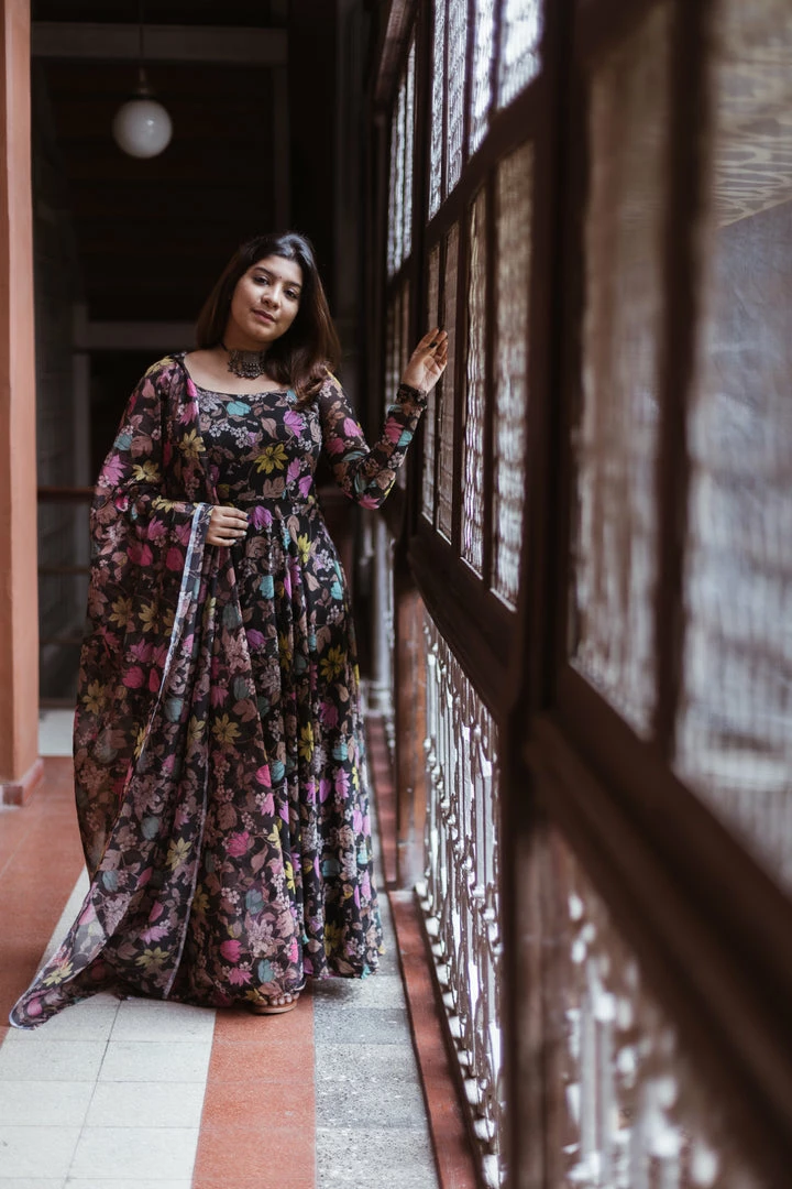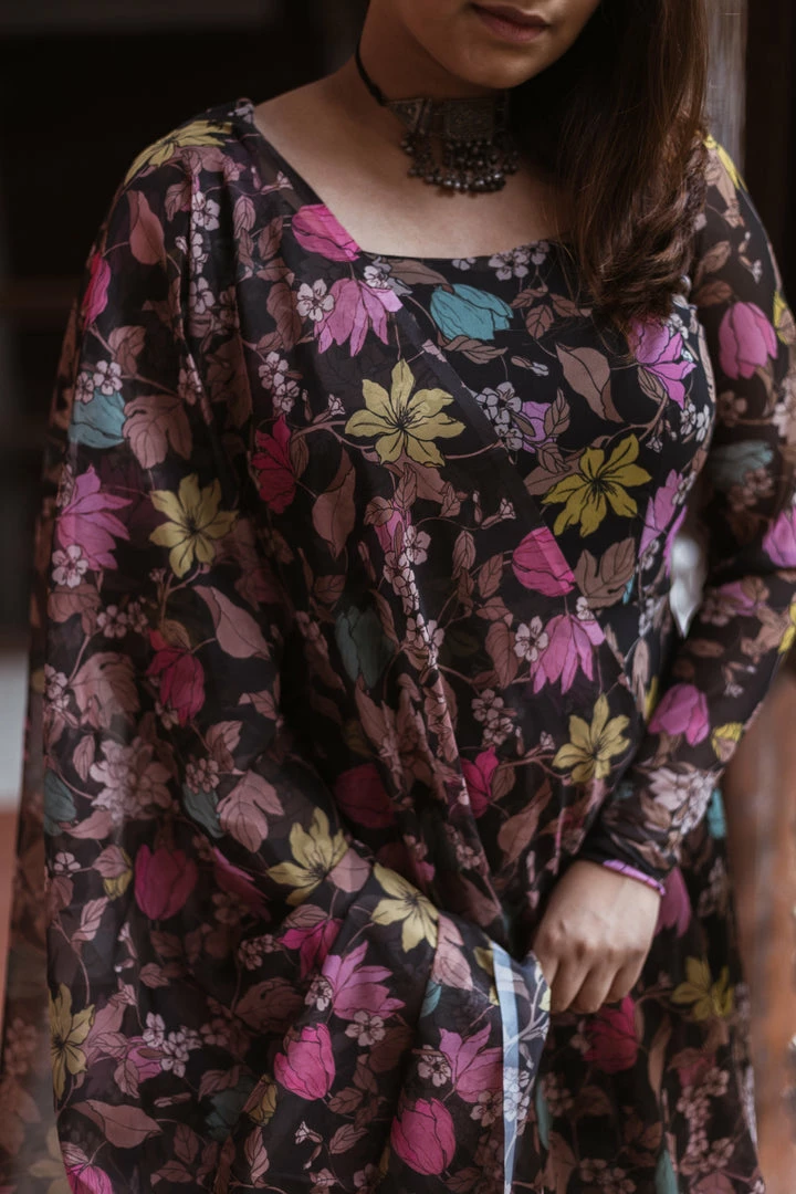 Black floral georgette printed dress paired with self printed Organza dupatta