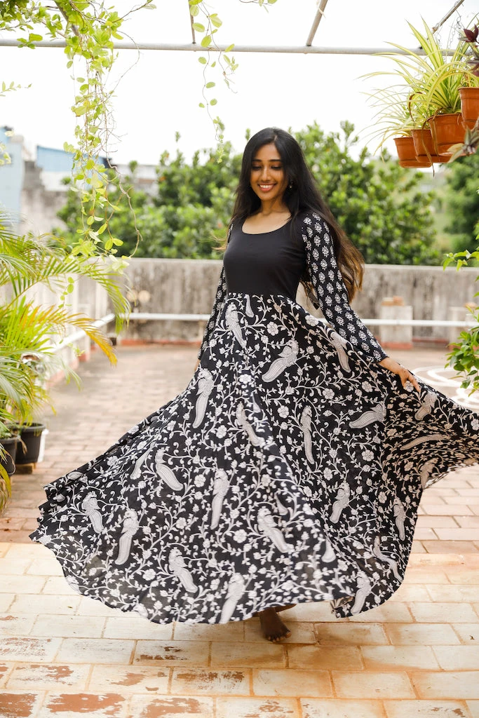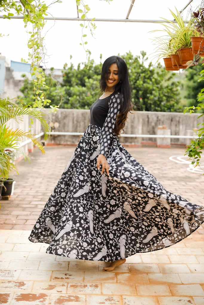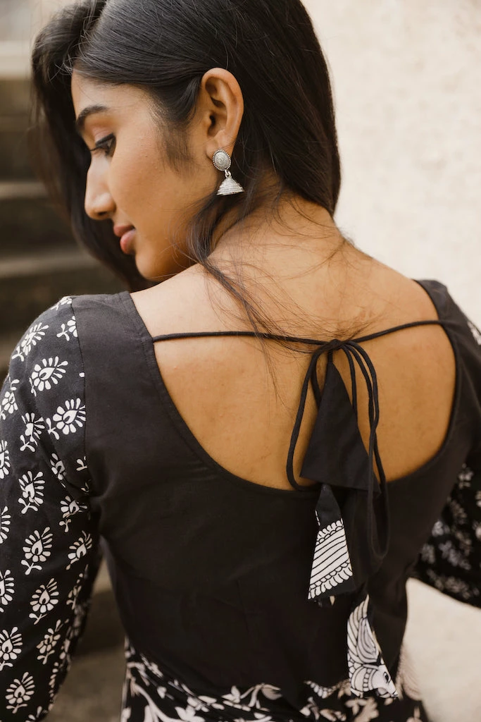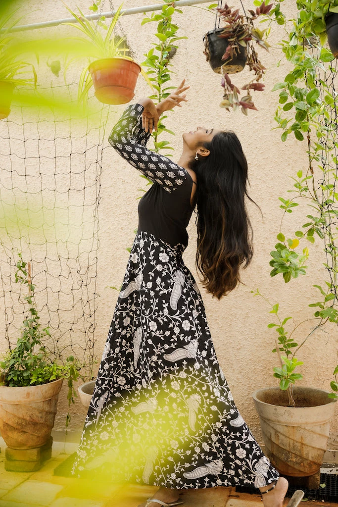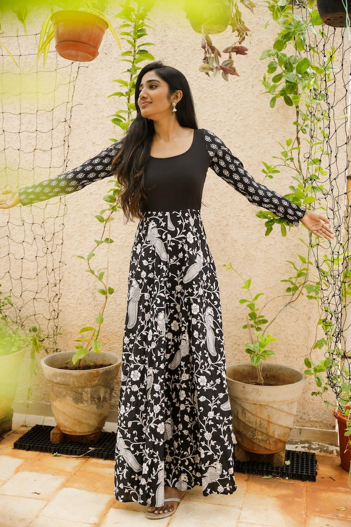 Black Kalamkari Peacock print with plain yoke and printed sleeveÂ