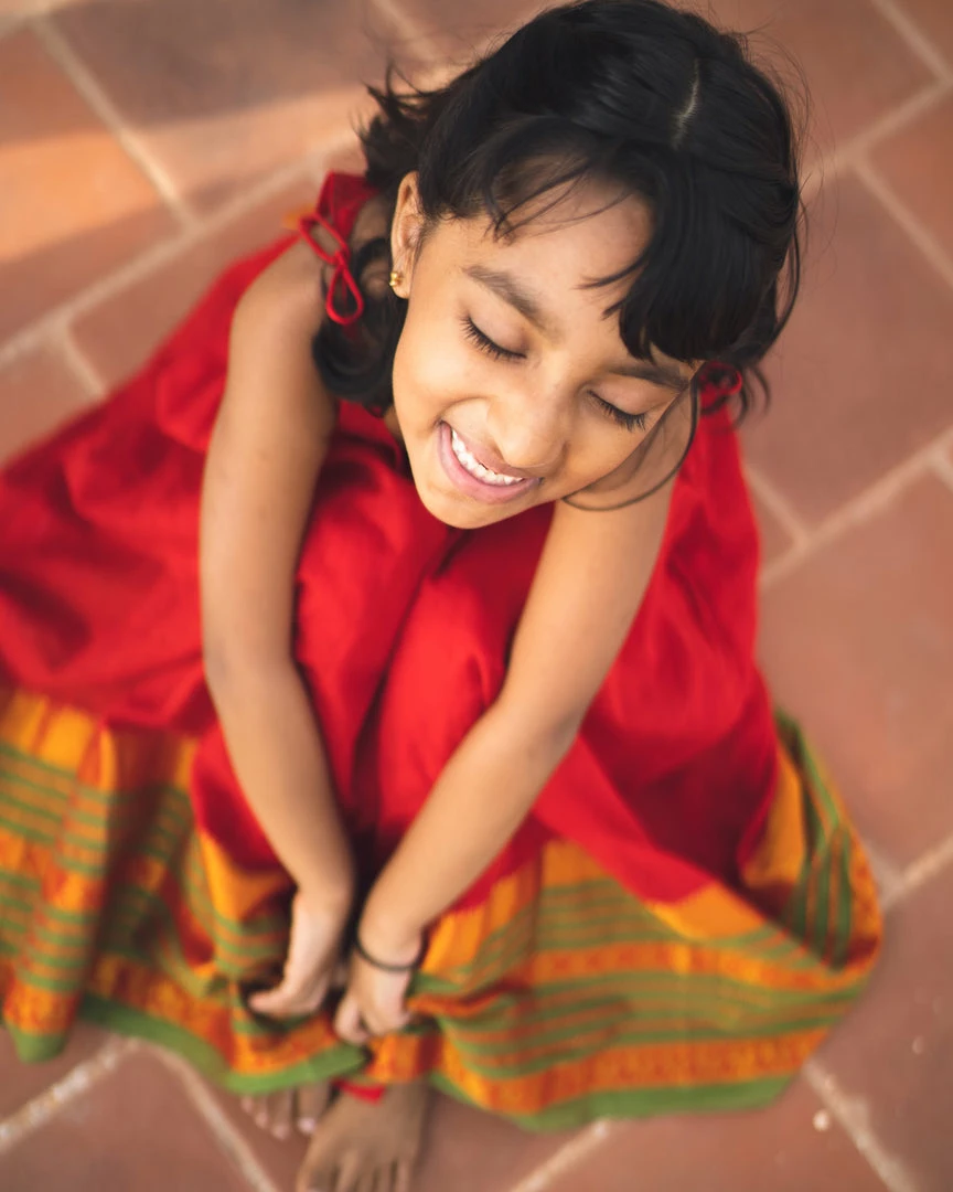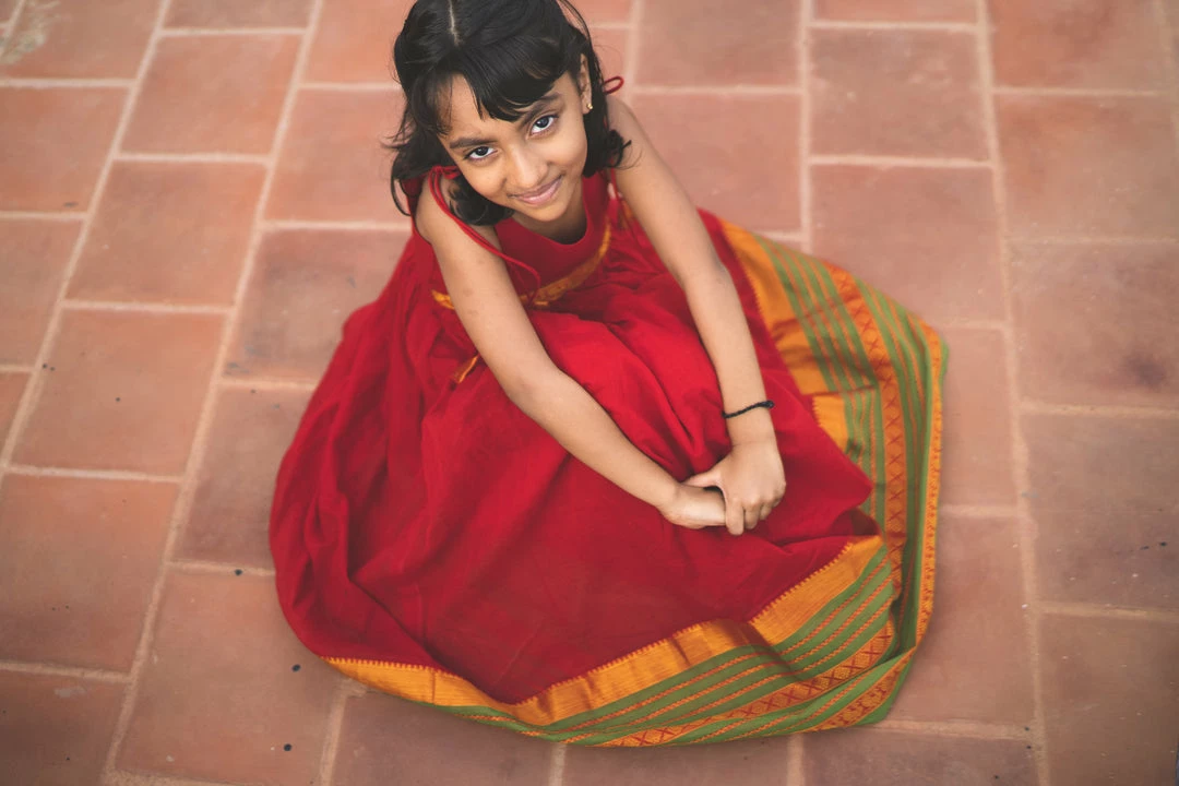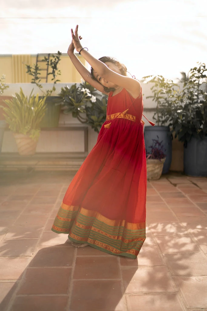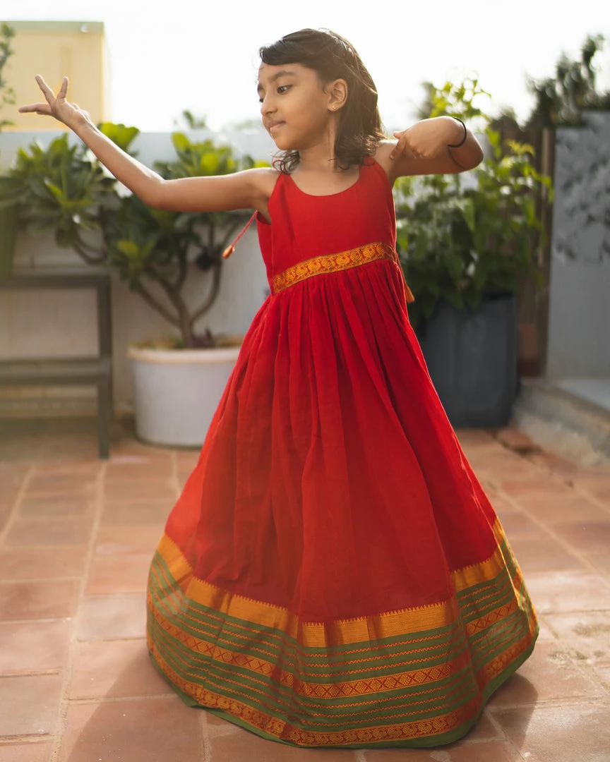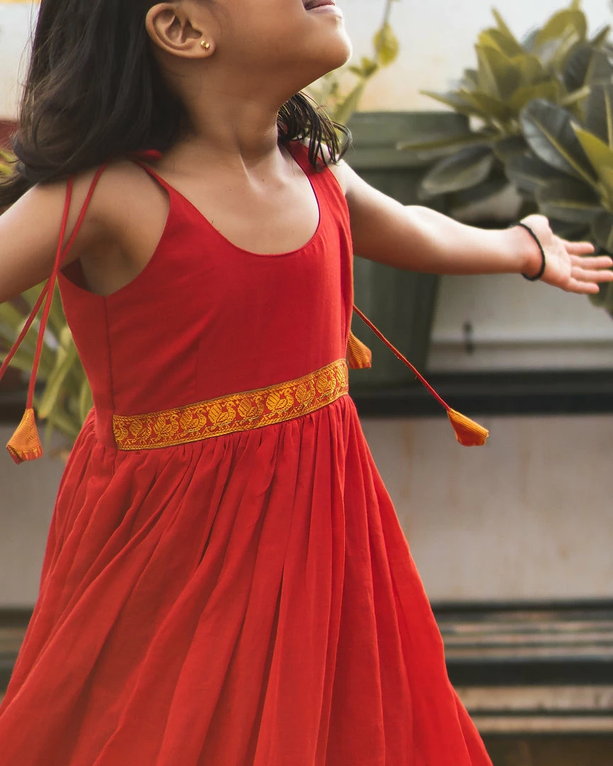 Sleeveless Narayanpet dress with Zari as border and as patch on waist is a comfort festive wear for kids