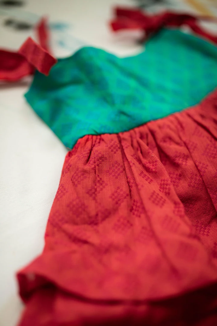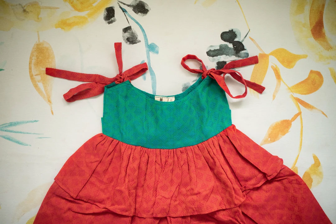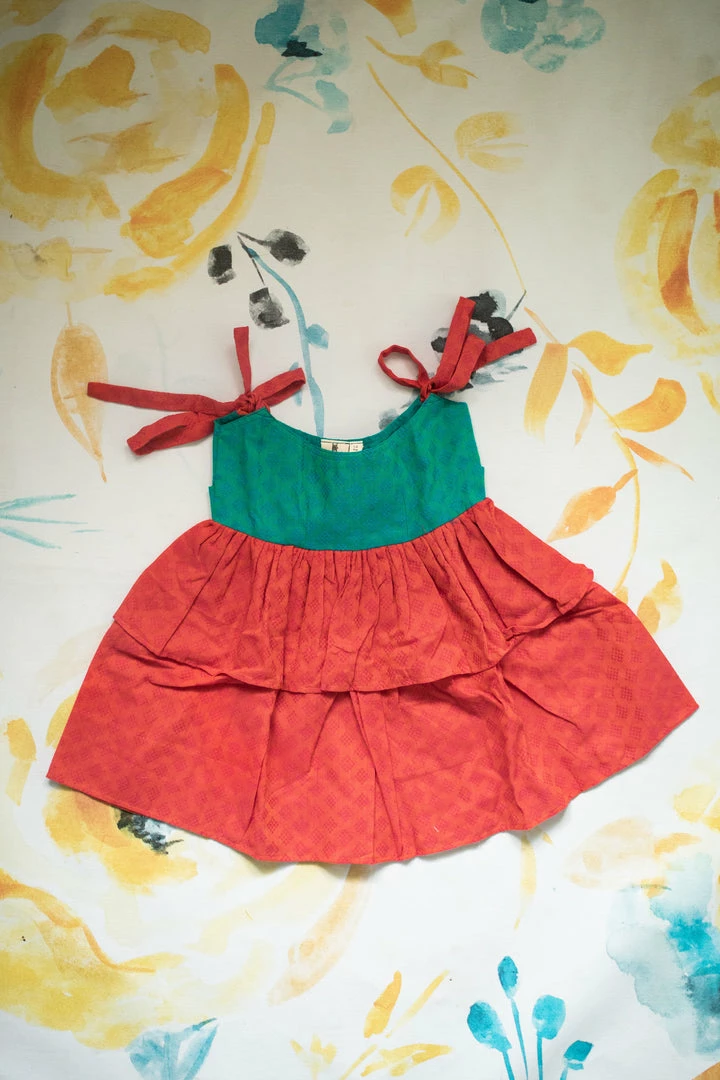 A pure cotton two tiered dress finished with knots on shoulders. This is a knee-length dress and it is partially lined. We suggest that you cross check your body measurements with our size chart. This will help you to choose the right size.