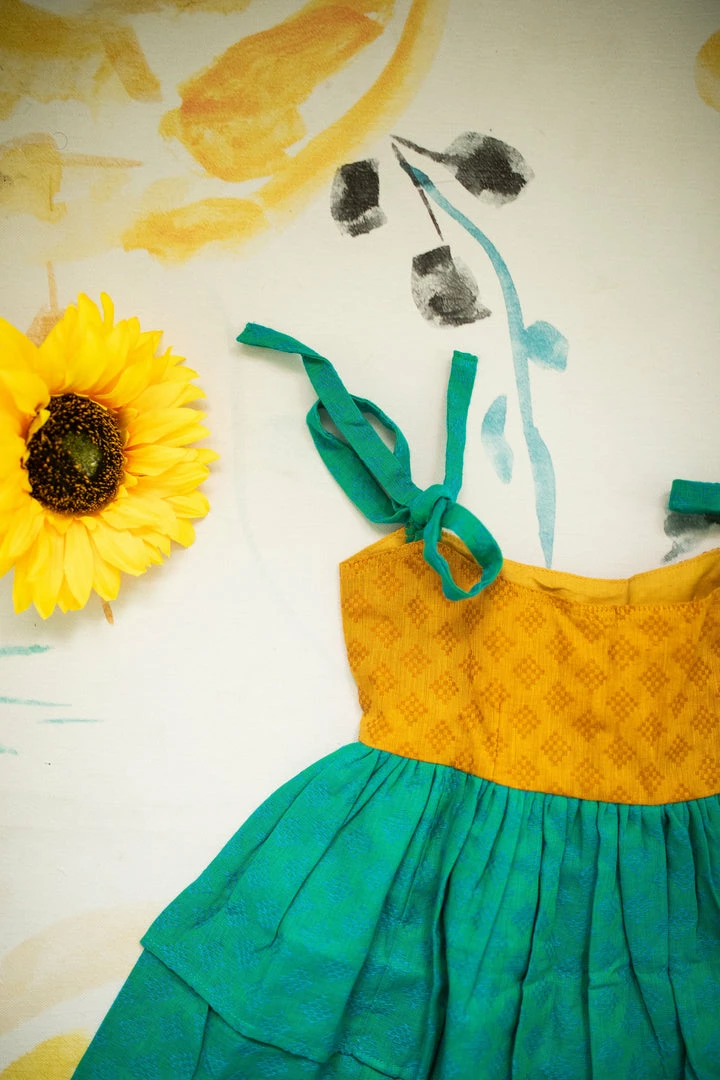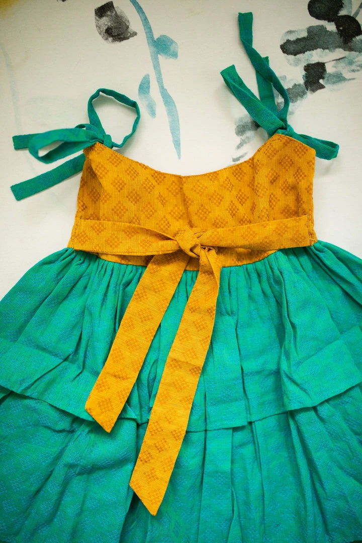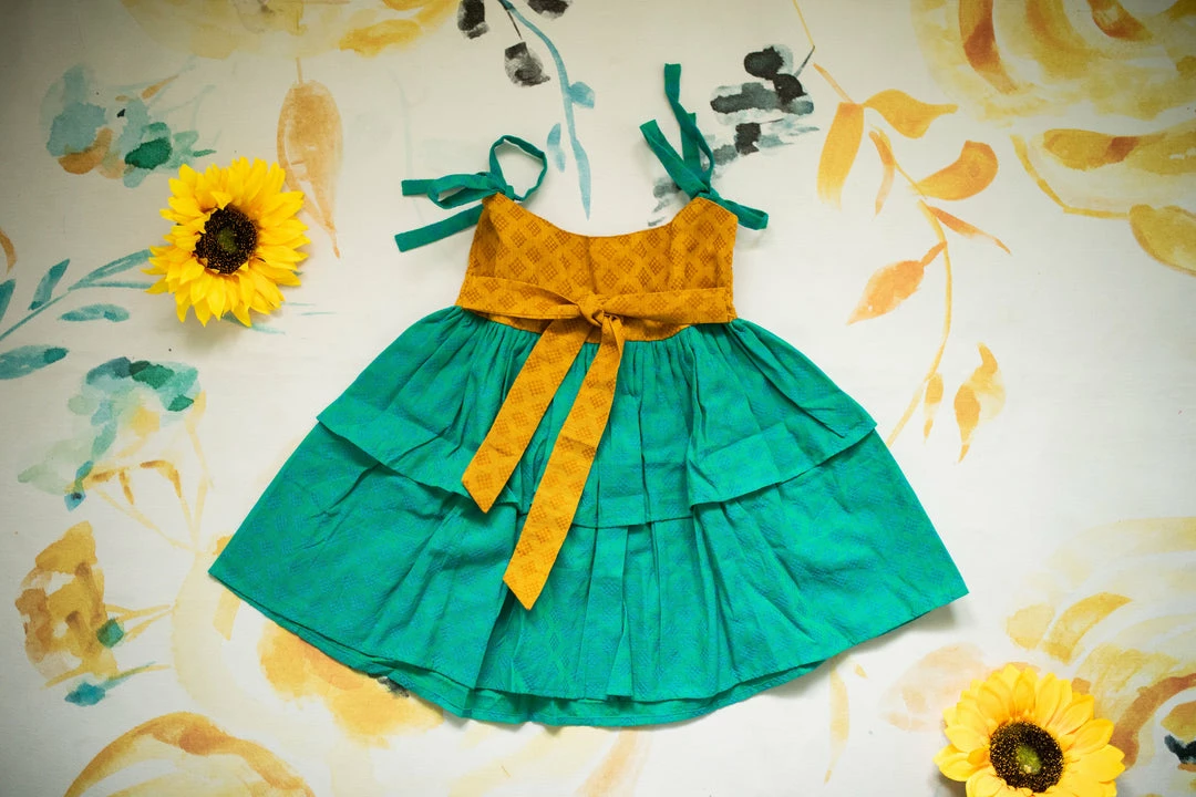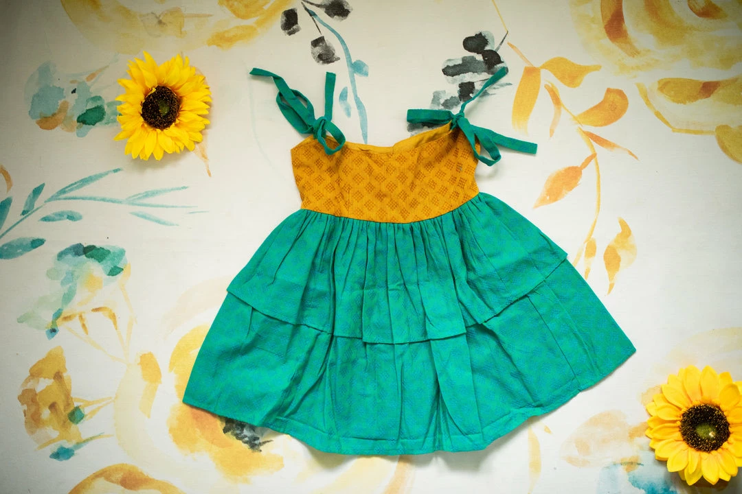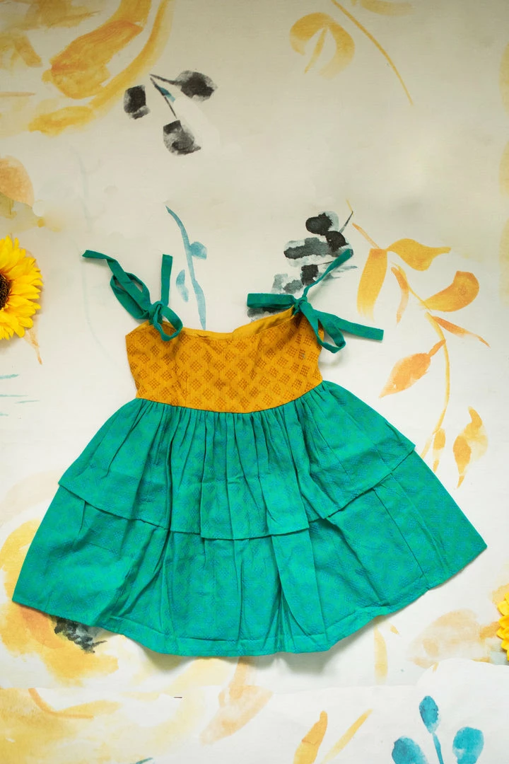 A pure jacquard cotton two tiered dress finished with knots on shoulders. This is a knee-length dress and it is partially lined. We suggest that you cross check your body measurements with our size chart. This will help you to choose the right size.