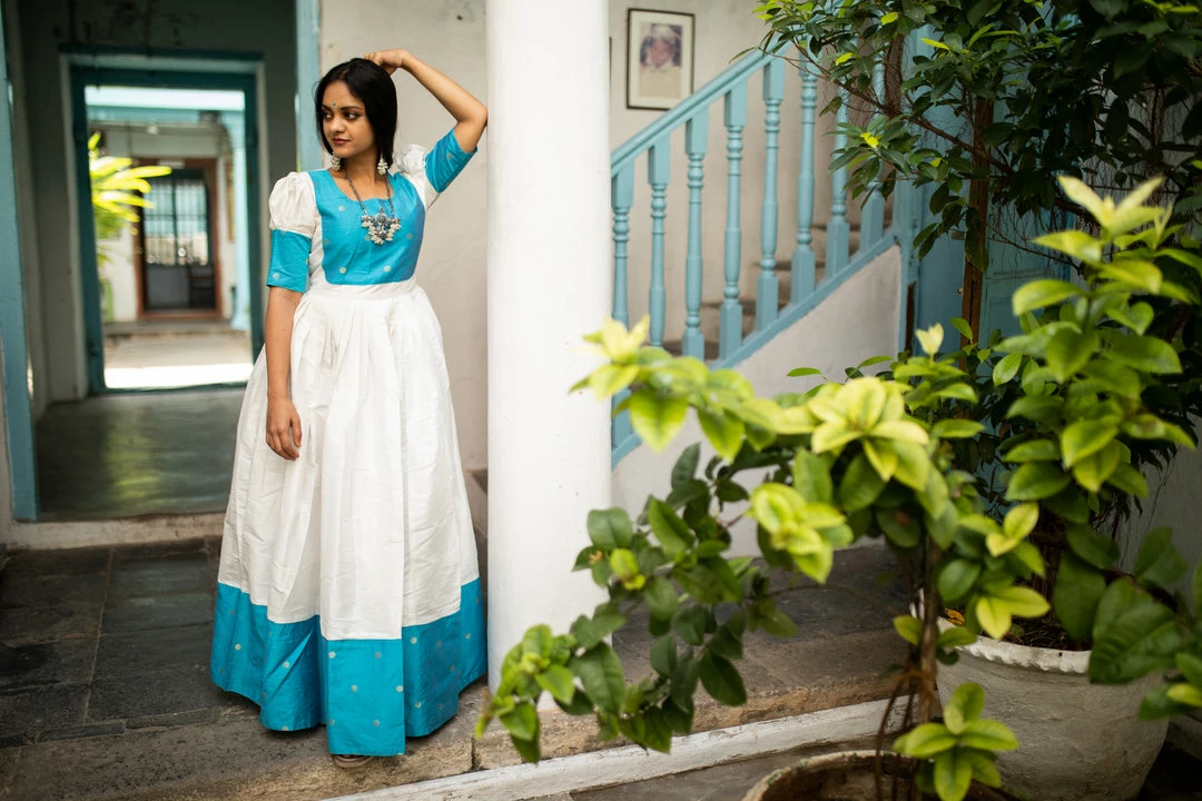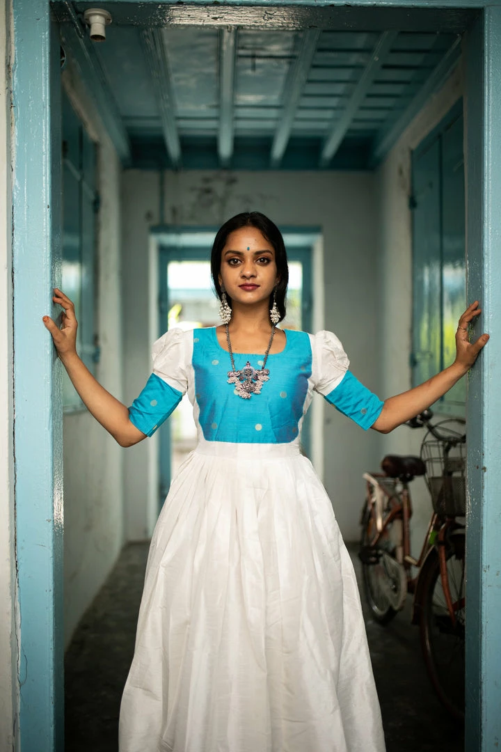 A green raw silk anarkali finished with reddish-pink butta dupion for yoke, sleeves and border. This anarkali is fully lined and comes with a back zipper.