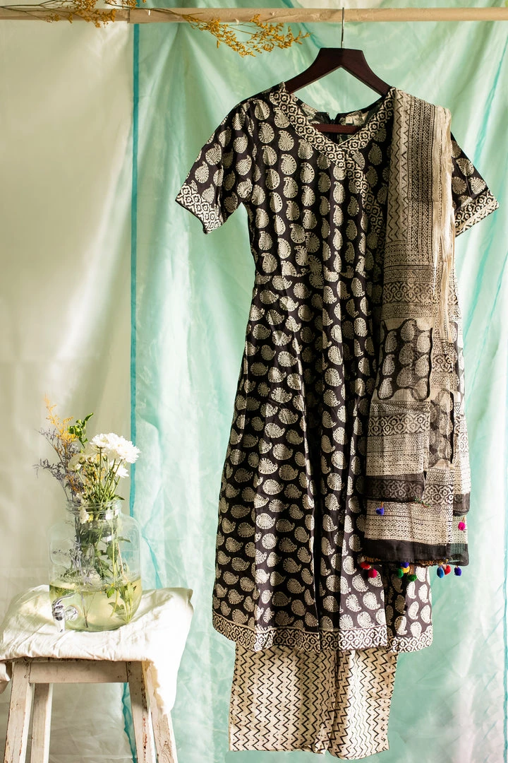 A pure handblock printed cotton suit set matched with a cotton kota duppatta. Please scroll down and check the tab “size guide” before selecting your size from the variants. We suggest that you cross check your body measurements with our size chart. This will help you to choose the right size.