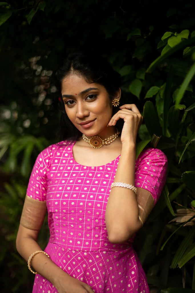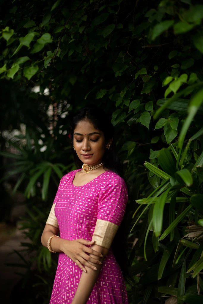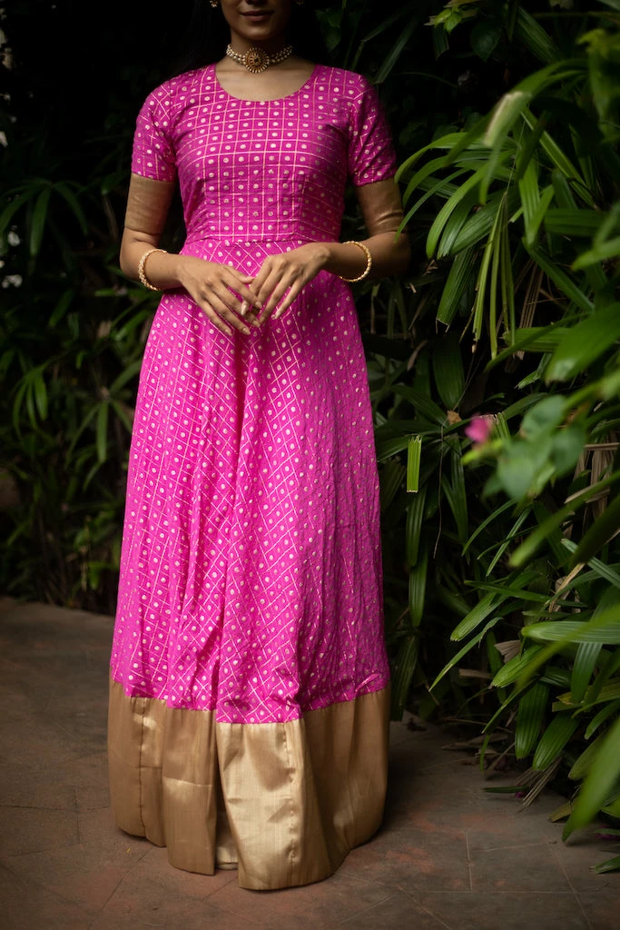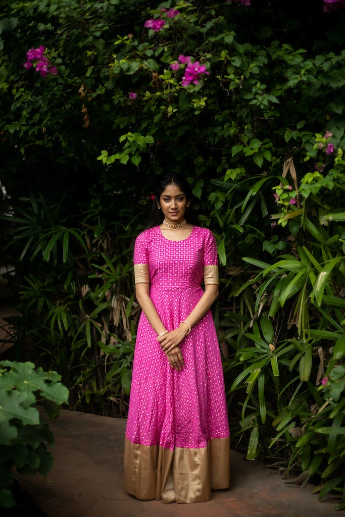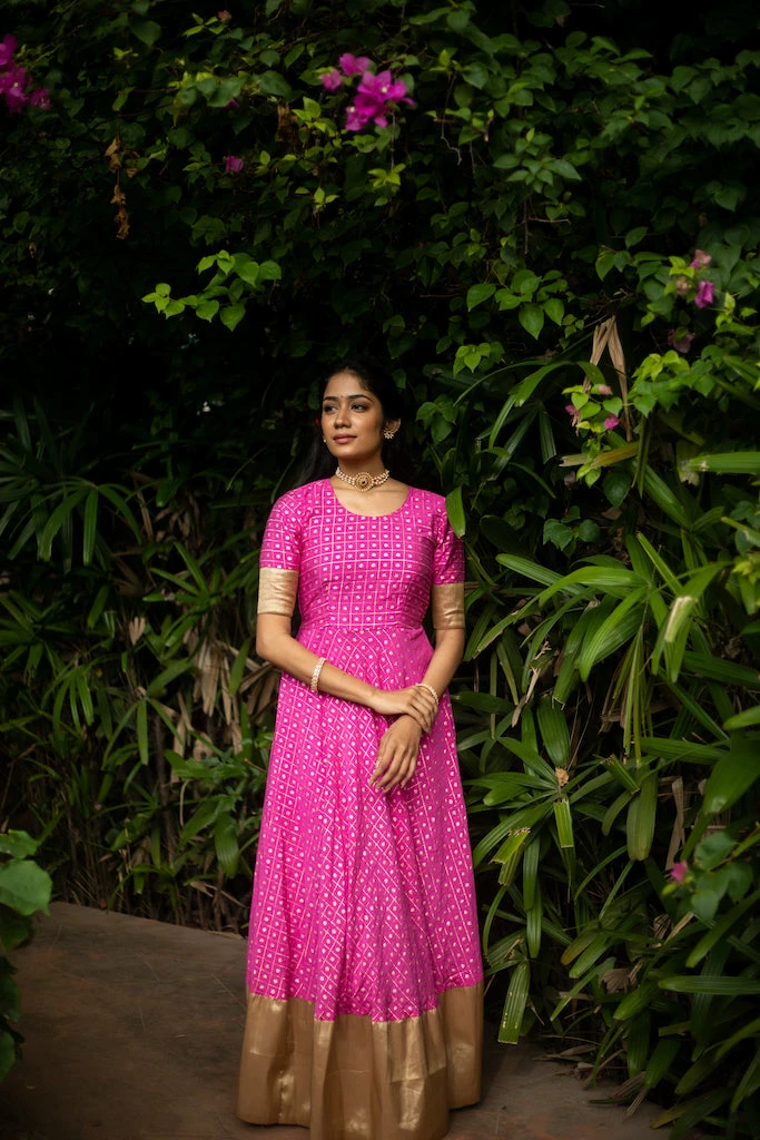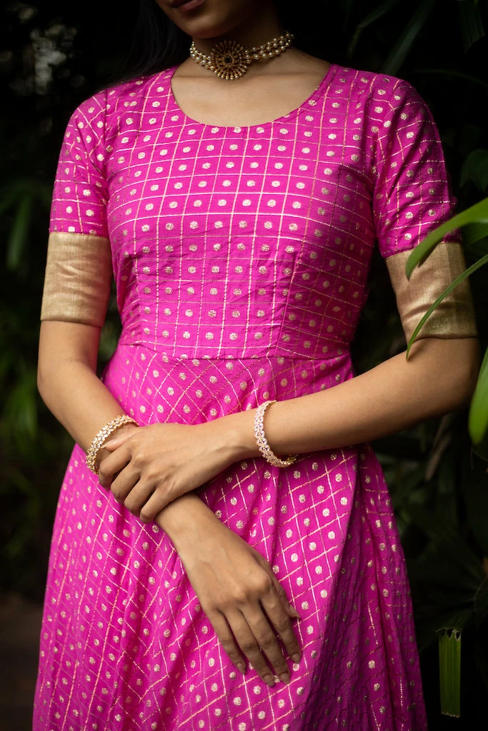 An anarkali made with pink chanderi zari silk finished with tissue borders. This anarkali is fully lined and does NOT come with pants or leggings. Please scroll down and check the tab “size guide” before selecting your size from the variants. We suggest that you cross check your body measurements with our size chart. This will help you to choose the right size.