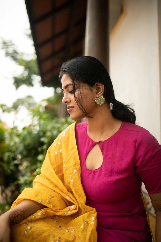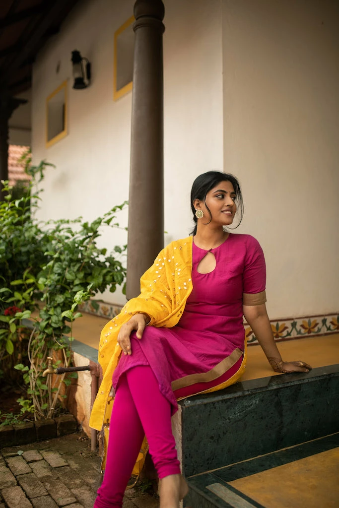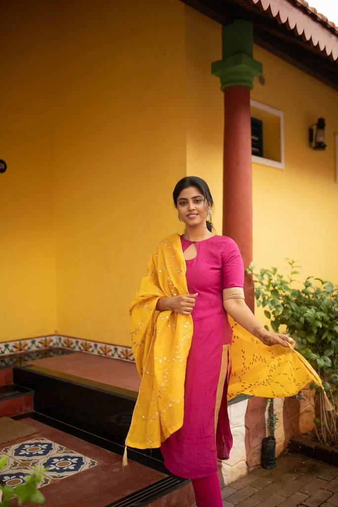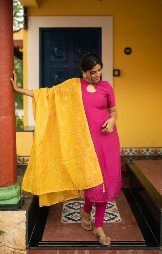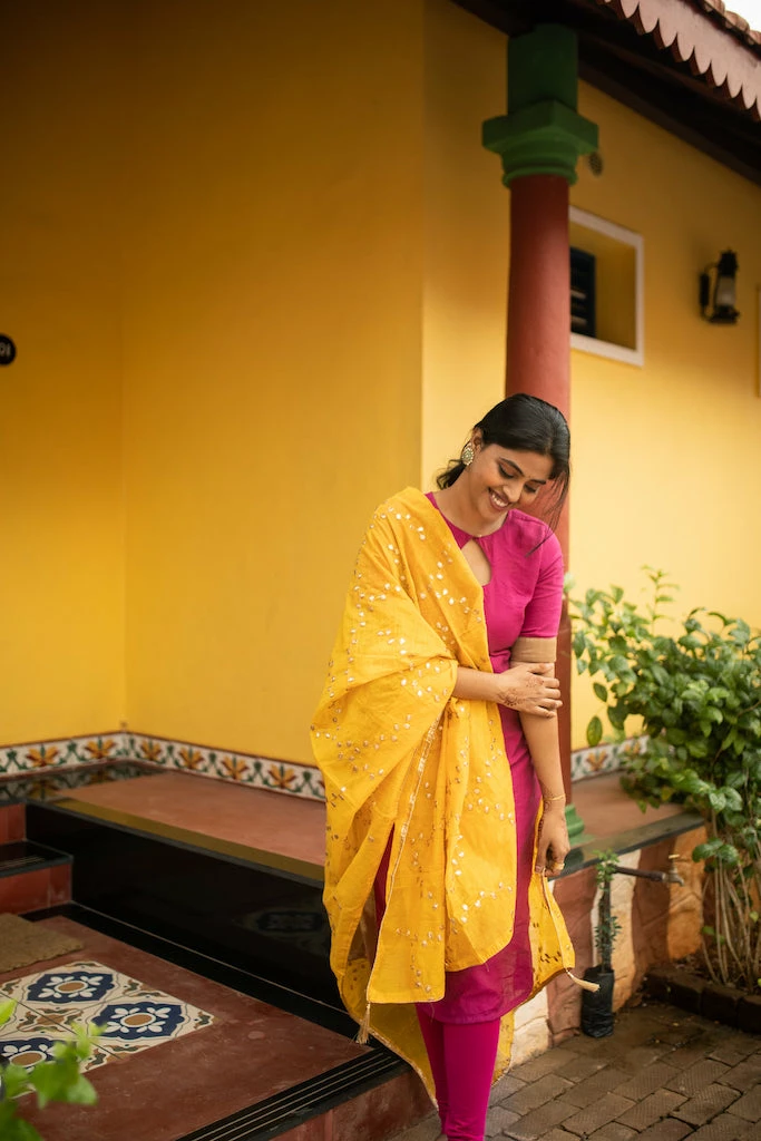 A chanderi silk top finished with gold tissue borders, is paired with an yellow gota work duppatta. This top is fully lined and does not come with pants or leggings. We suggest that you cross check your body measurements with our size chart. This will help you to choose the right size.