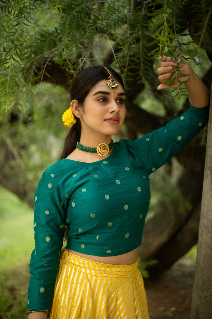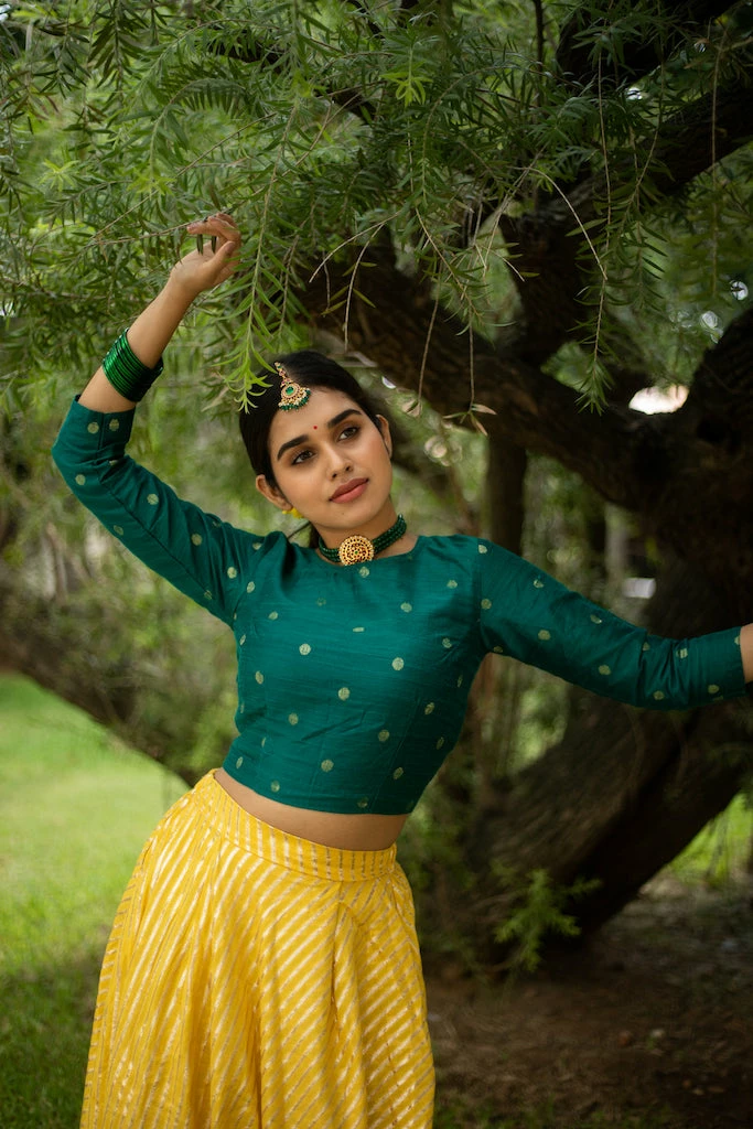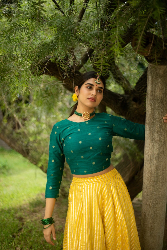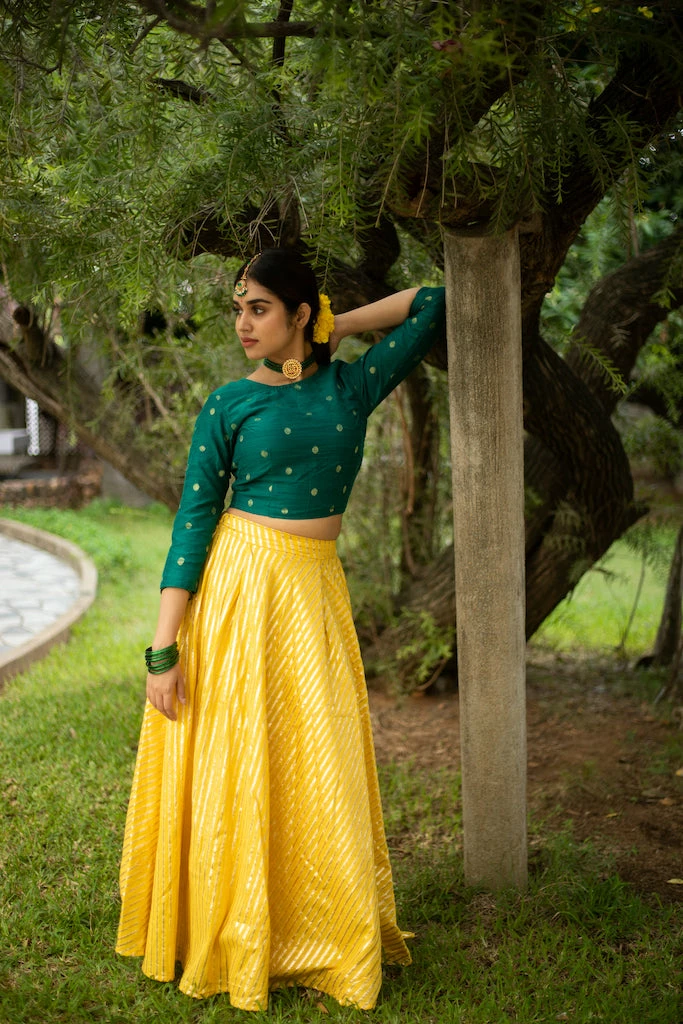 A pure rich chanderi zari skirt paired with a butta dupion top. This set is fully lined. Please scroll down and check the tab “size guide” before selecting your size from the variants. We suggest that you cross check your body measurements with our size chart. This will help you to choose the right size.