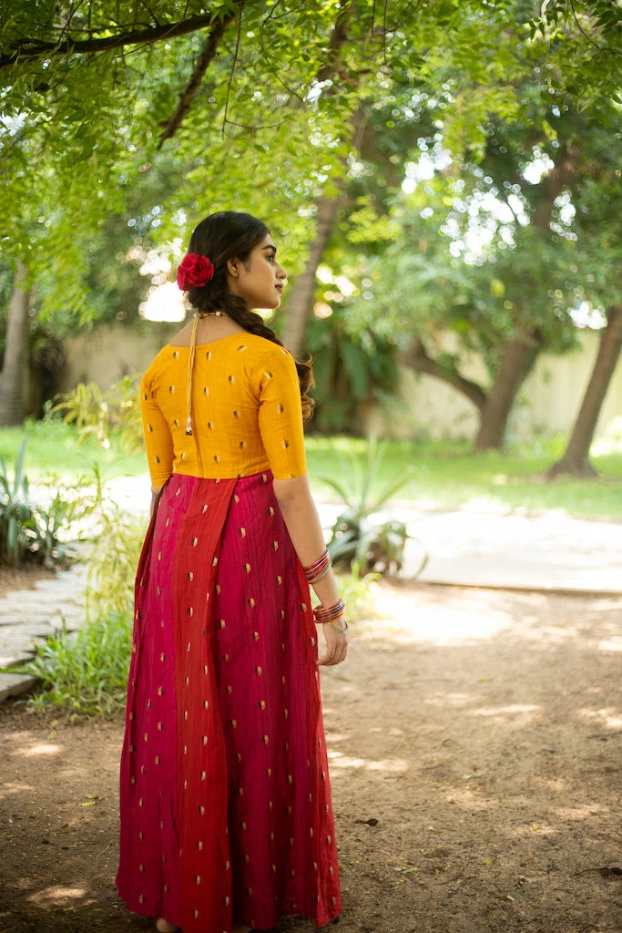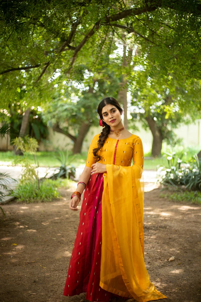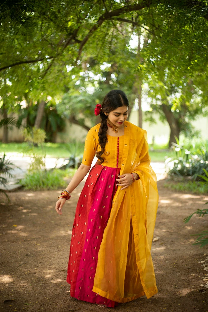 A kota rayon silk anarkali finished with pink and red alternate kalis, matched with an organza duppatta. This top is fully lined except for sleeves and does NOT come with pants or leggings. Please scroll down and check the tab “size guide” before selecting your size from the variants. We suggest that you cross check your body measurements with our size chart. This will help you to choose the right size.
