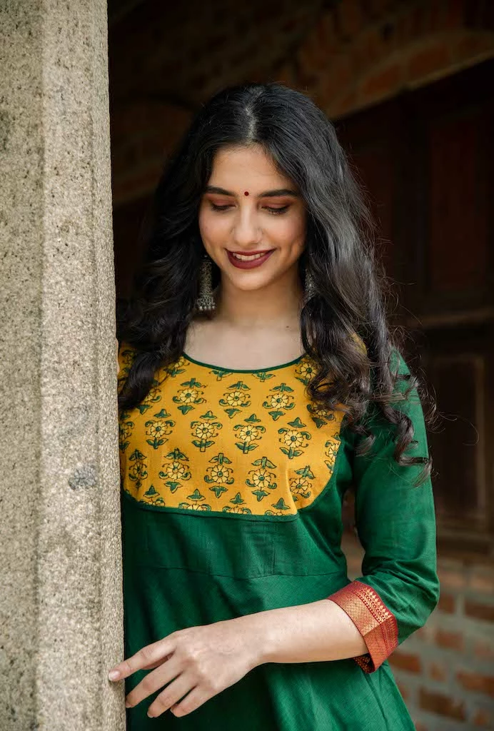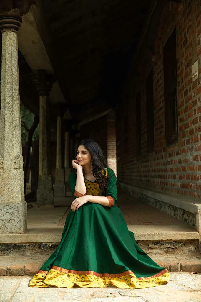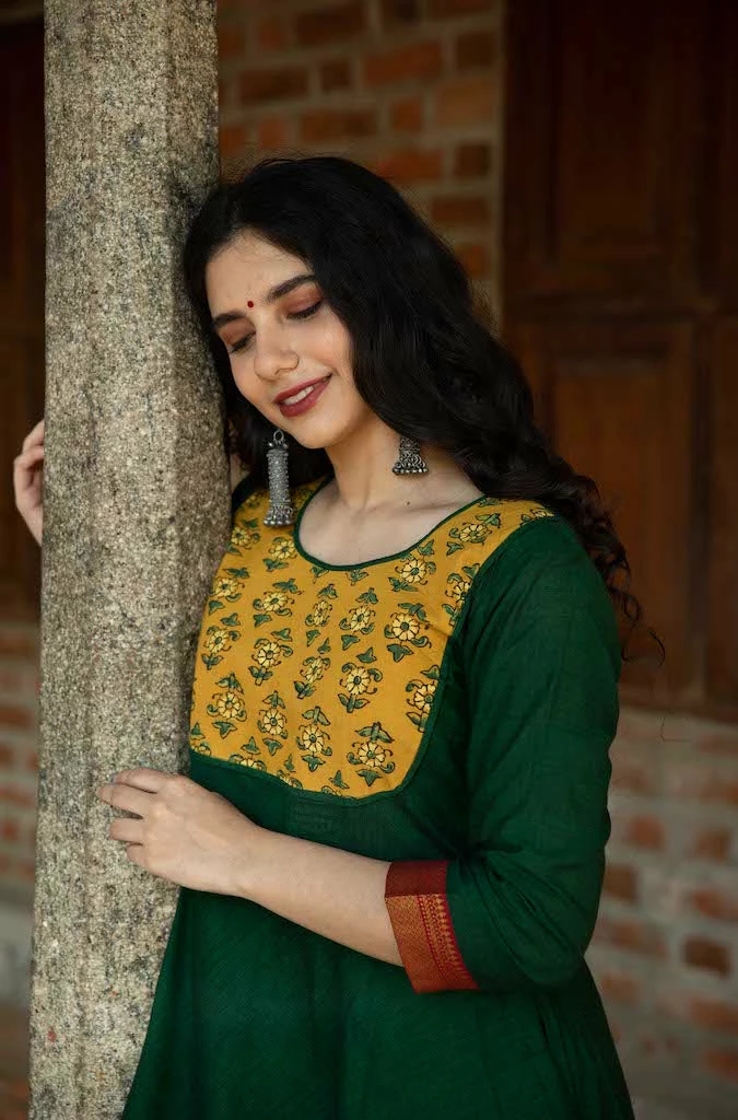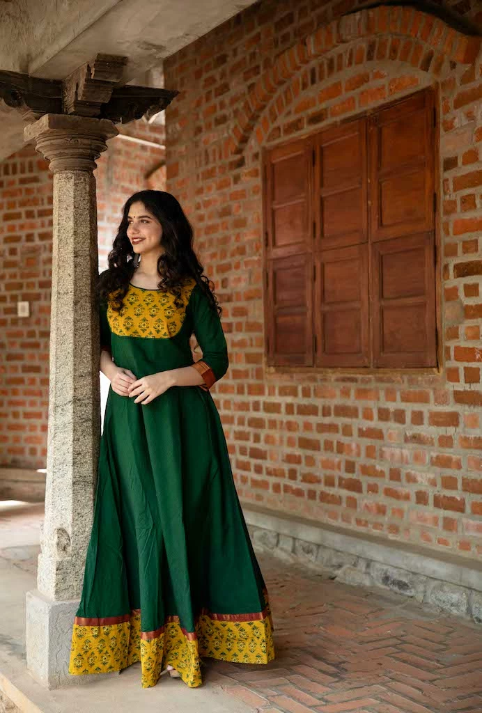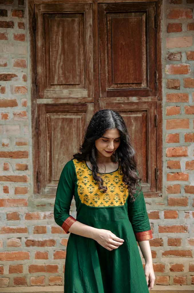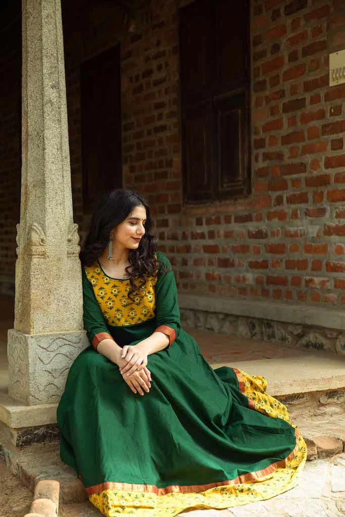 A pure kanchi cotton anarkali finished with naturally dyed ajrakh yoke and border. Sleeves are finished with zari borders. This is fully lined and comes with a back zipper.