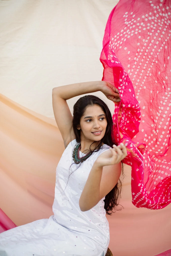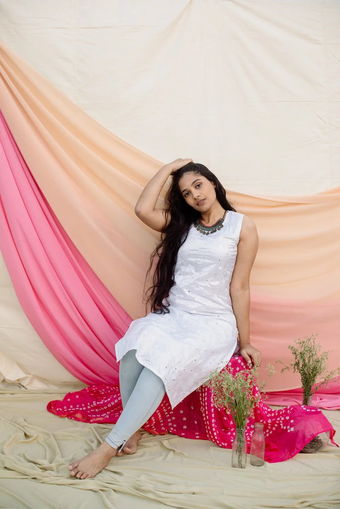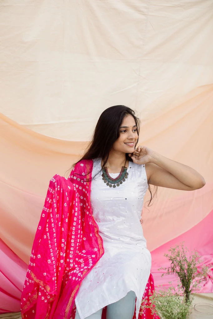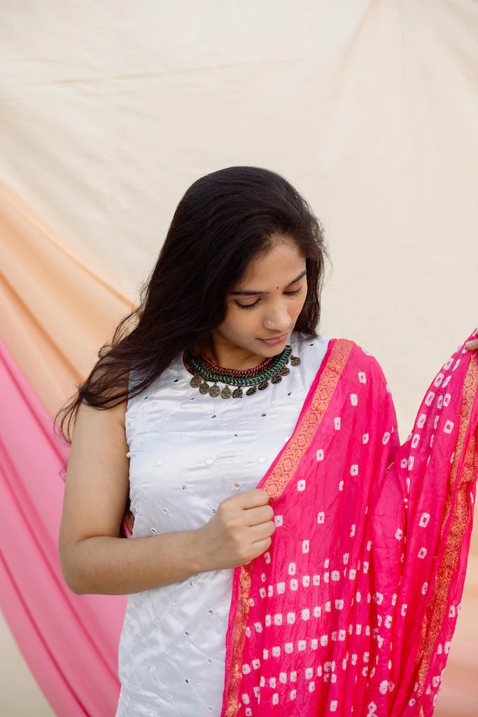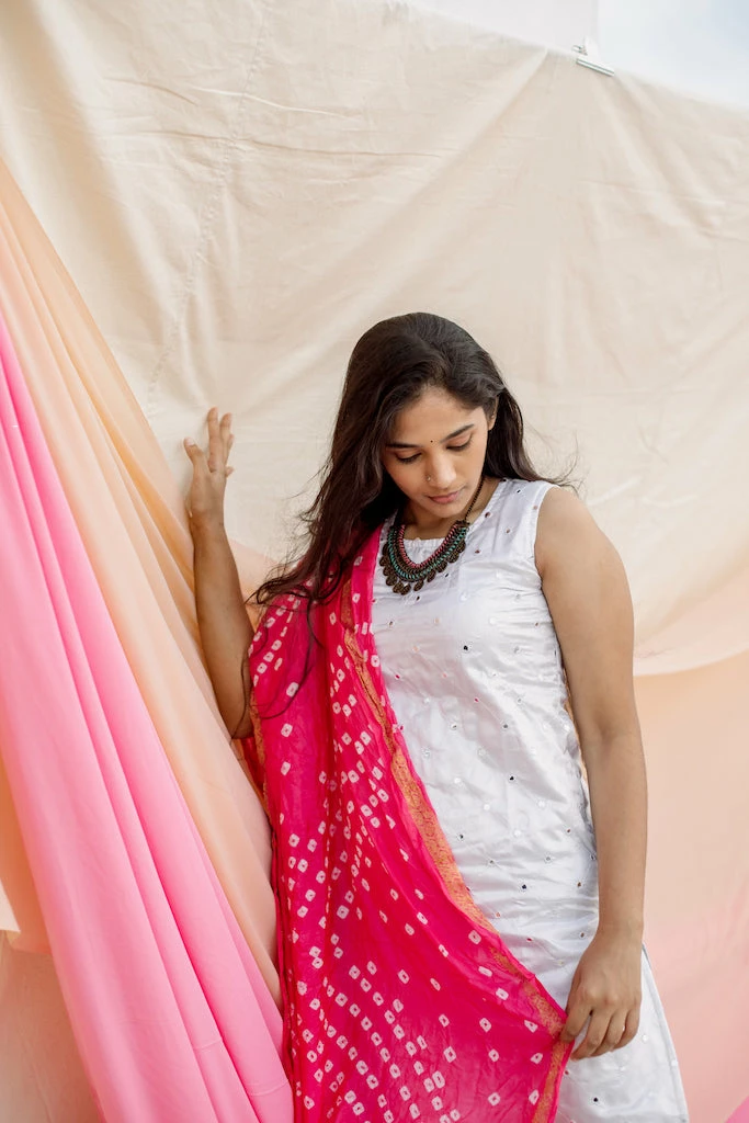 Two Piece Set. A white mirror work silk kurta matched with a pink bandhini semi silk duppatta.
