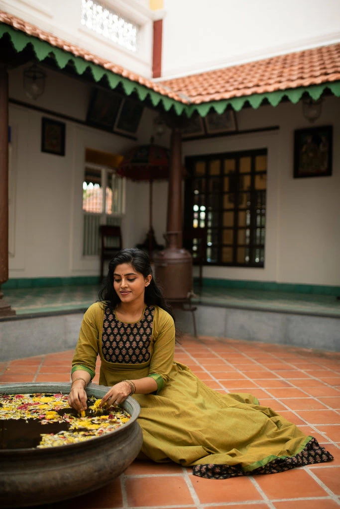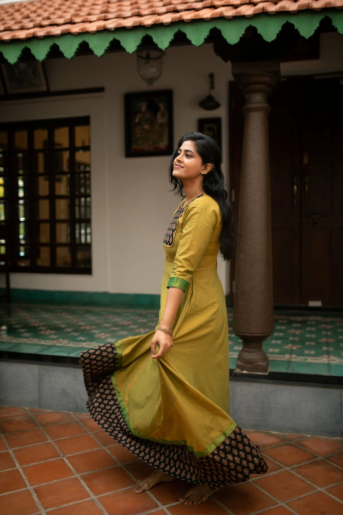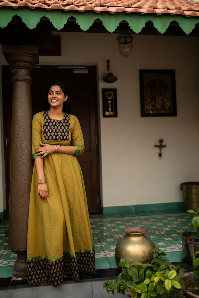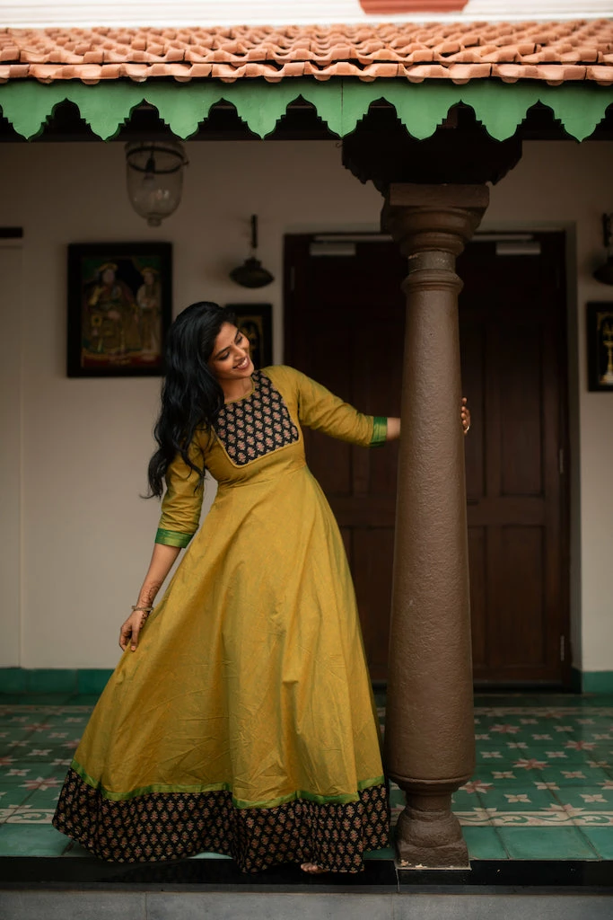 A kanchi cotton anarkali finished with ajrakh patch work and borders. This top is fully lined and does NOT come with pants or leggings. We suggest that you cross check your body measurements with our size chart. This will help you to choose the right size.