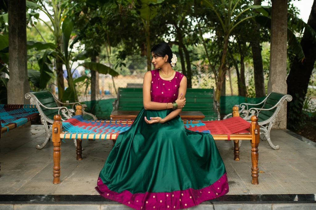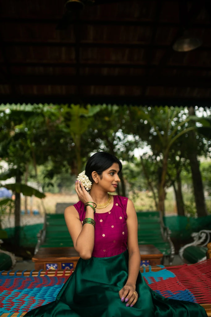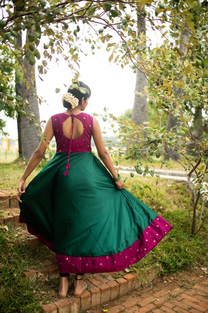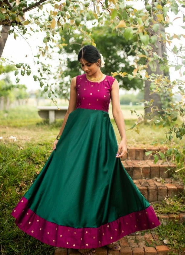 A green malai silk anarkali finished with dupion silk for yoke and borders. This top is fully lined and does NOT come with pants or leggings. We suggest that you cross check your body measurements with our size chart. This will help you to choose the right size.
