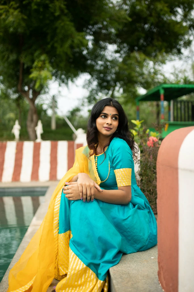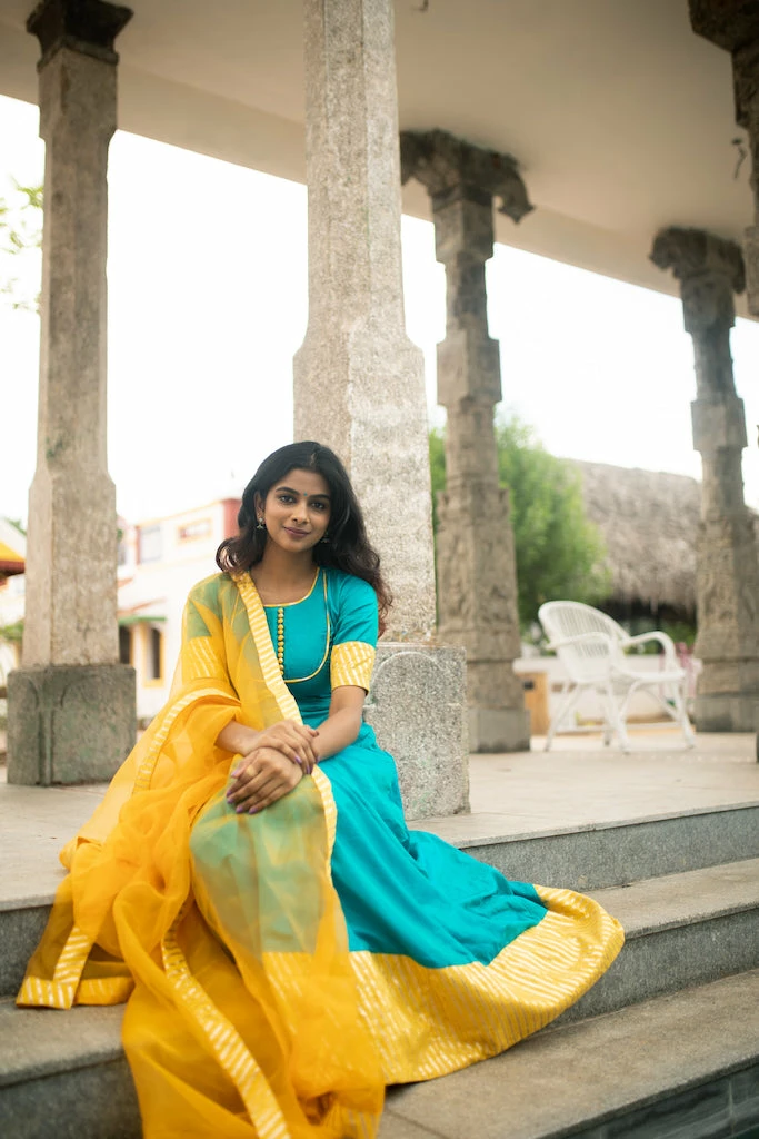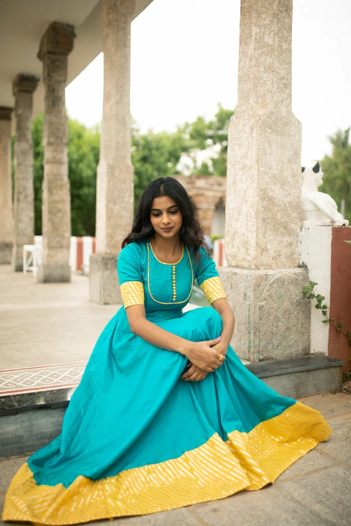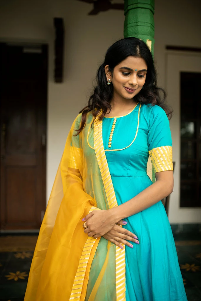 A dual-toned sana silk anarkali finished with chanderi silk borders is paired with an organza duppatta. This top is fully lined and does NOT come with pants or leggings.  We suggest that you cross check your body measurements with our size chart. This will help you to choose the right size.