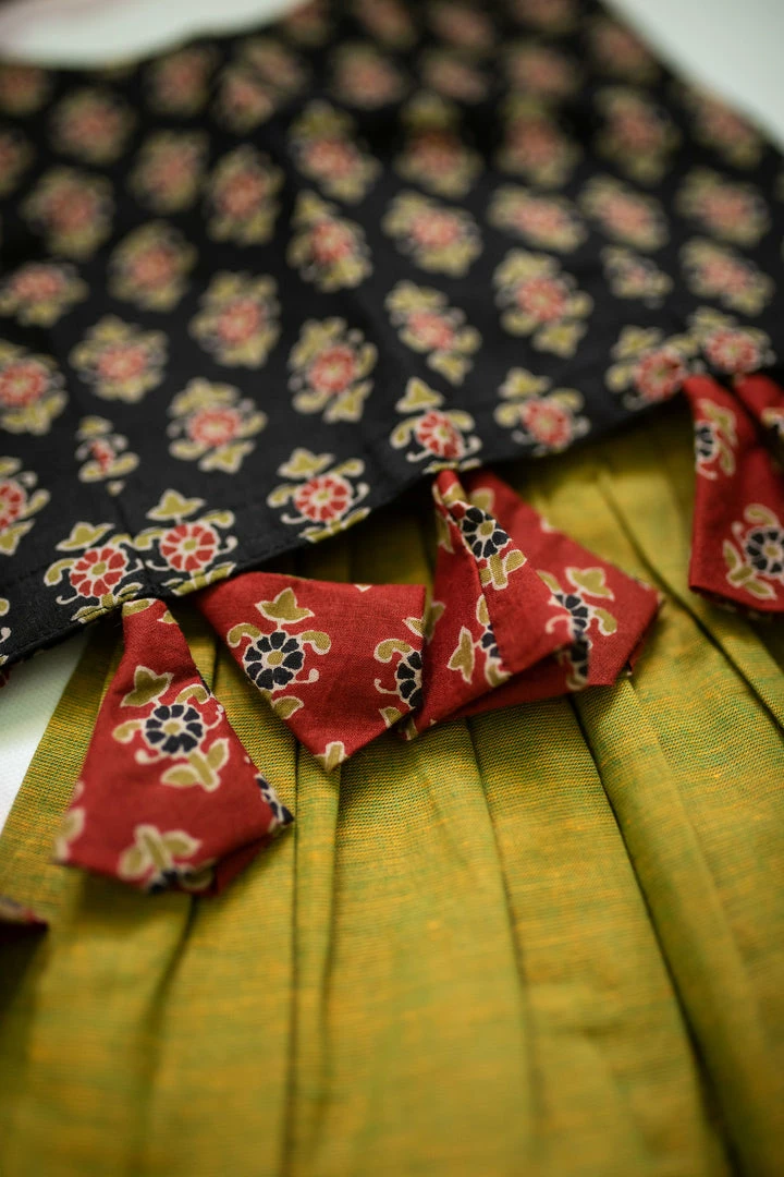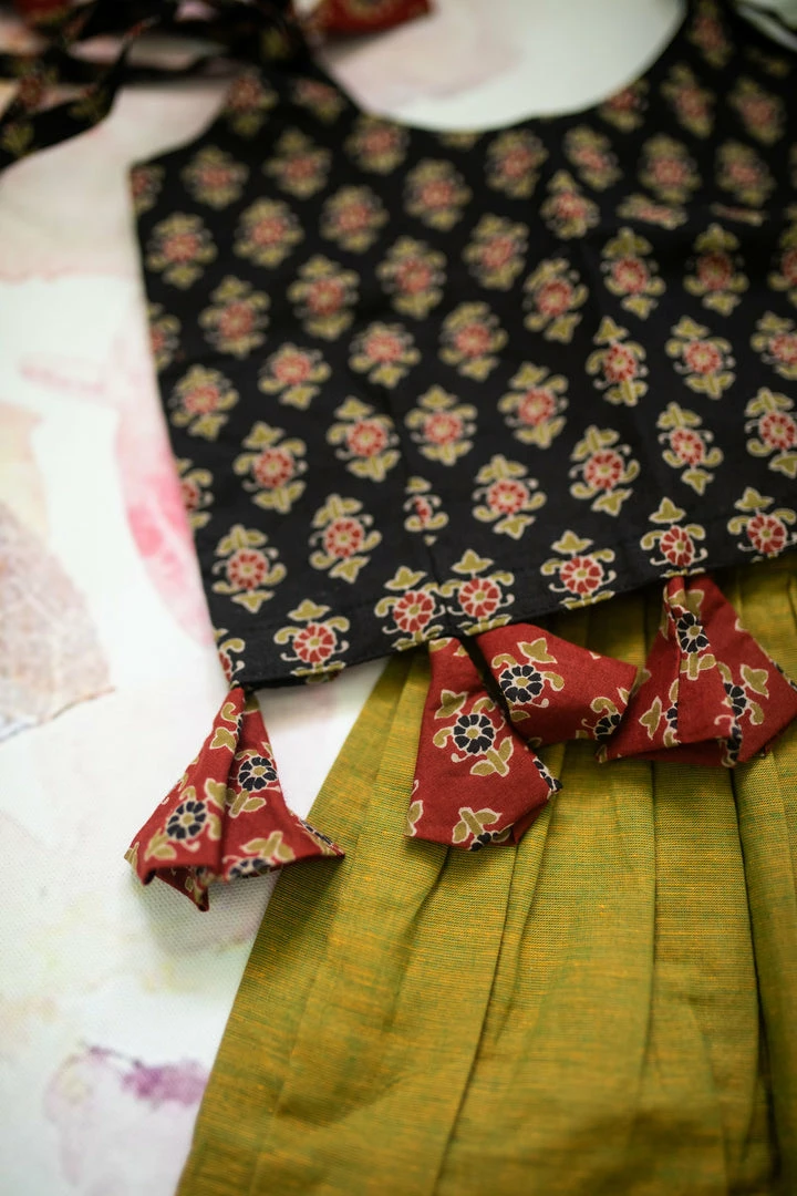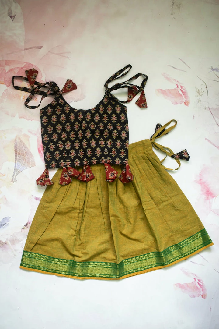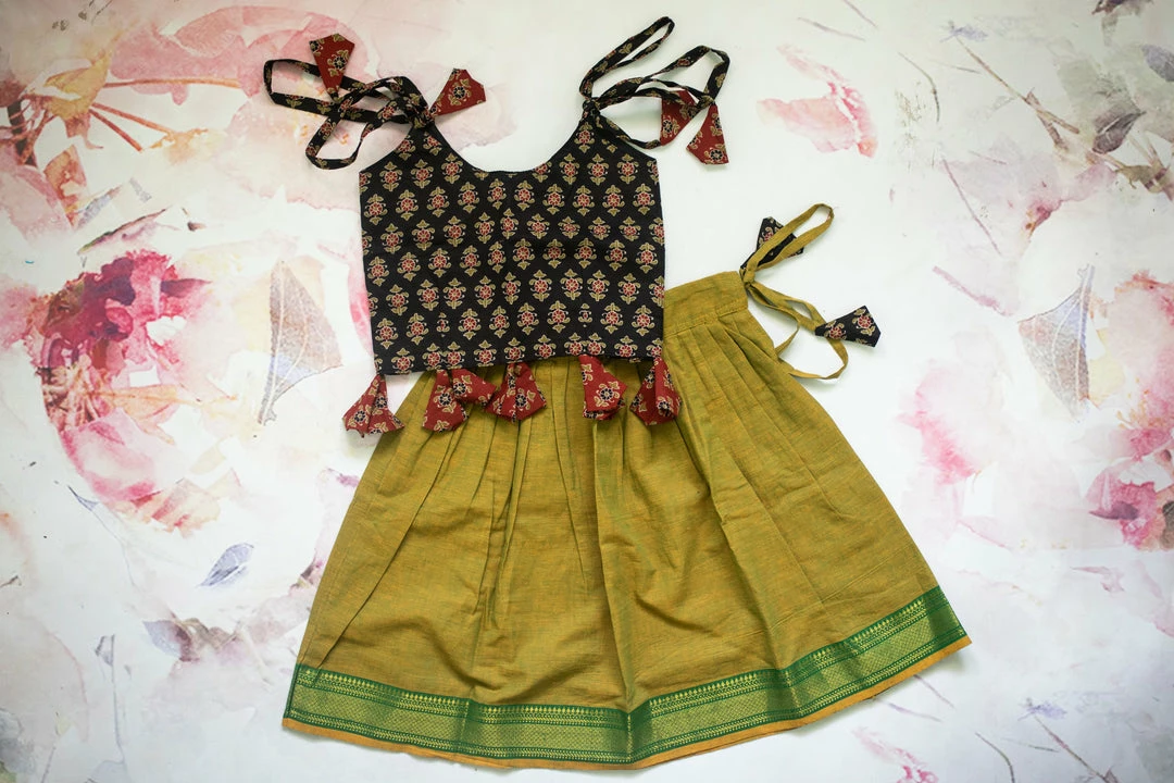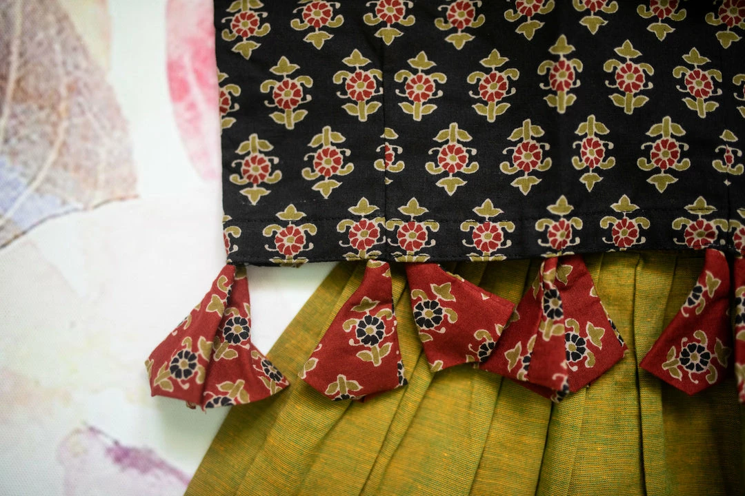 A pure kanchi cotton skirt paired with an ajrakh top finished with tassels. This is a full length skirt and this set is partially lined. We suggest that you cross check your body measurements with our size chart. This will help you to choose the right size.