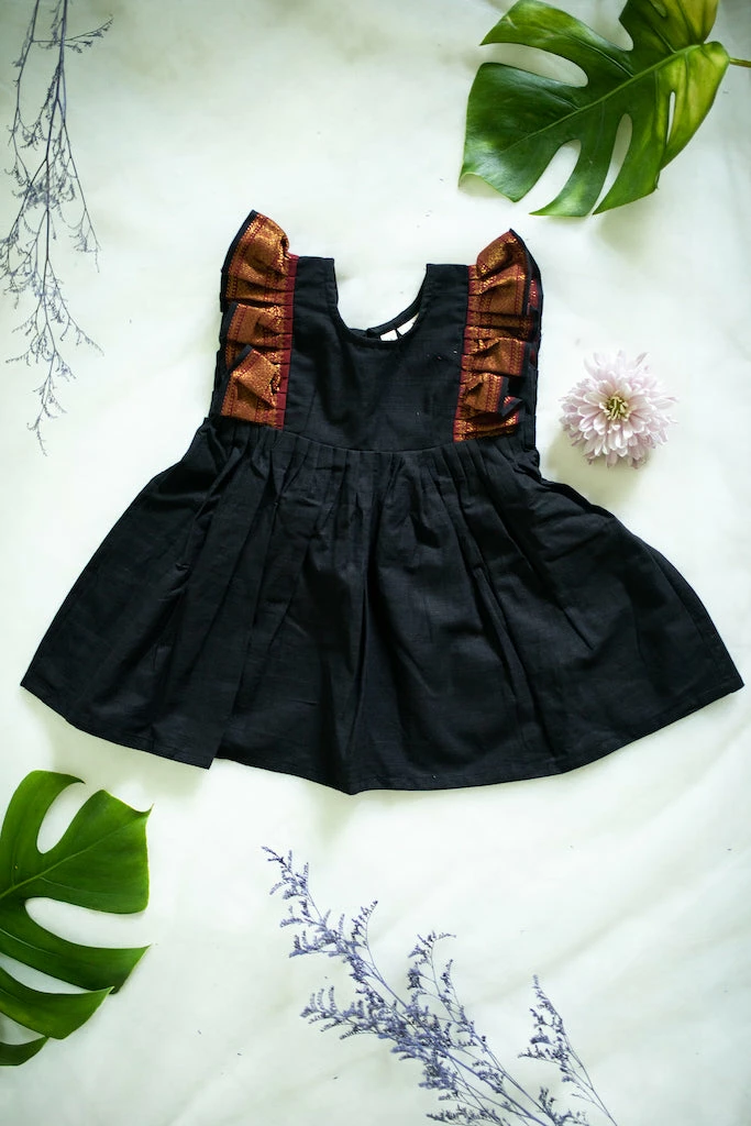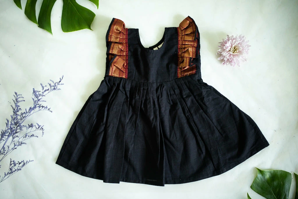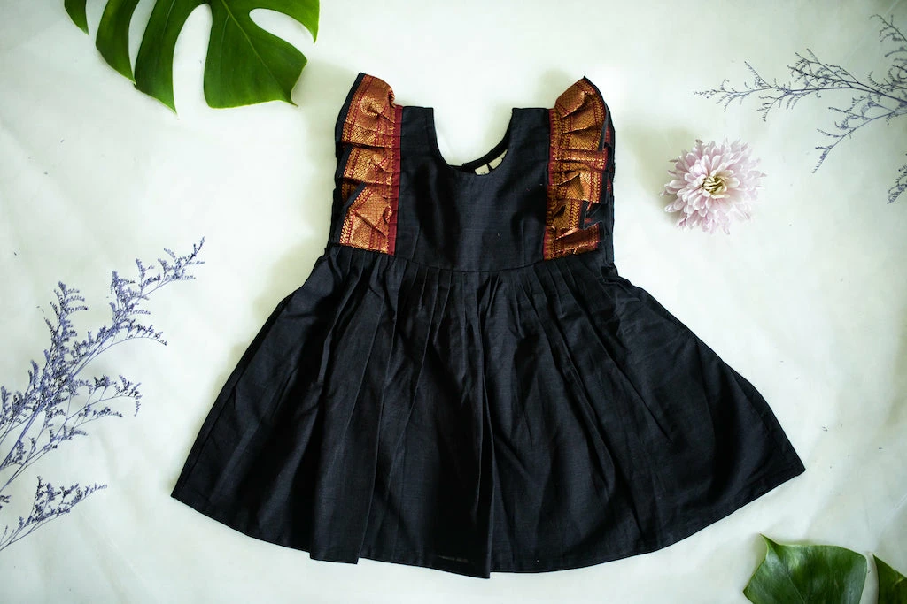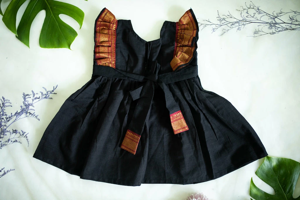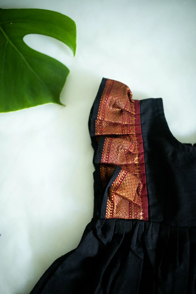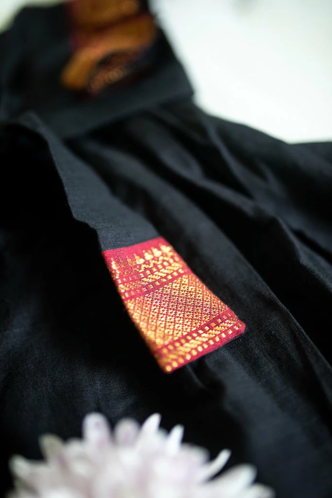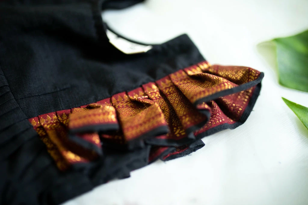 A pure handloom cotton top finished with angarkha style is paired with a pure kanchi cotton full skirt.