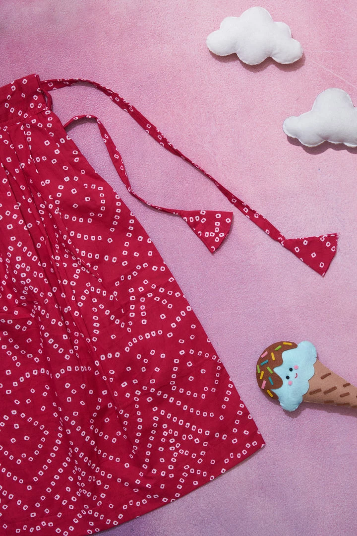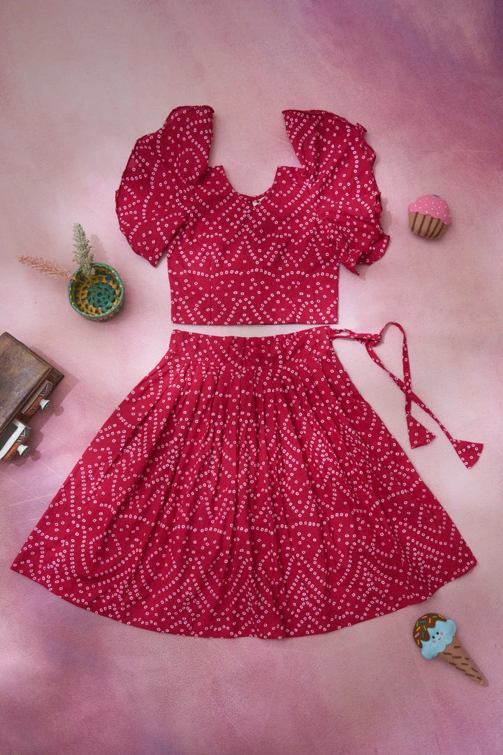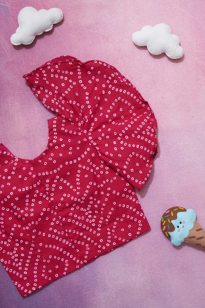 A pure cotton lehenga made with bandhini fabrics perfect for Indian occassions. This lehenga is finished with butterfly sleeves.