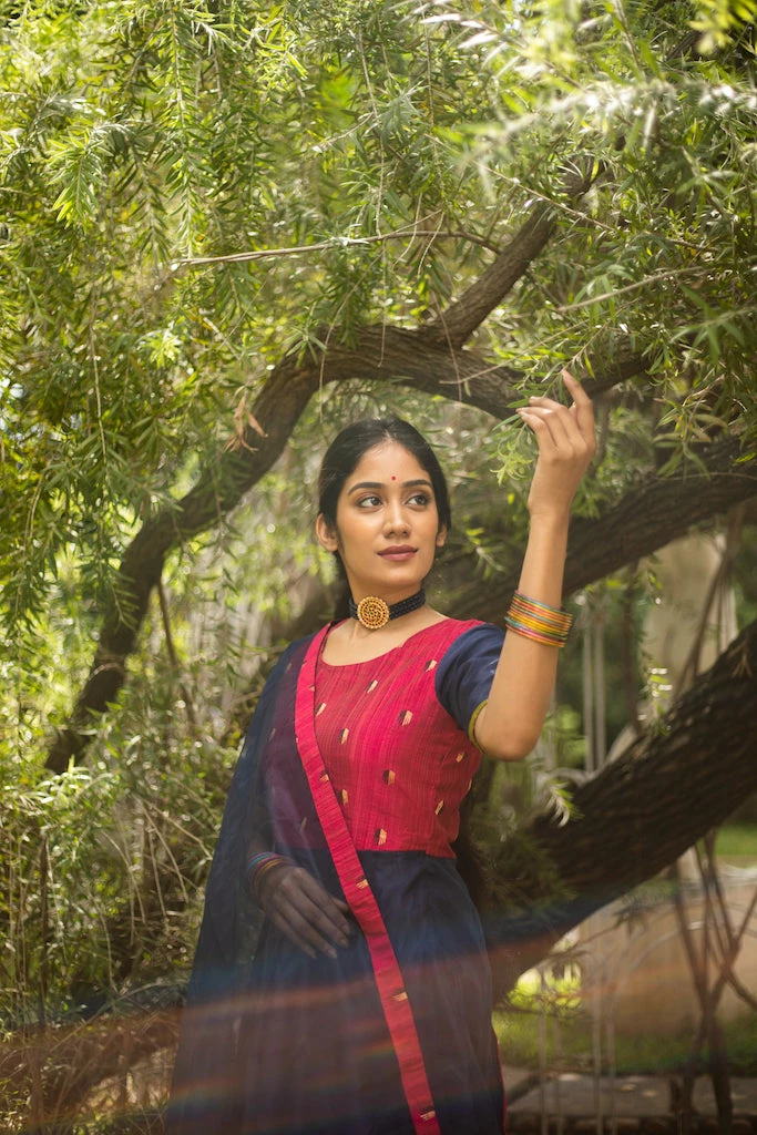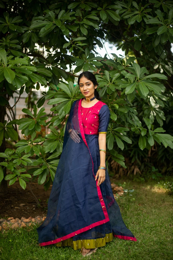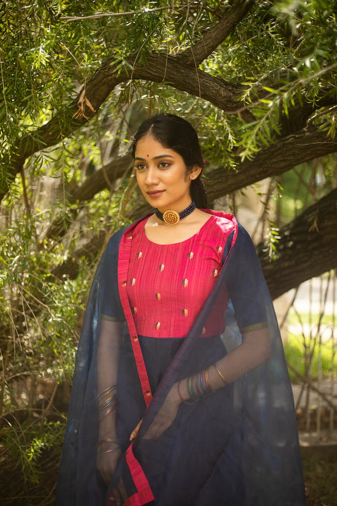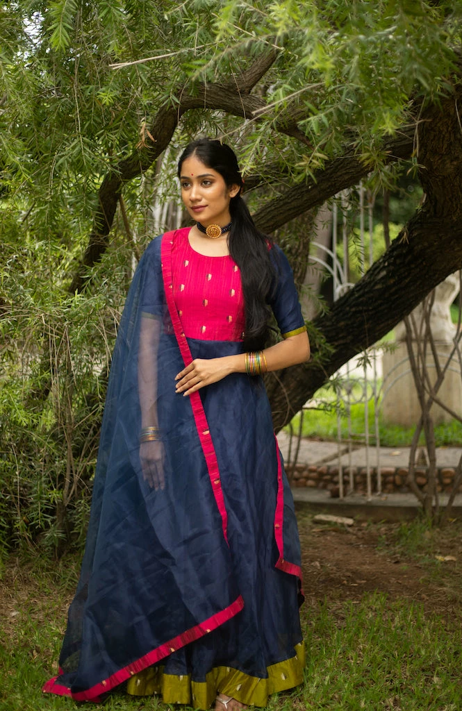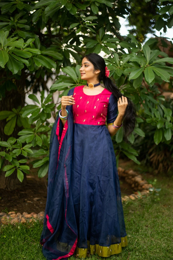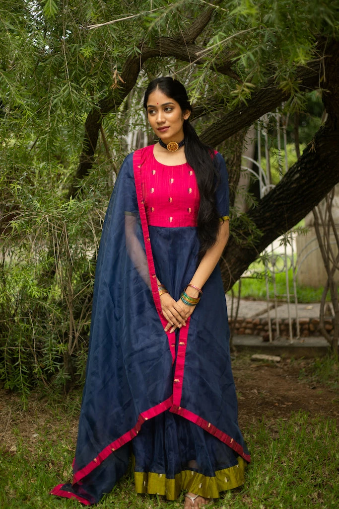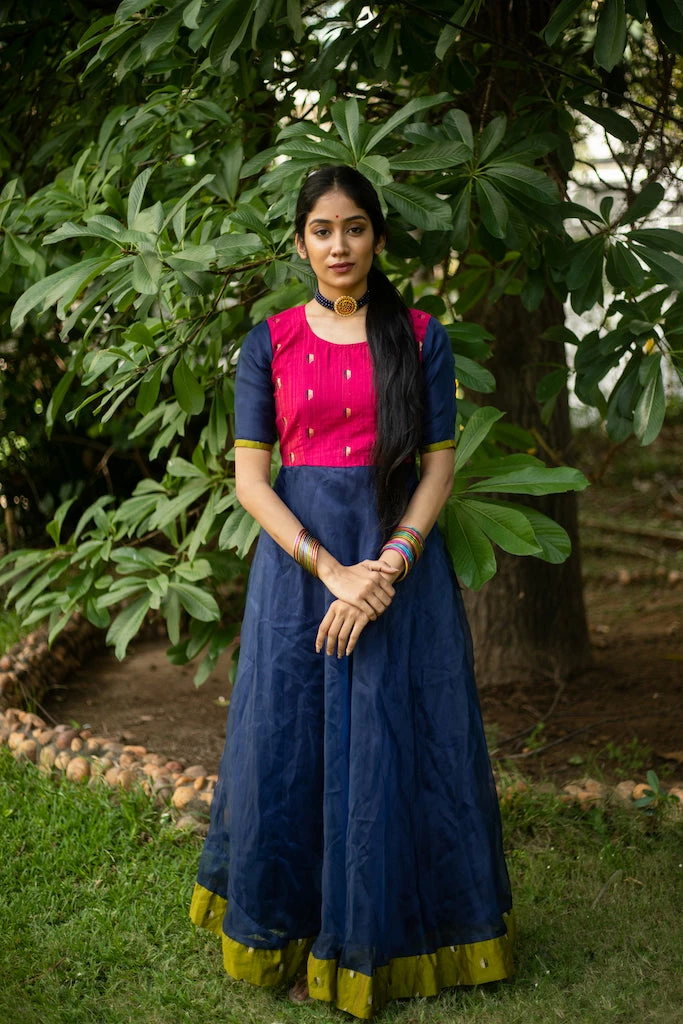 An anarkali made with organza and kota rayon is paired with an organza duppatta. This anarkali is fully lined and does NOT come with pants or leggings. Please scroll down and check the tab “size guide” before selecting your size from the variants. We suggest that you cross check your body measurements with our size chart. This will help you to choose the right size.
